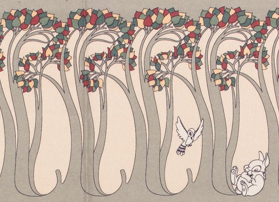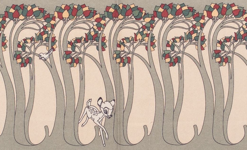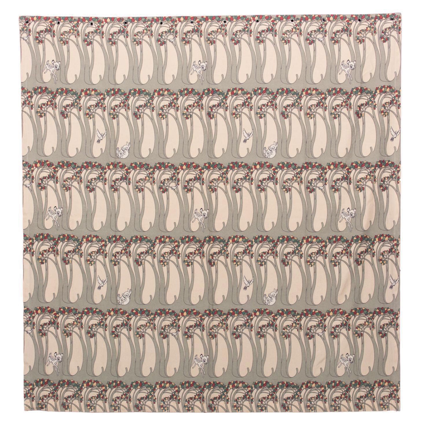 (Grand Californian, 2000s) A Bambi-themed show curtain produced for a Grand Californian Hotel guest room. Bambi and Thumper are shown frolicking through the forest, enhanced by the four-tone palette of the Grand Californian Hotel Resort. Measuring 70"x70", the shower curtain exhibits some fading, as well as some surface and edge wear from use.