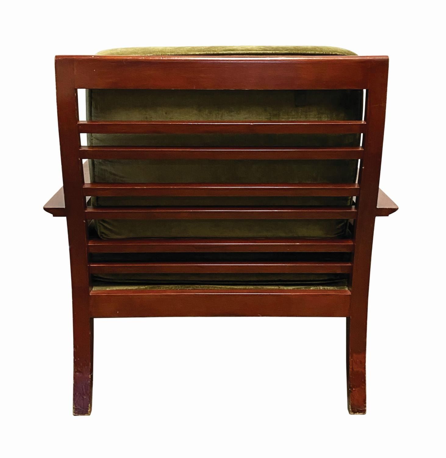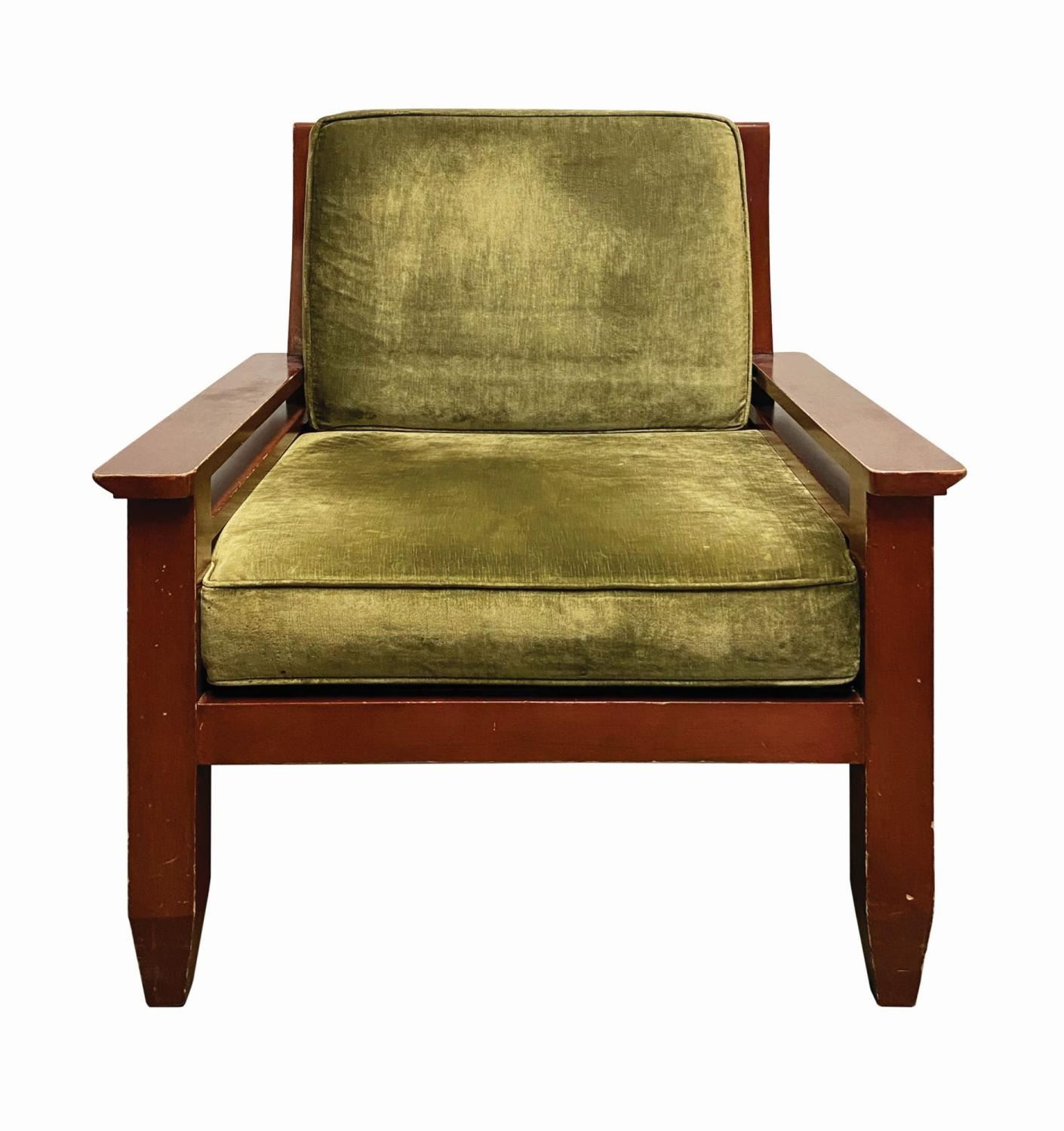 (Grand Californian, 2010s) An original lounge chair from Disney's Grand Californian Hotel. The chair beautifully captures the American Craftsman style that embodies this hotel and was used in one of the lounge areas for several years before its removal. Composed of a wooden frame, the large chair includes its original removeable cushions and measures 36.5"x34.5 and 32" deep. It is in good used condition. As expected for a piece of used hotel decor, the chair has various nicks, scuffs, small stains, and general wear throughout, but still presents very nicely. This item may require special shipping arrangements, please inquire for details and estimates.
