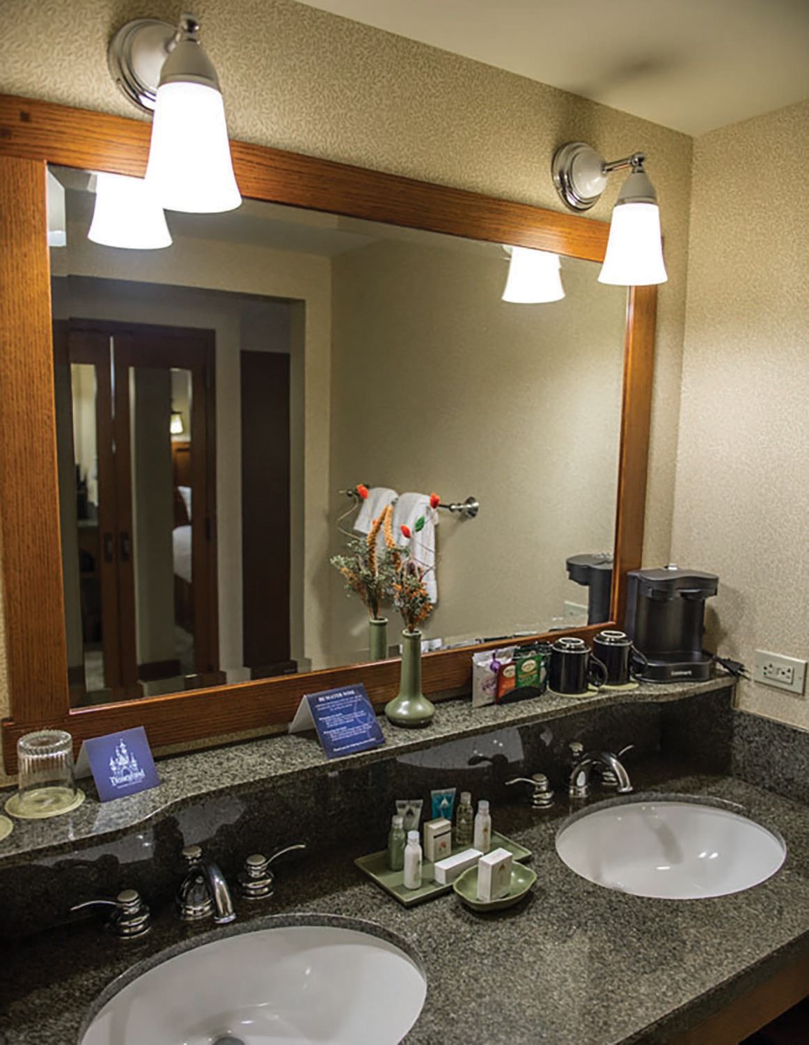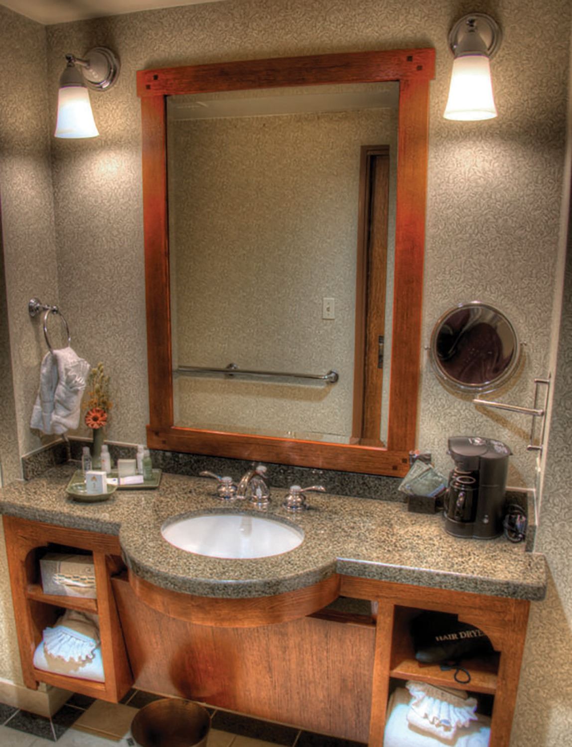 (Grand Californian, 2010s) A large vanity mirror from a guest room at Disney's Grand Californian Hotel. The sturdy wood frame with beveled glass beautifully captures the American Craftsman style that embodies this Hotel, and is an excellent functional artifact from the Disneyland Resort. Measuring an impressive 51"x35", the mirror can be displayed vertically or horizontally, and is in very good Hotel-used condition, with some nicks, scratches, and wear to the wooden frame from its use and removal. This item may require special shipping arrangements, please inquire for details and estimates.