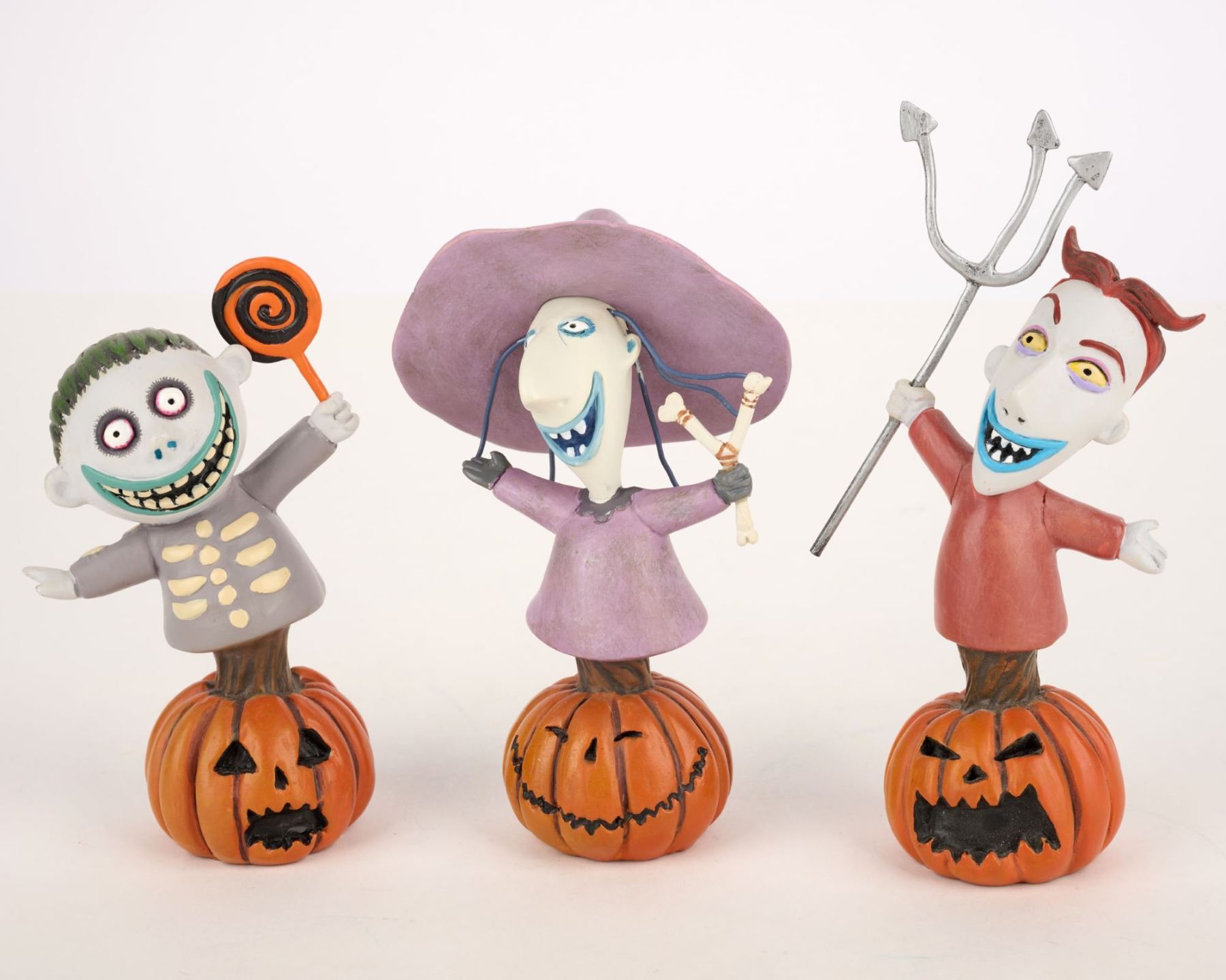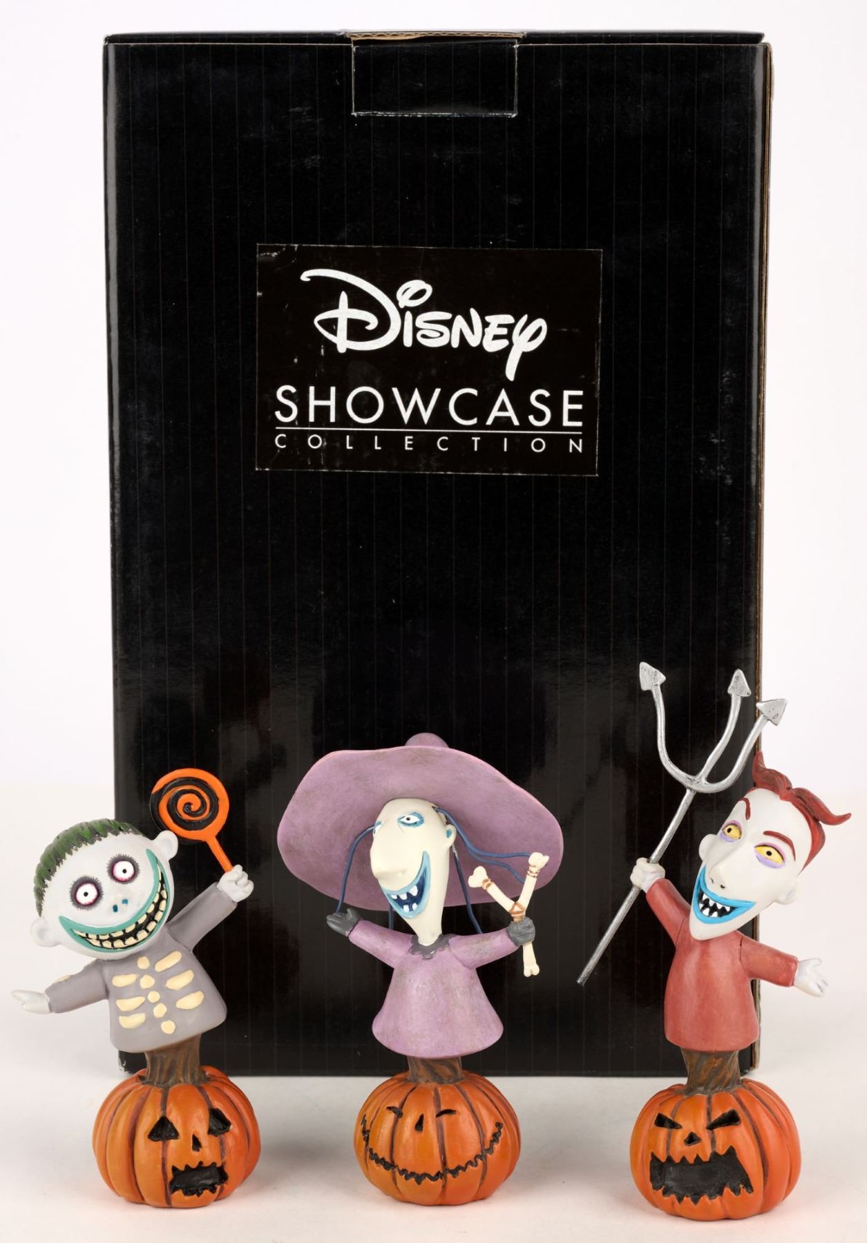(Enesco, 2015) A Grand Jester Studios bust figurine set of Lock, Shock, and Barrel from “Tim Burton’s The Nightmare Before Christmas." Lock measures 2.25" x 1.5" x 5", Shock 2.5" x 3.5" x 4.25", and Barrel 2.25" x 1.5" x 4". The stone resin figurines are in fine condition and come with the original 6.5" x 3.5" and 10.5" tall box.