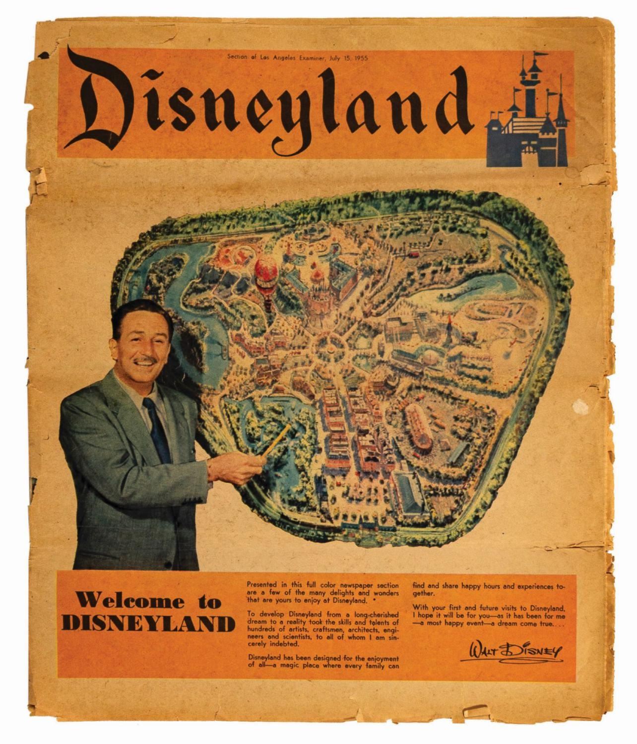 (Disneyland, 1955) A gorgeous 20-page newspaper supplement which was issued by the Los Angeles Times just two days before the Grand Opening of Disneyland in order to promote the new park. Contained inside are beautiful concept illustrations that depict some of the lands and attractions that guests would soon be able to enjoy. The supplement measures approximately 10.75"x13.25" and is in fair condition with tearing along the right edge and the spine, as well as discoloration from age throughout. The paper is very delicate.