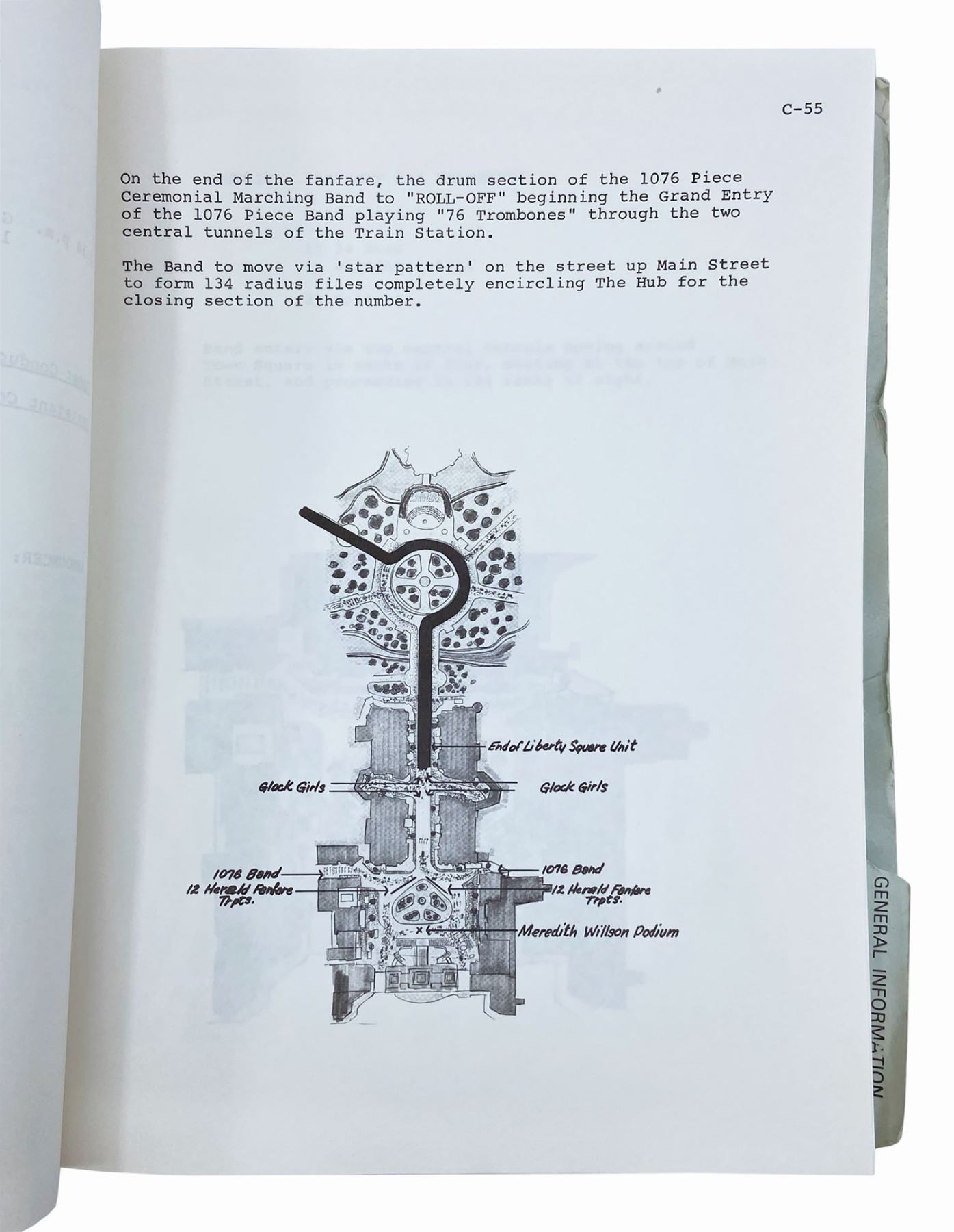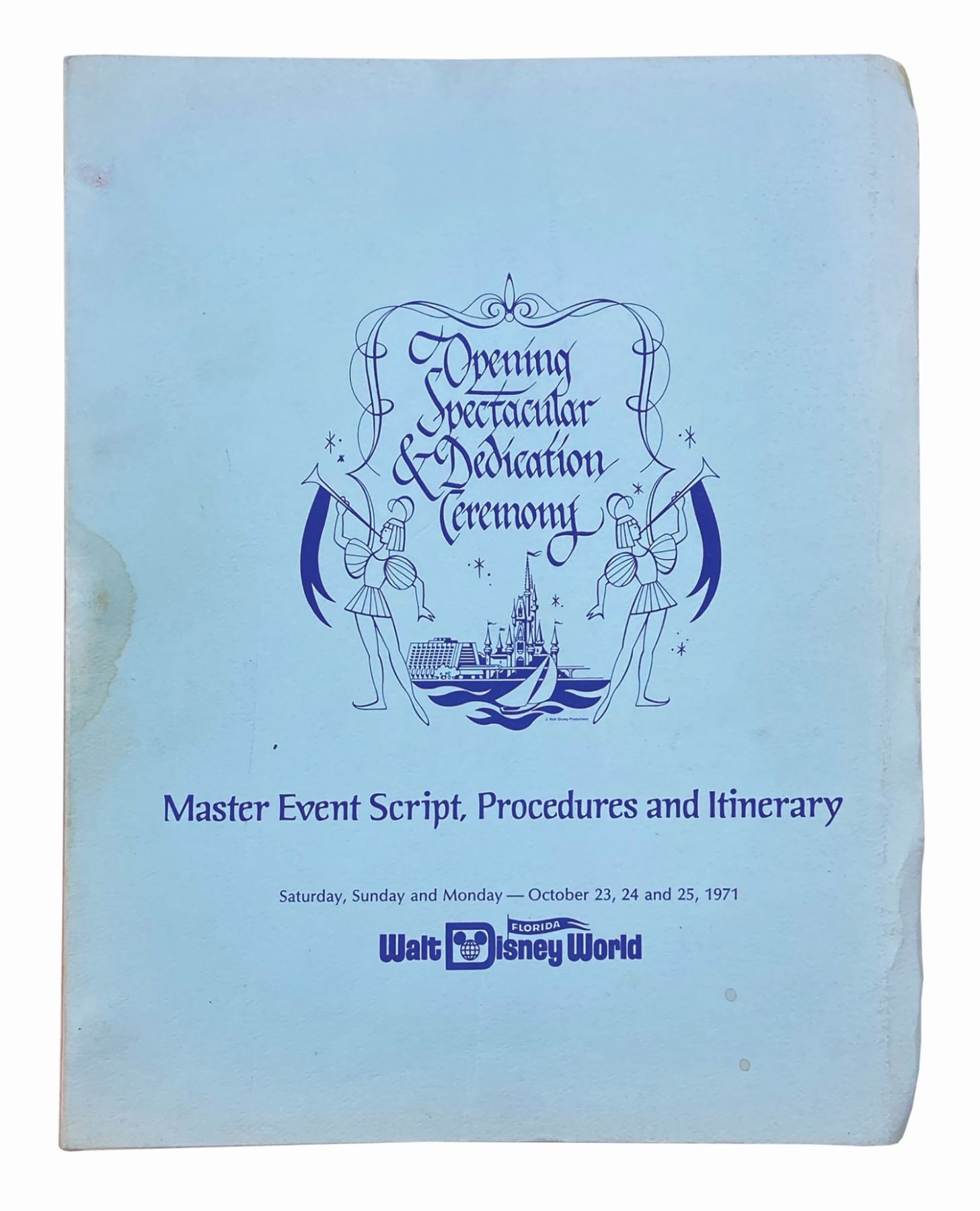 (Walt Disney World, 1971) A master event script including the procedures and itinerary for the Walt Disney World Opening Spectacular and Dedication Ceremony on October 23, 24, and 25 of 1971. This detailed guide is tabbed for each day and includes a breakdown of scripts, events, and travel plans for those involved in the celebration. Incorporating concept drawings, costume designs, and diagrams, the material provides a visual refence and stylebook for the proceedings. This master event script offers a scarcely seen look into the backstage experience of Walt Disney World's grand opening. Measuring 11"x9", the script is in very good condition with wear to cover, including a spot of damp staining, bending to cover edges, and small edge tears. The content is clean.