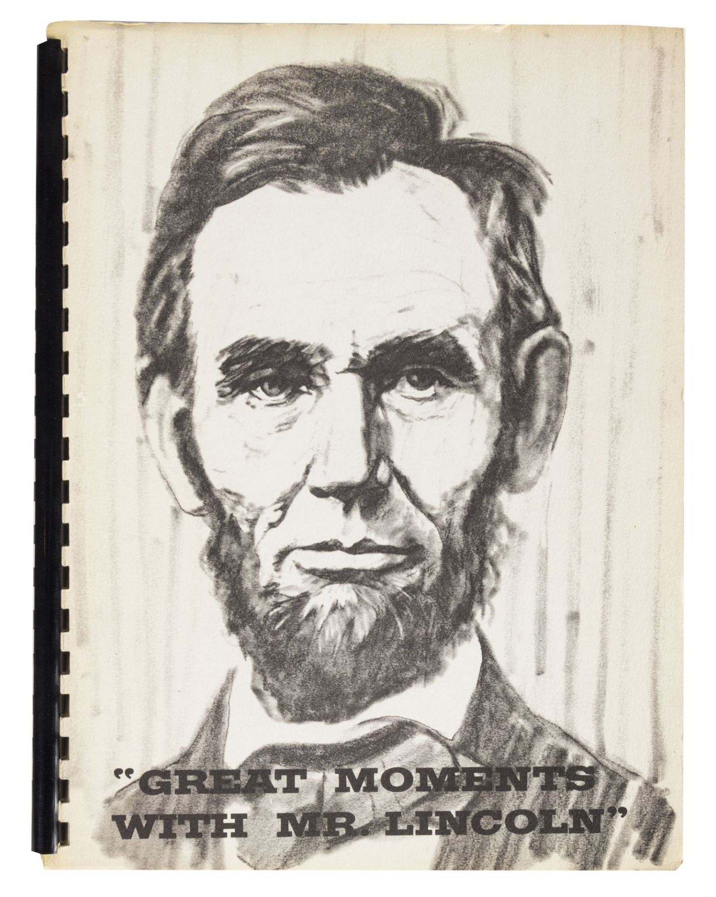 (Disneyland, 1965) An extremely rare employee manual created for cast members working the premiere season of the Great Moments with Mr. Lincoln attraction. The spiral-bound book, created by the University of Disneyland, outlines what is expected of cast members working this new attraction, as they would likely be asked many questions about both Lincoln and Disneyland. This 22-page manual measures approximately 11"x9" and is in very good condition with minor wear from use.