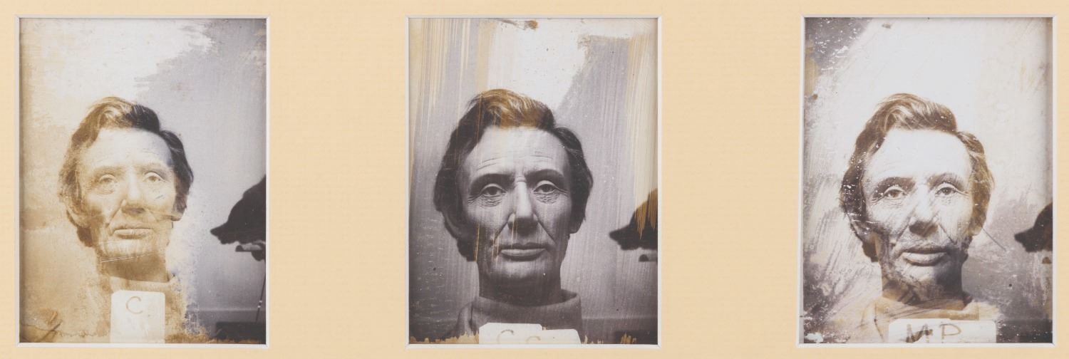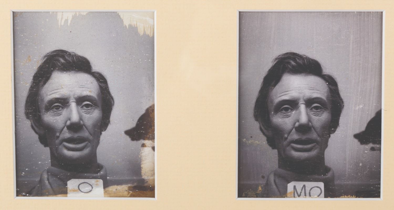 (WDI, 1960s) A framed collection of seven black and white reference photos used during the development of Great Moments with Mr. Lincoln. The groundbreaking show made its debut at the World’s Fair in 1964 before moving to Disneyland, where it continued to amaze audiences on Main Street, U.S.A. The photos are in 2.75" x 3.75" visible openings of a 16.25" x 23.25" framed matte, in poor to good condition with heavy toning, scratches, image loss, wear, and discoloration from age. The frame displays in good condition with multiple cracks at the bottom right and light wear.