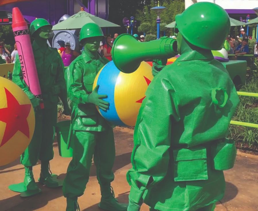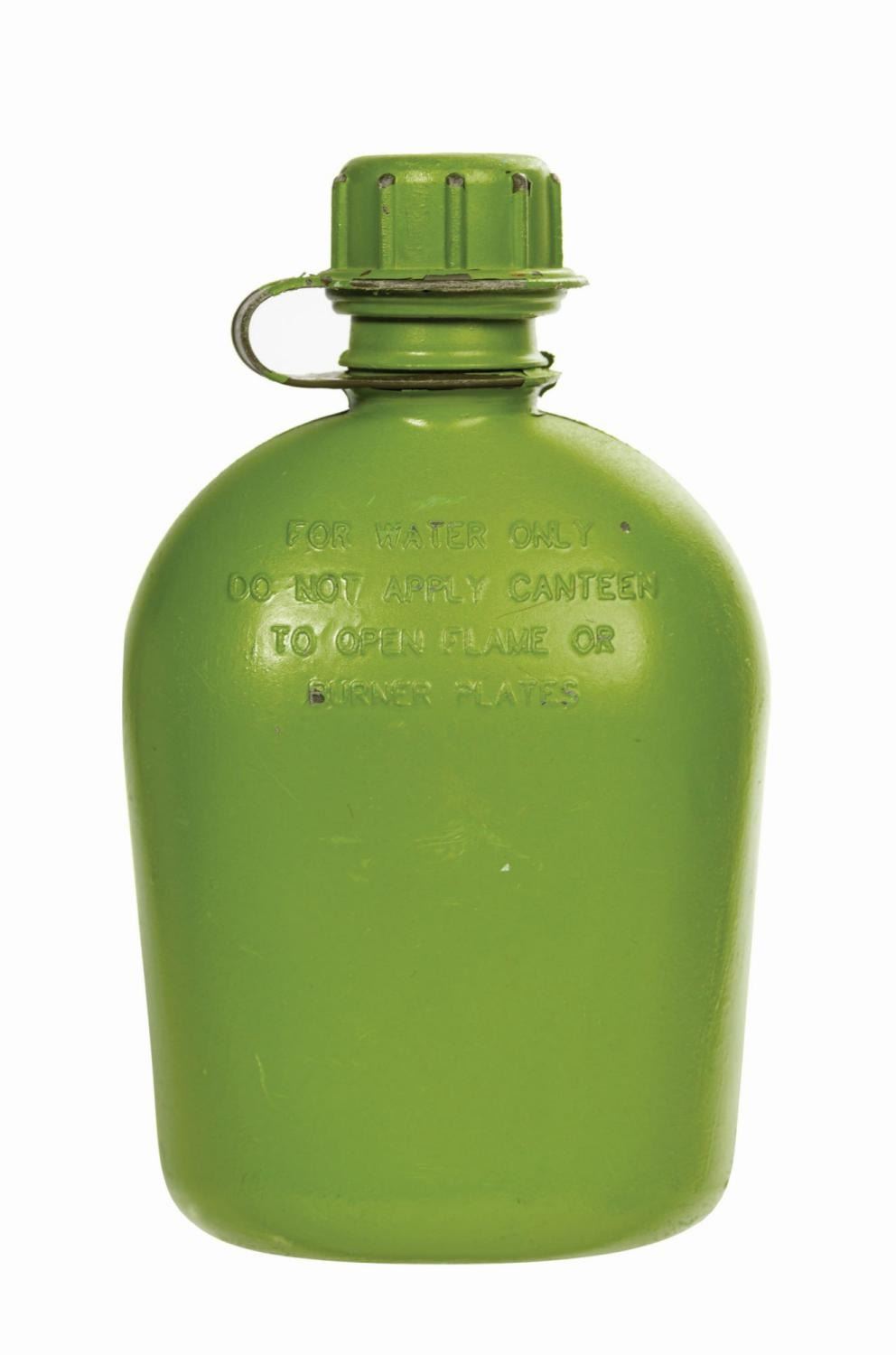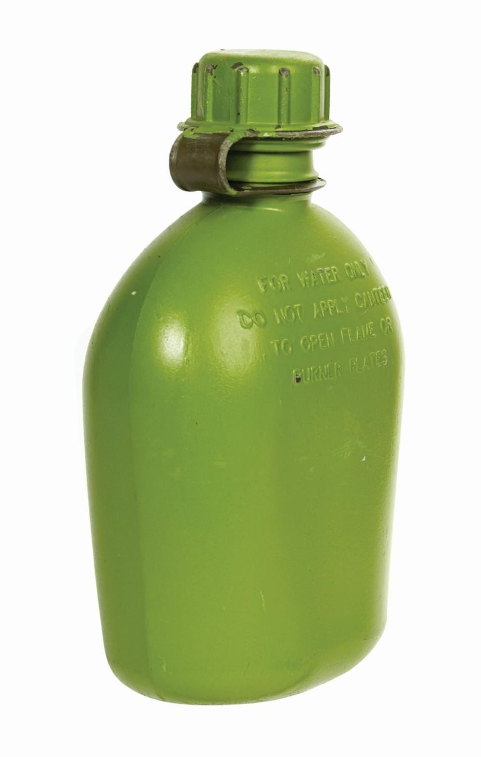 (California Adventure, 2000s) A canteen prop used by a Toy Story Green Army Man walkaround character at Disney's California Adventure. The olive drab plastic canteen has been painted a brighter green to match the glossy, plastic-like appearance of the Green Army Men costumes. Measuring 8.25"x4.75" and 3" deep, the canteen is in good condition, with some surface wear and paint loss to the lid, neck, sides, and bottom.