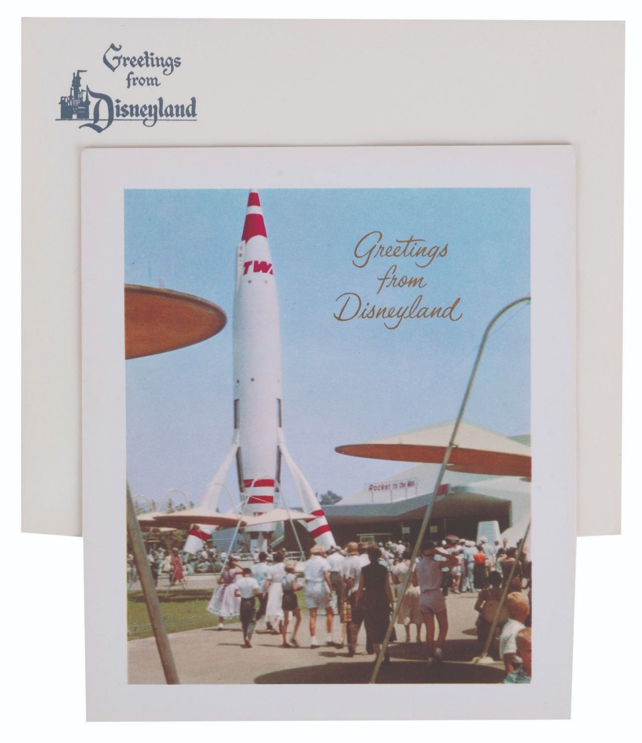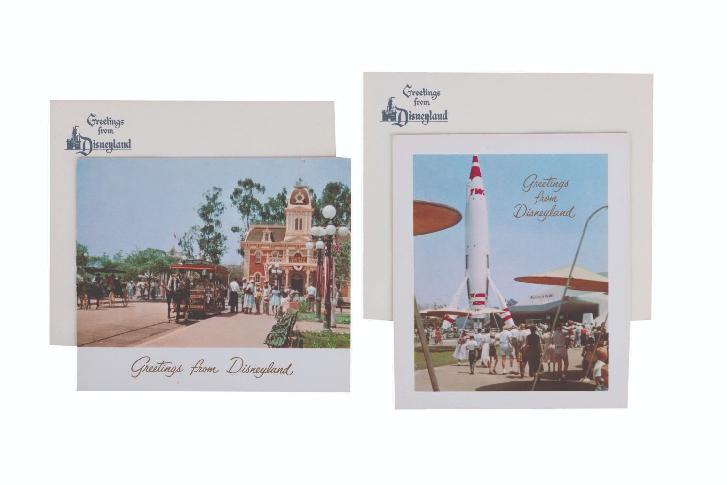 (Disneyland/Gibson, 1950s) A pair of Greetings from Disneyland cards with envelopes by Gibson, which had a card shop in Disneyland from 1955 to 1959. Measuring 5.5" x 6.5", the cards are in very good unused condition.