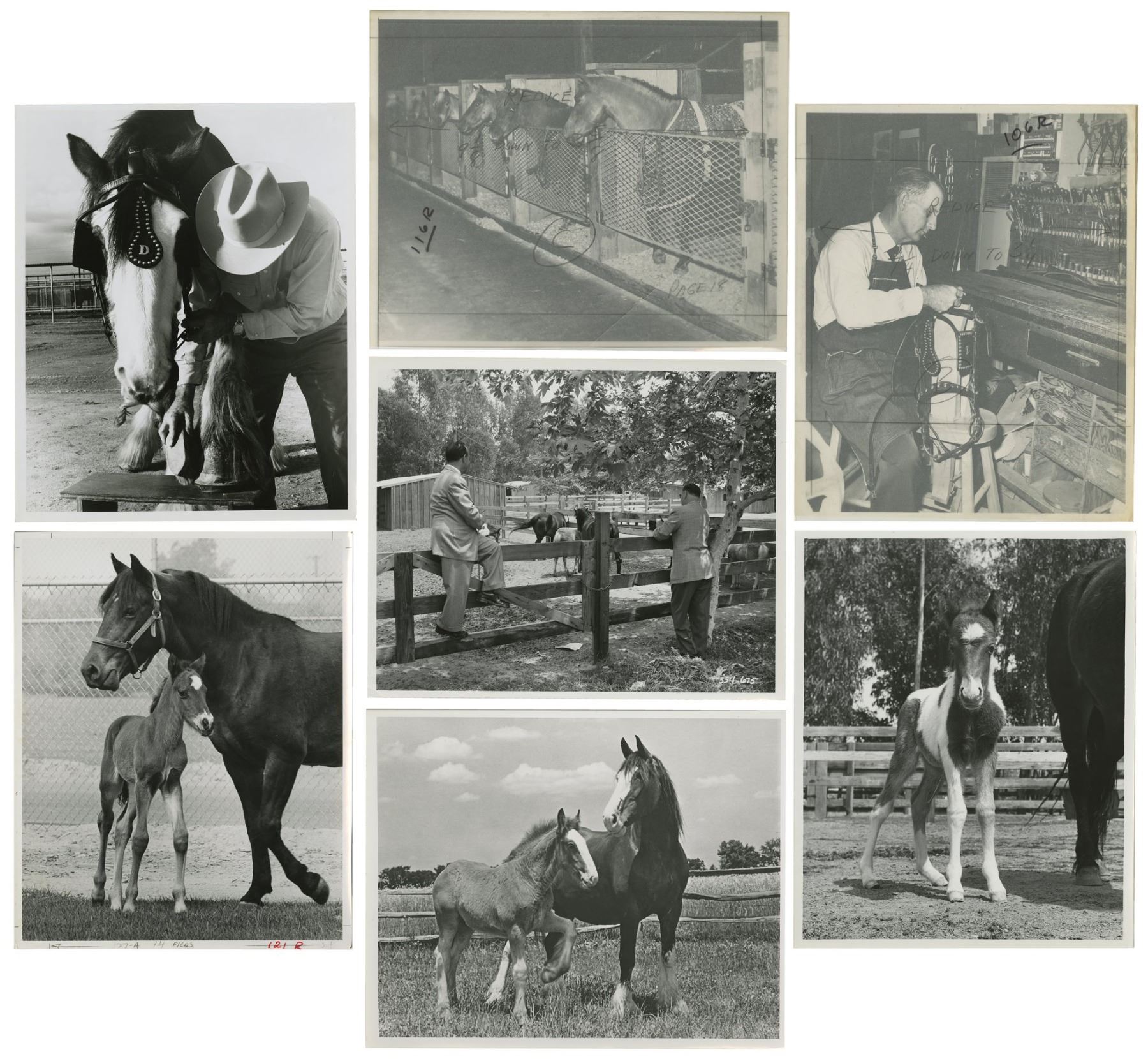 (Disneyland, c.1950s) A collection of (12) extremely rare original black-and-white photos from the Pony Farm at Disneyland. In 1950, Disney Legend Harper Goff saw Dolly and Owen Pope showing horses at the Pan Pacific Auditorium in Los Angeles and told Walt that he should meet them. The meeting was a success, and the Pony Farm was established, first at the Studio and then later at Disneyland. The Popes lived on the property and took care of Disney's menagerie of horses, donkeys, and mules. It was Pope that would design and build the leather tack used by horses in the park. Each of the photos measure 8â€x10â€, and the set is in very good condition. The photos come from the estate of Gary Fravel who helped design many of the publications used at Disney University, such as the park's training manuals. Two of the photos have vellum covers with notes and it is likely these photos were used for in various publications.