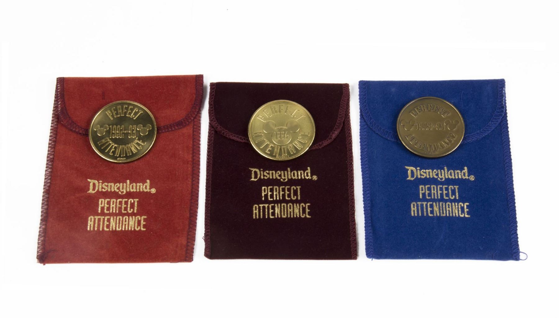 (Disneyland, 1992-94) A group of (3) cast member "Perfect Attendance" award commemorative coins in their original pouches. The coins feature various imagery of the White Rabbit from "Alice in Wonderland" on one side, with the words "Perfect Attendance" and the year specified on the other side. The coins are for the years 1992, 1993, and 1994, and each coin measures 1.5" in diameter. The condition is very good with minor wear.