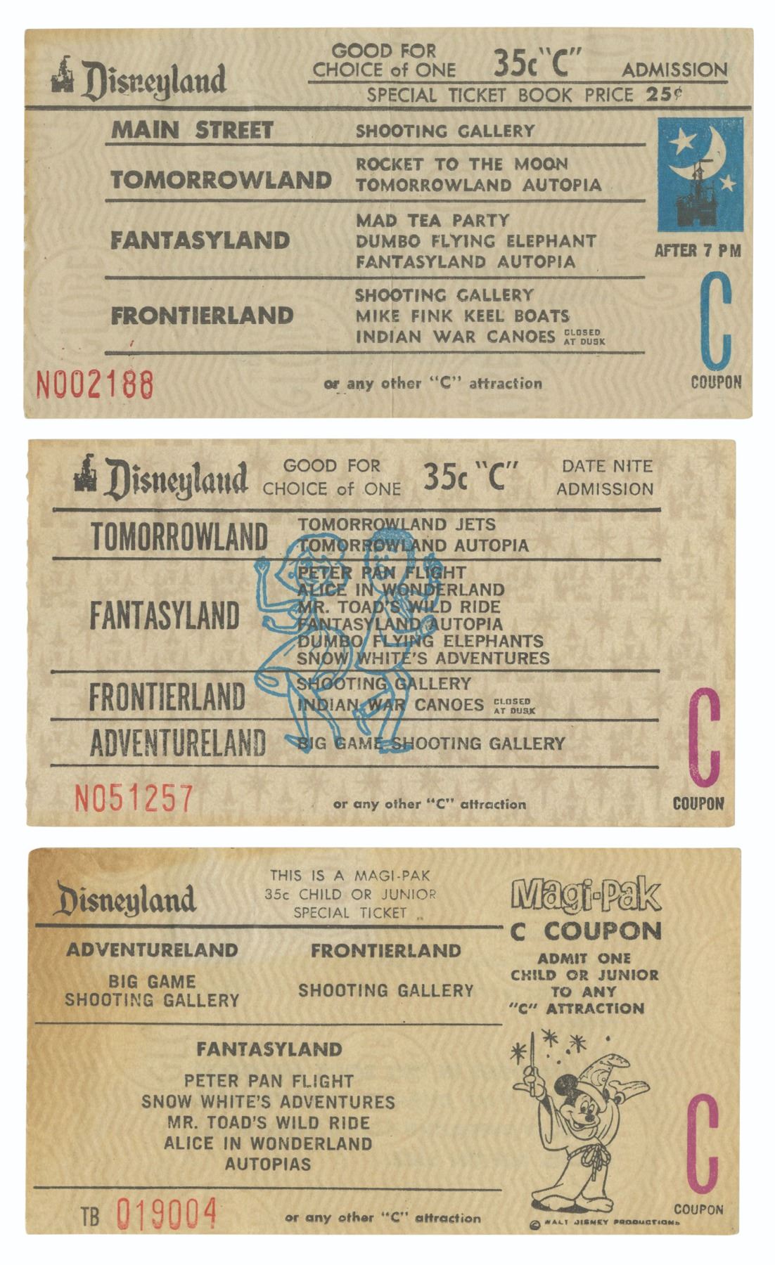 (Disneyland, c.1960s) A rare group of (3) early tickets from Disneyland's "C" attractions. These tickets include: one Magi-Pak child or junior special ticket for Fantasyland attractions and the shooting galleries; one Date Nite admission; and one ticket “good only after 7pm.†Each ticket measures approximately 2.5"x4.75" and the set is in good condition overall, with varying amounts of wear to each ticket due to age and use.