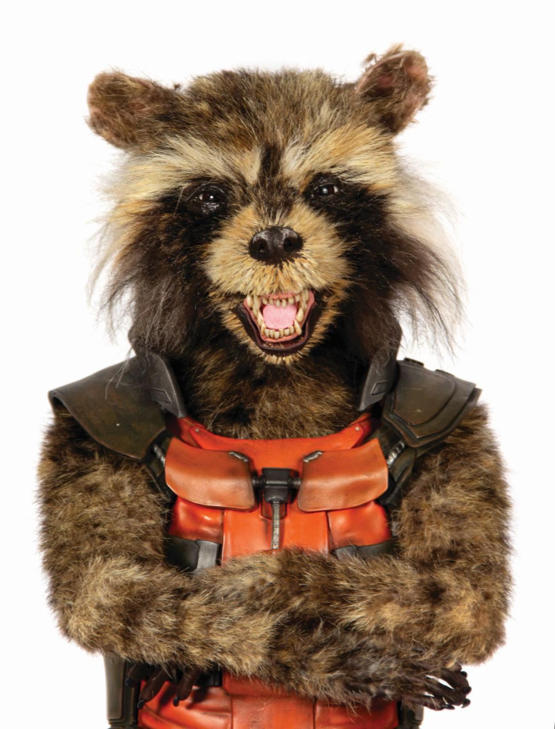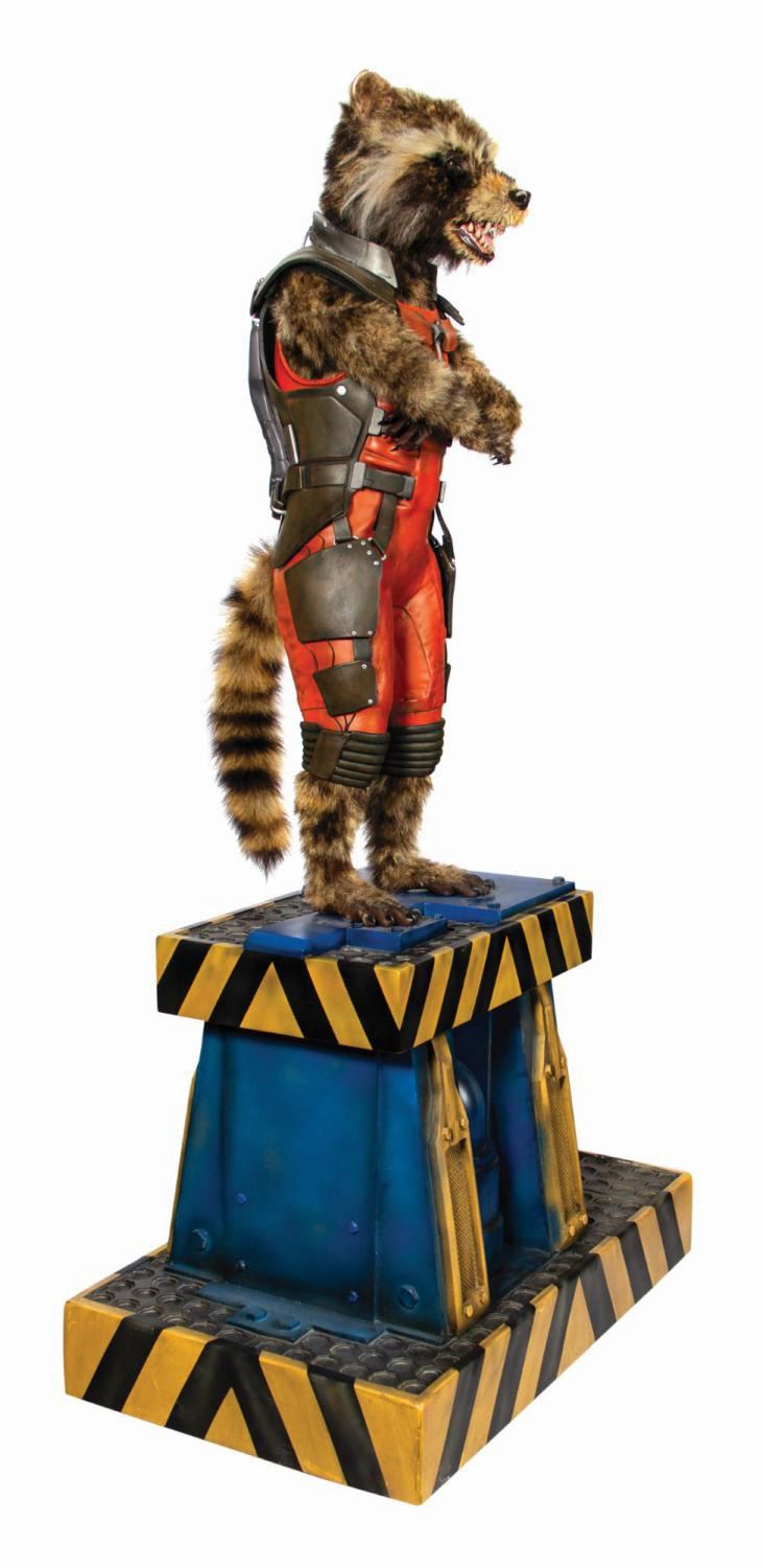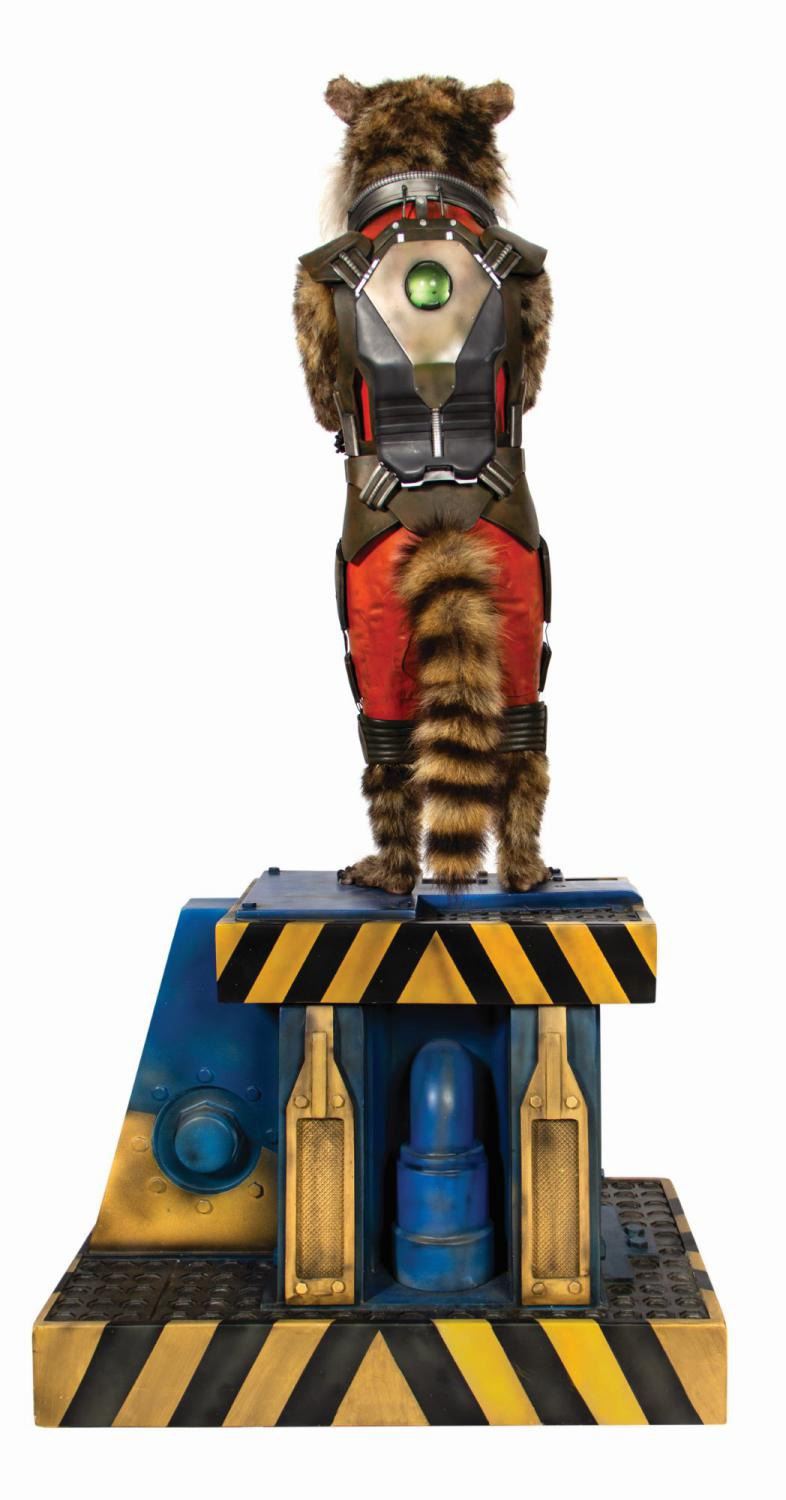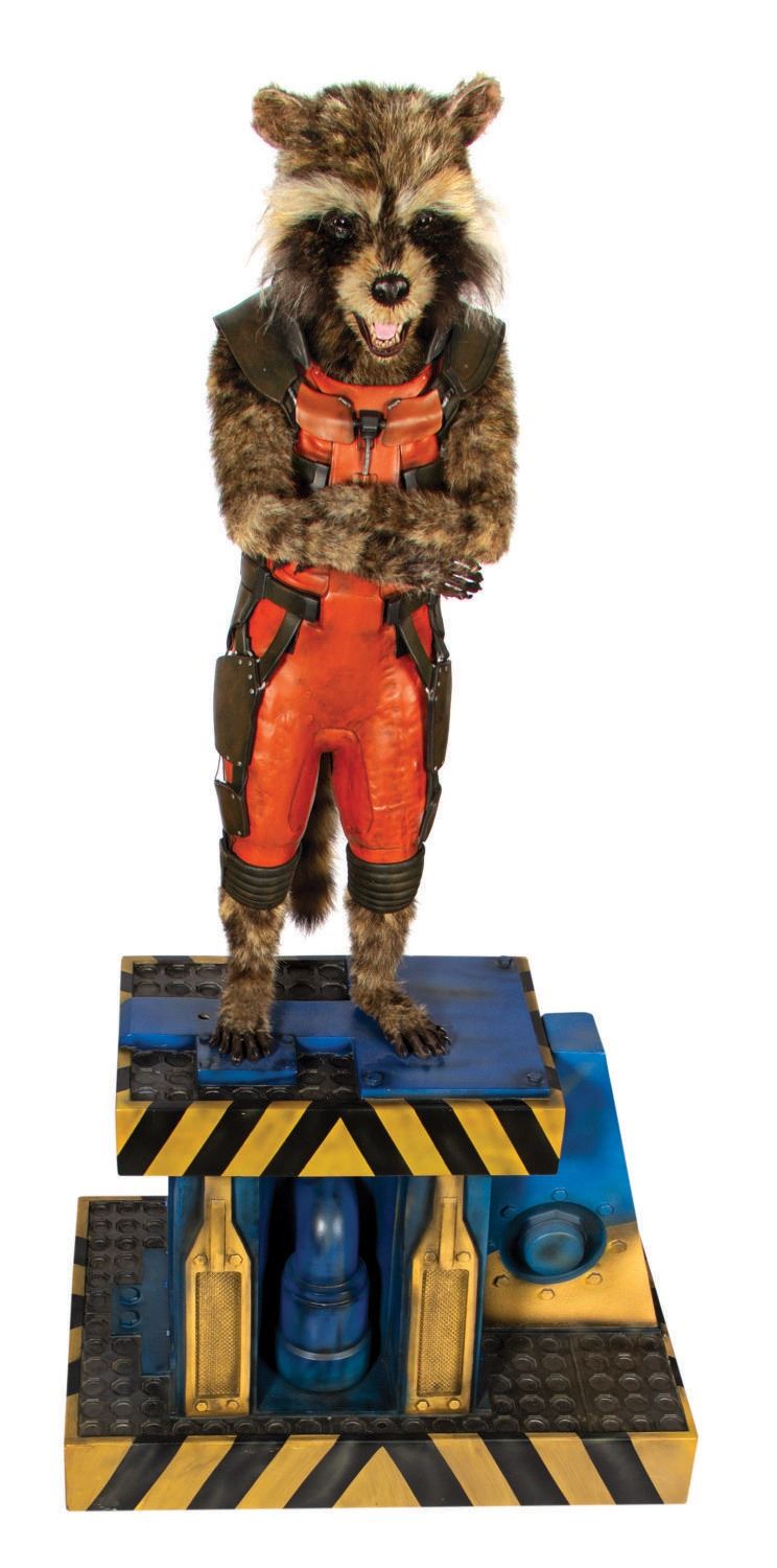 (Marvel, c.2018) An exceptionally rare life-size replica of Rocket Raccoon from Marvel's box office hit, Guardians of the Galaxy. This replica was created for a notable wax museum, as an addition to their Marvel exhibit. Only three of these life-like replicas were created. Rocket's pose is instantly recognizable from the scene in which he is arrested and booked on the planet Xandar. This museum-quality figure is expertly created in mixed media including silicone, faux fur, dental acrylic, and metal wiring. A custom "Guardians" themed base has been added to the figure for a stunning display. Rocket stands 36" tall, and the replica measures 56.5" tall including the base. The condition is very good, with some wear throughout from its original use, including small worn areas along the ears and nose. This item may require special shipping arrangements, please inquire for details and estimates.