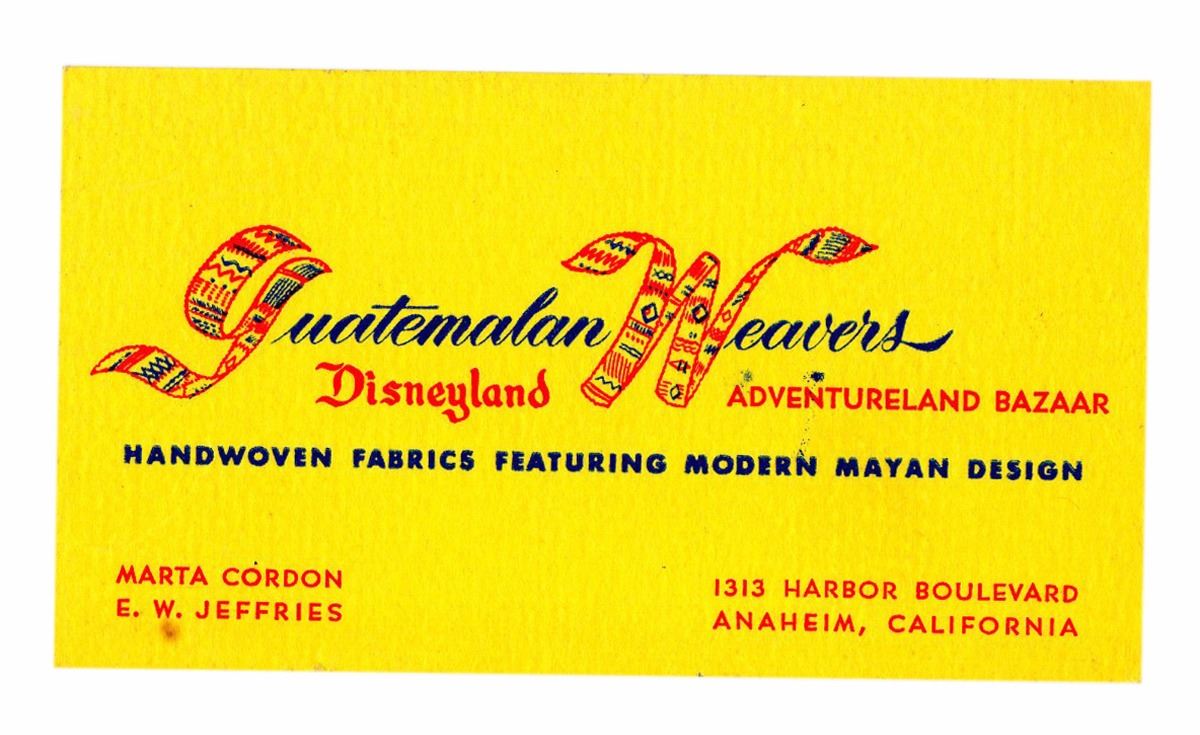 (Disneyland, 1950s) Large black and grey shawl with original business card from "Guatemalan Weavers" in Adventureland. The shop would eventually become the Safari Outpost. The shawl measures 81"x16.5" and the yellow business card measures 2"x3.6". Pair is in good condition with minor wear.