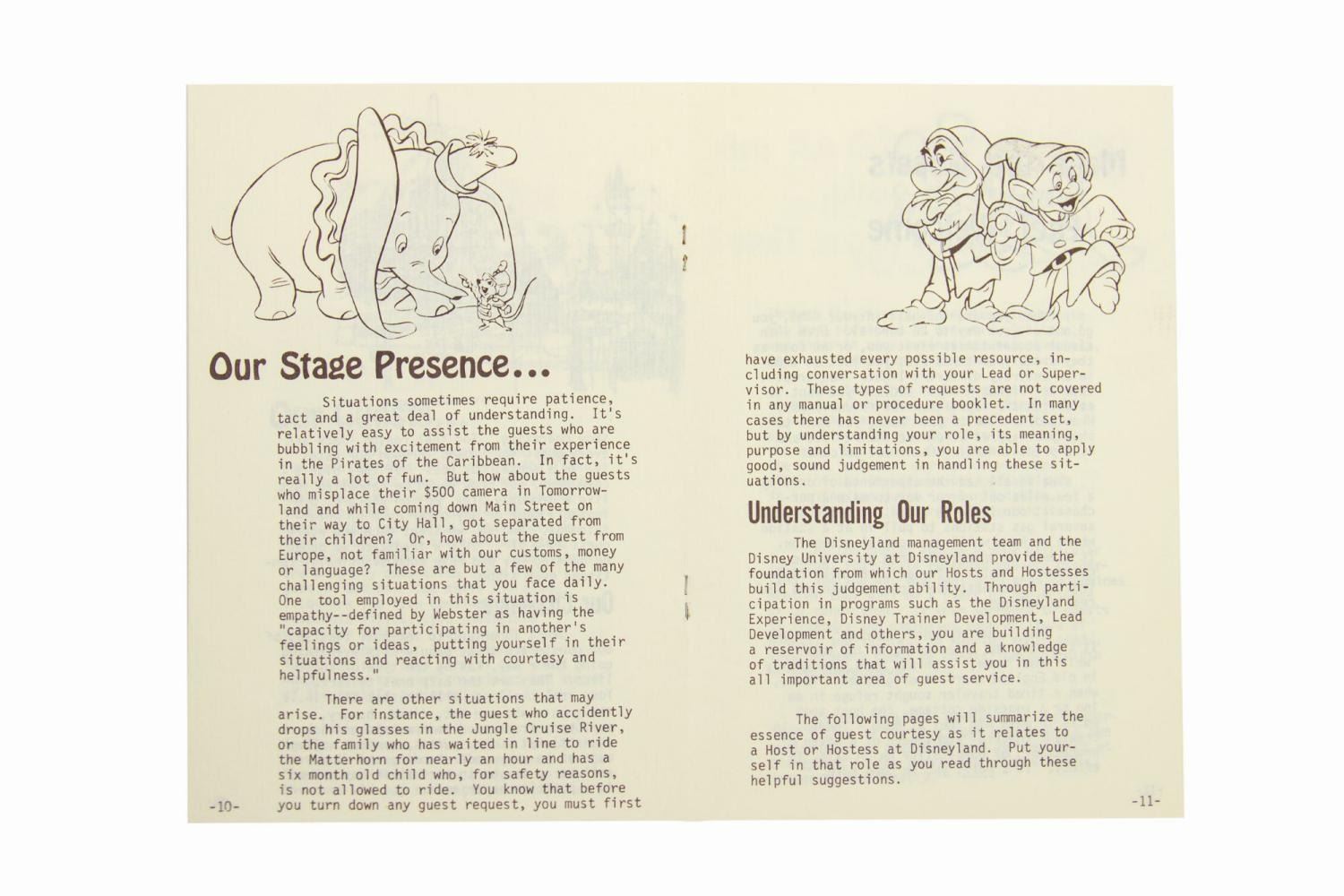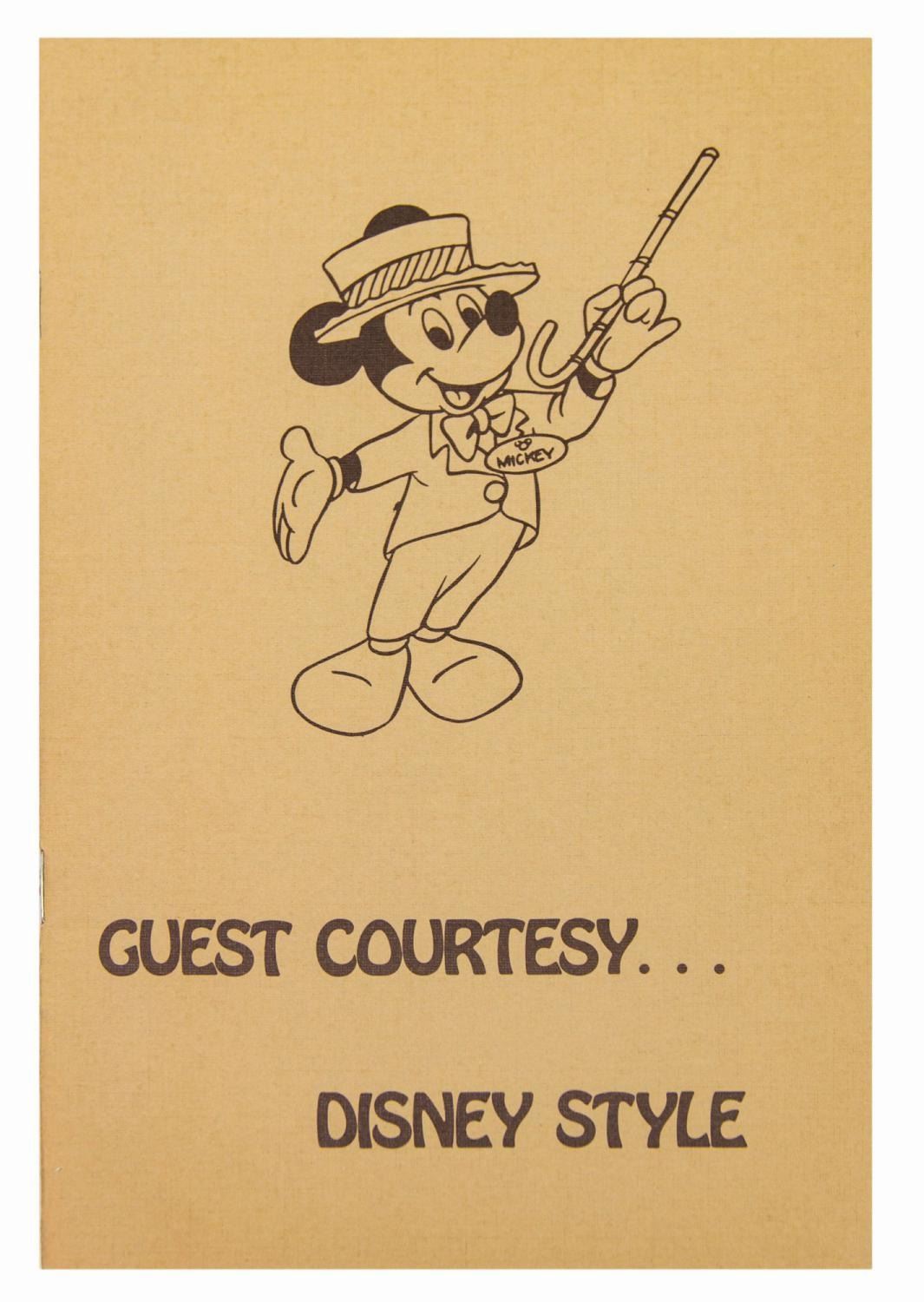 (Disneyland, c.1970s) A Disneyland cast member manual titled, Guest Courtesy... Disney Style. The 19-page booklet provides instruction on how cast members are to comport themselves as part of the Disneyland "show," and offers tips and examples for successful guest interactions. Measuring 8.25"x5.5", the piece is in very good condition with minimal wear.