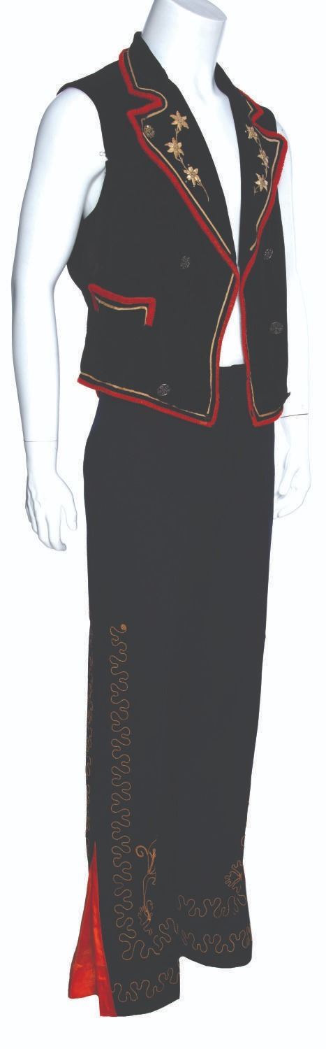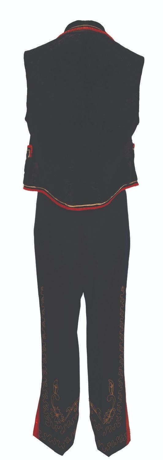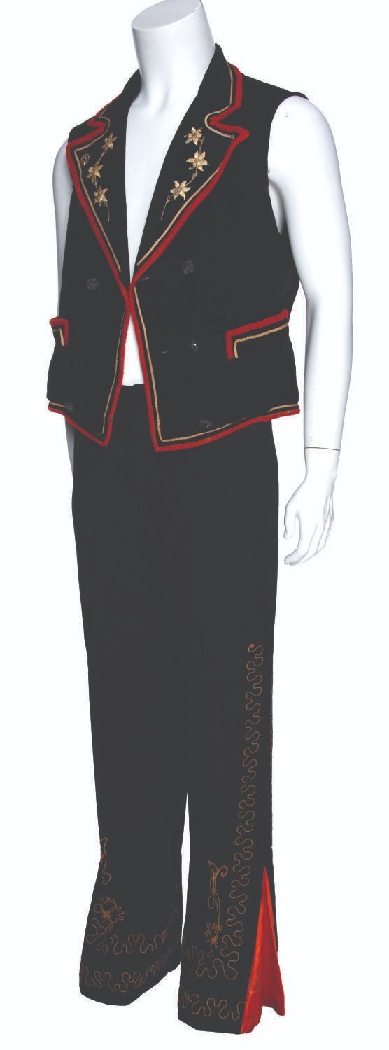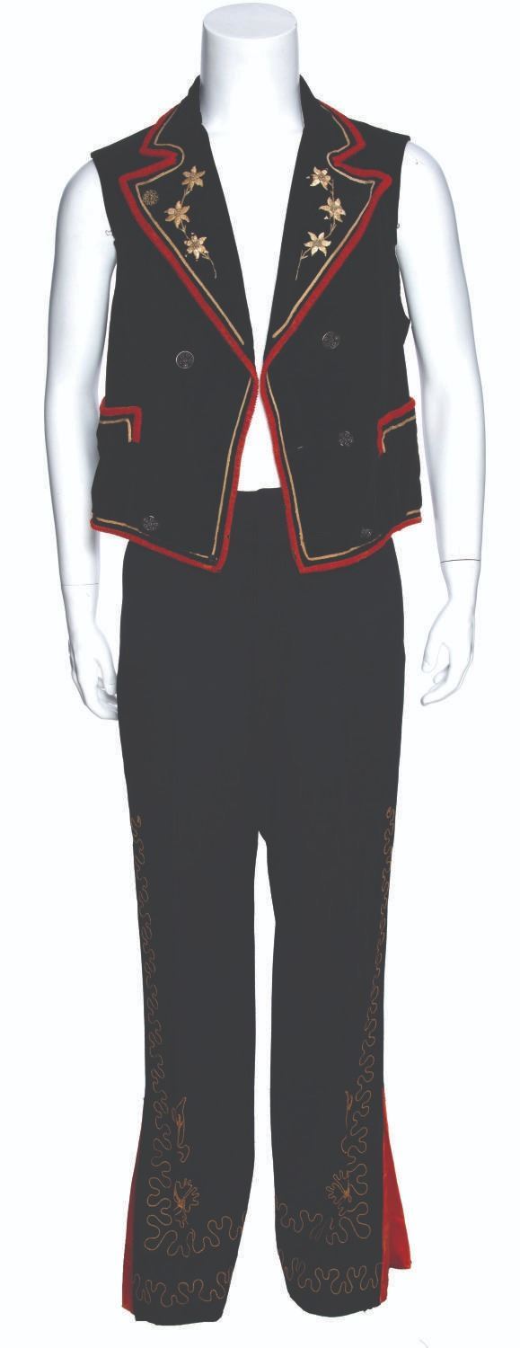 (Disneyland, 1958-60) An original costume worn by Guy Williams during one of his Disneyland appearances as Zorro's alter ego, Don Diego de la Vega. Williams made several appearances at Disneyland as Zorro between 1958 and 1960, and this costume for Don Diego includes his vest and pants. Once Williams stopped appearing at the Park, this very rare costume was given to the Disneyland Security Chief tasked with escorting Williams during those early performances. The pants have a very early Disneyland wardrobe stamp along the inside of the waist which reads "Property of Disneyland" in black ink. This exceptionally rare costume is in very good condition with some wear throughout from use, including a few small holes and spots of minor discoloration.