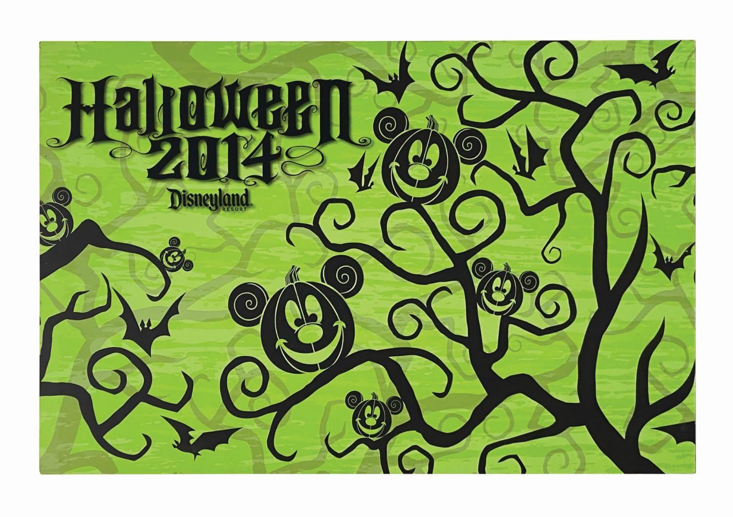 (Disneyland, 2014) An eye-catching sign used for a merchandising display during Halloween 2014. The green and black imagery features pumpkin head Mickeys and is printed and adhered to dense foam board. Signs such as this one could be seen in the World of Disney store in Downtown Disney, decorating the back walls of the inset upper display tiers. Measuring 29.75"x46", the sign is in very good condition with minor surface wear and some edge-wear from use.