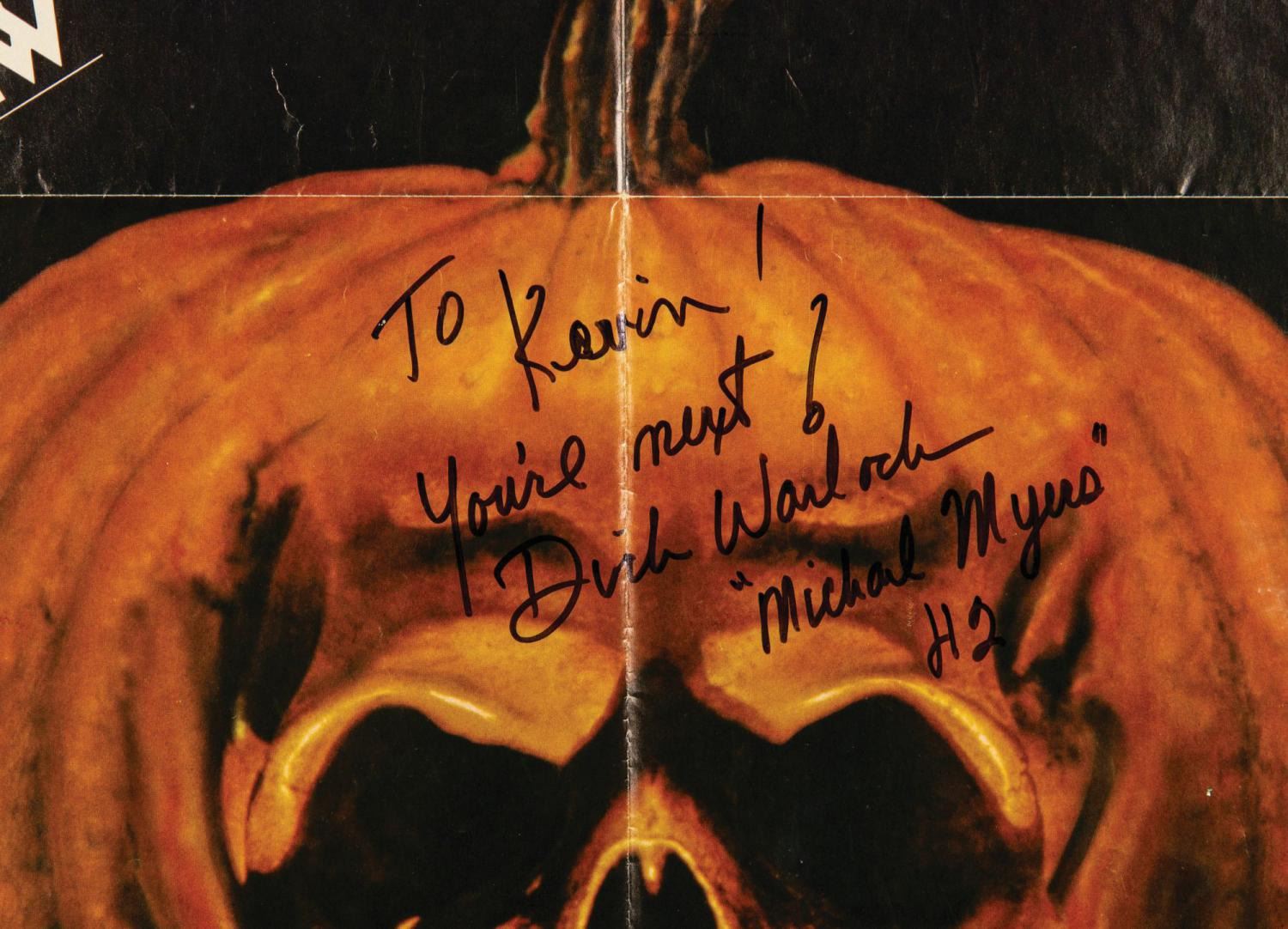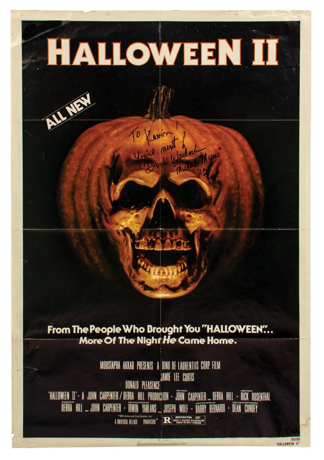 (Universal, 1981) An original one sheet poster for the classic slasher sequel, Halloween II. The poster has been signed in black felt pen on the central graphic, "To Kevin! You're Next! Dick Warlock 'Michael Myers' H2." In addition to his terrifying role as the unkillable stalker in Halloween II, Warlock had a prolific career as a stuntman and stunt coordinator, working on films like Child's Play 2, The Running Man, and The Abyss. Folded as issued, the poster measures a full 41"x27" and is in good condition. It exhibits moisture staining in the blank borders, corner pinholes, edge tears, and 2" fold separation at top center.