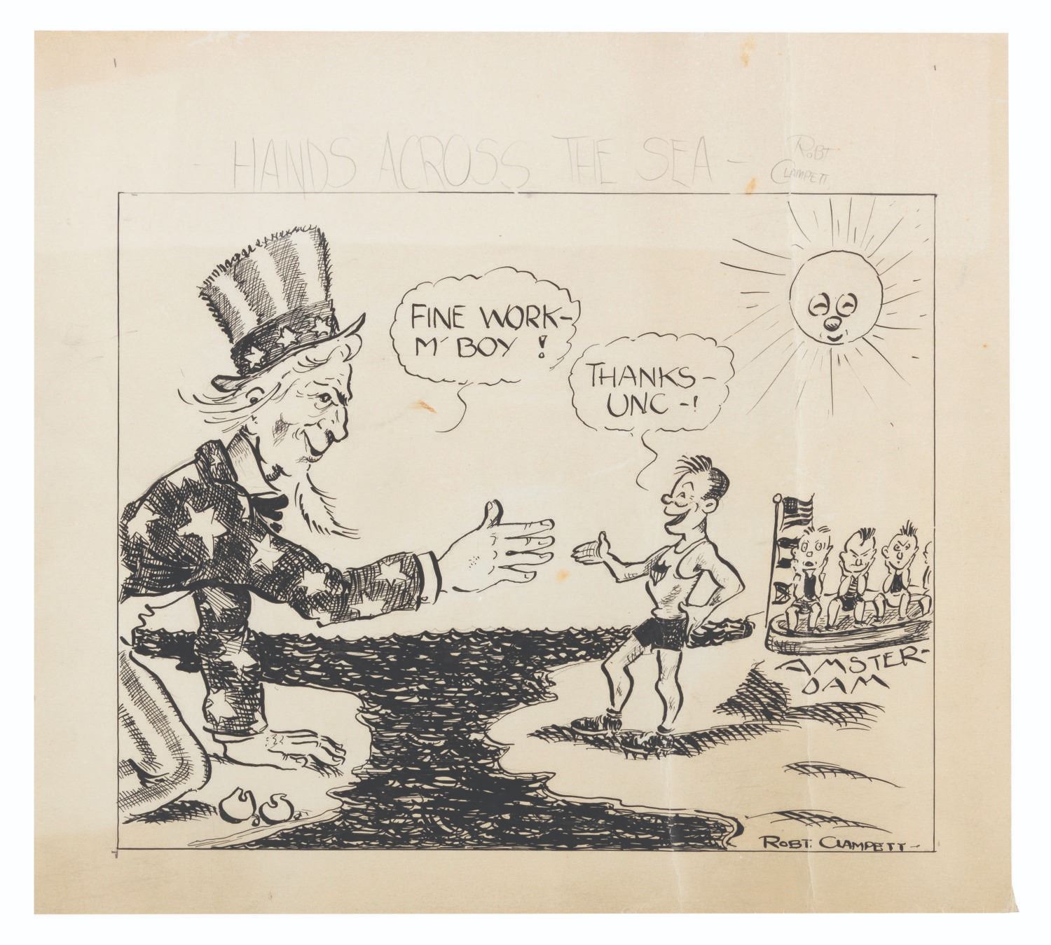 (Clampett, 1928) The 1928 Summer Olympic Games ended with the United States leading all nations with 56 medals. A 15-year-old Bob Clampett immortalized the event in this beautifully rendered single-paneled comic. Measuring 12" x 10.5" with an image size of 10" x 8" the artwork is in good condition with a vertical crease on the left side.