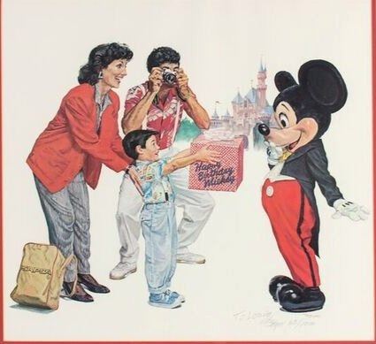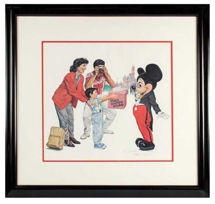 (Disneyland, 1987) A beautiful limited edition lithograph by Charles Boyer featuring Mickey Mouse receiving a birthday present from a family visiting Disneyland. The original artwork was created to celebrate Mickey Mouse's 30th birthday in 1958, and was such a beautiful image that it was later recreated in this limited edition in 1987 in preparation for Mickey's 60th Birthday. This lithograph is hand-numbered 60/1000 and is signed in the lower-right "To Louie, Charles Boyer". This item measures 28.5"x29.5" and is in very good condition with little wear to the frame.
