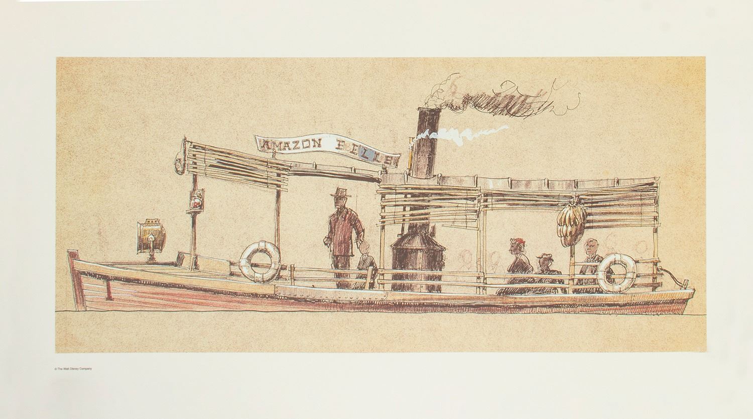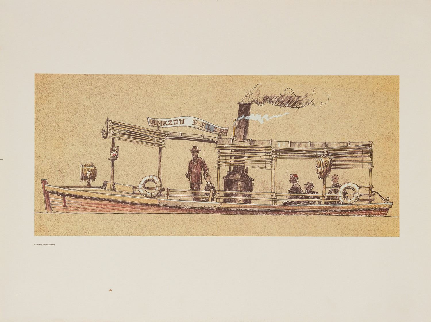 (Disneyland, c.1987) A large printing test featuring concept artwork for Disneyland's Jungle Cruise by Disney Legend Harper Goff. This printing test is believed to have been created for a Disney Gallery limited edition print, and has an image size of 8.75"x19.5" on the 17.5"x23" paper. The condition is good with some edge-wear and a spot of discoloration on the lower left.