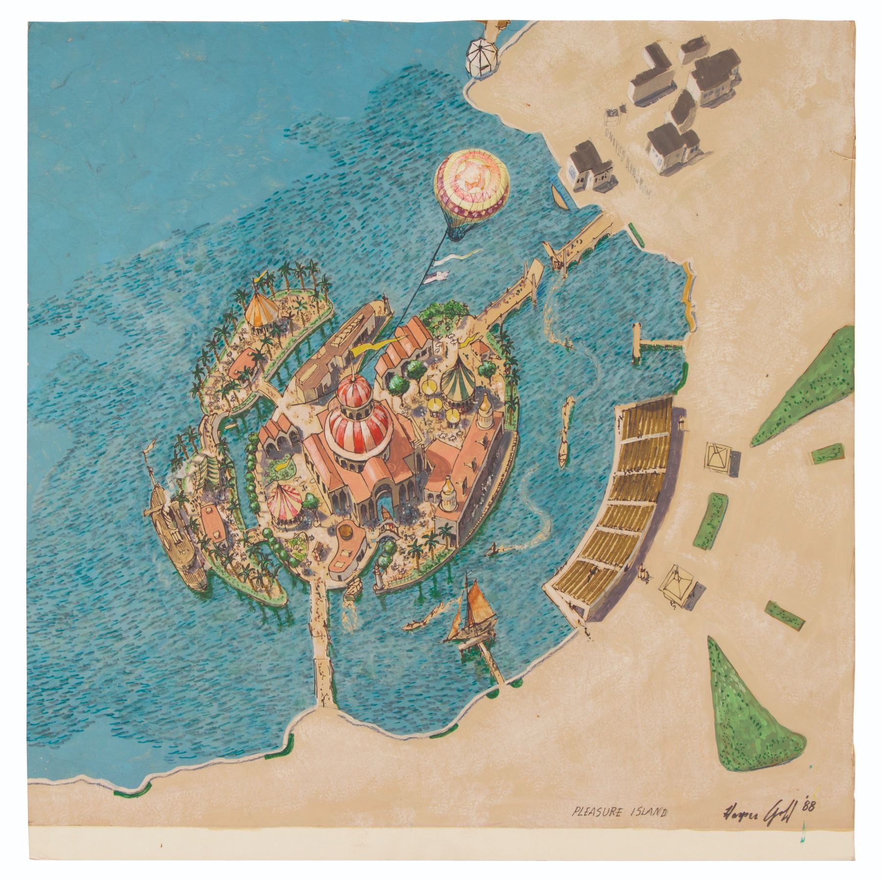 (Epcot, 1988) An stunning original painting by Imagineer Harper Goff for the proposed Pleasure Island Park area of Epcot's World Showcase. Very few concepts from this proposed expansion exist, and this one captures the proposed beachfront style in beautiful color. Goff's work on this project is well documented however, his original concepts are virtually non-existent outside of the WED archives. Measuring 22.5"x22" on art board, this concept is in very good condition with some edge-wear from age and use.