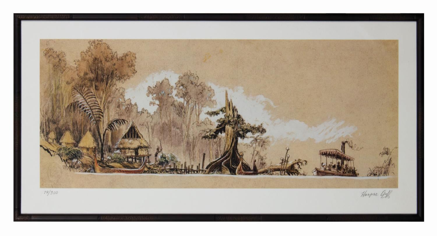(Disneyland, 1987) A Disney Gallery limited edition lithographic print of concept art for the Jungle Cruise by Imagineer Harper Goff. The print retains a debossed Disney Gallery stamp at lower left. It is signed in pencil at lower right by the artist and hand-numbered at lower left, "79/300." The original Disney Gallery COA is attached to the reverse. Measuring 13.75"x28.75" within a 15"x29.75 frame, the piece is in very good condition with minor surface wear to the frame. The wood has split on the reverse where the hanging hardware was formerly screwed into place.