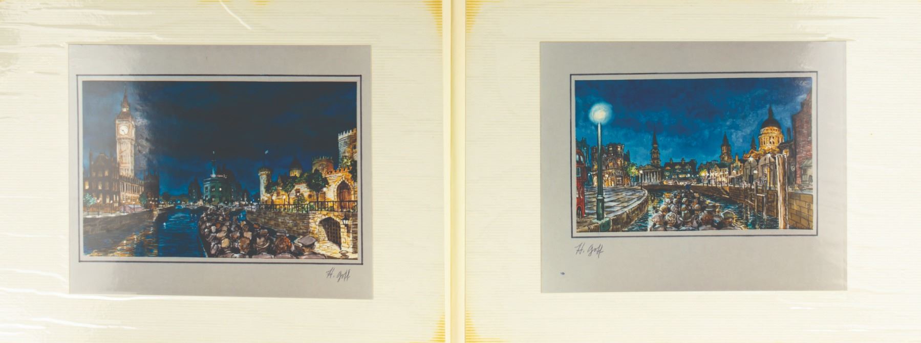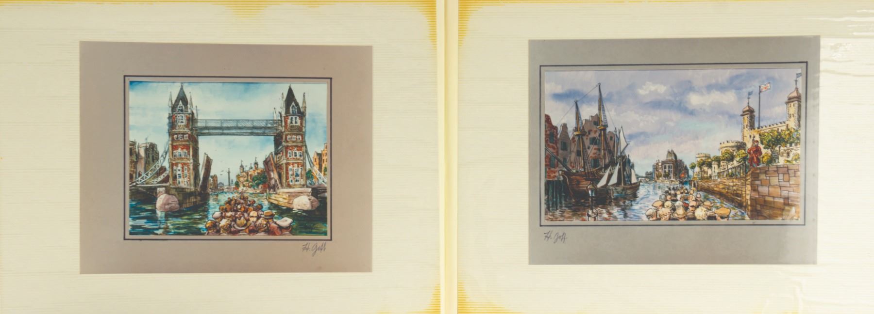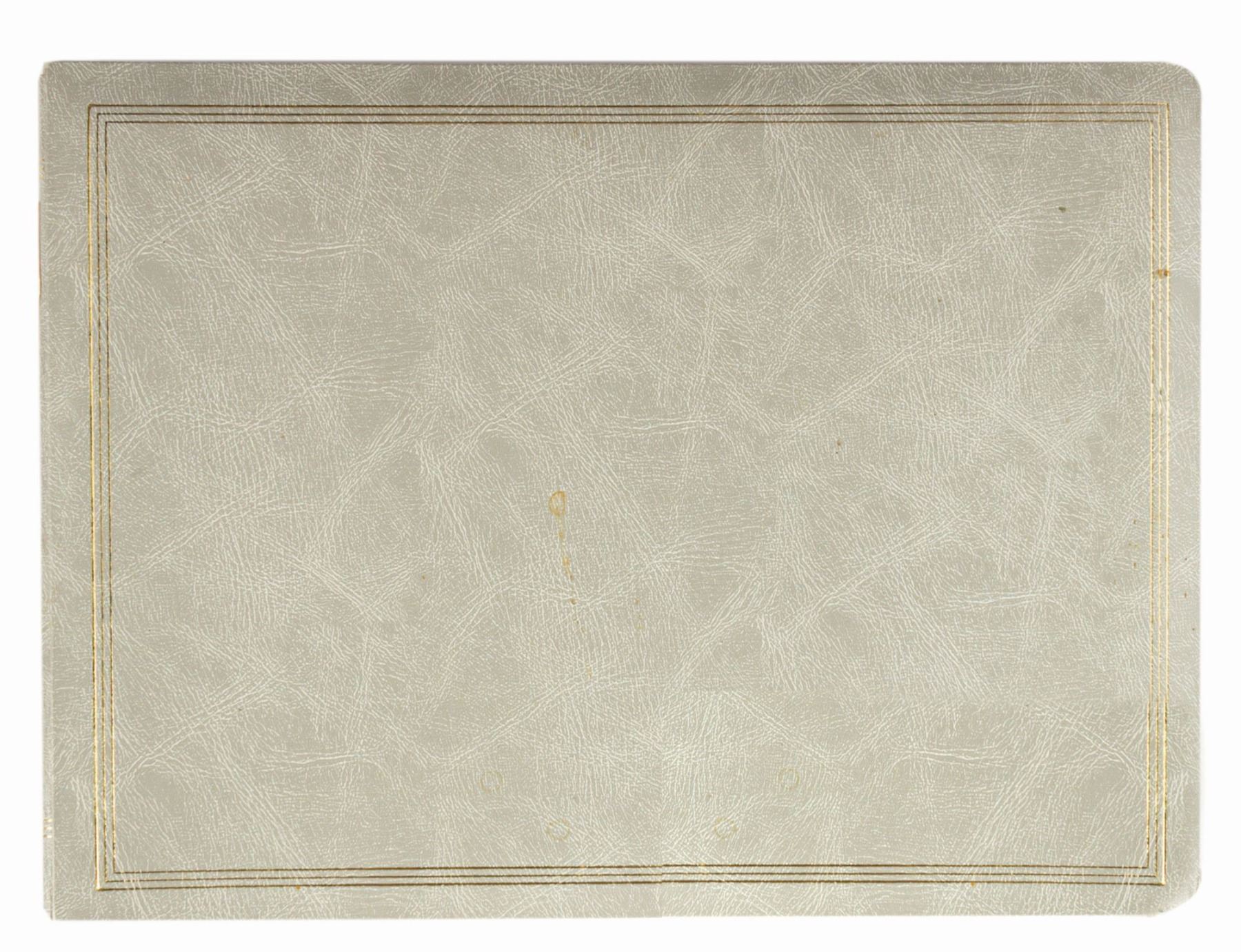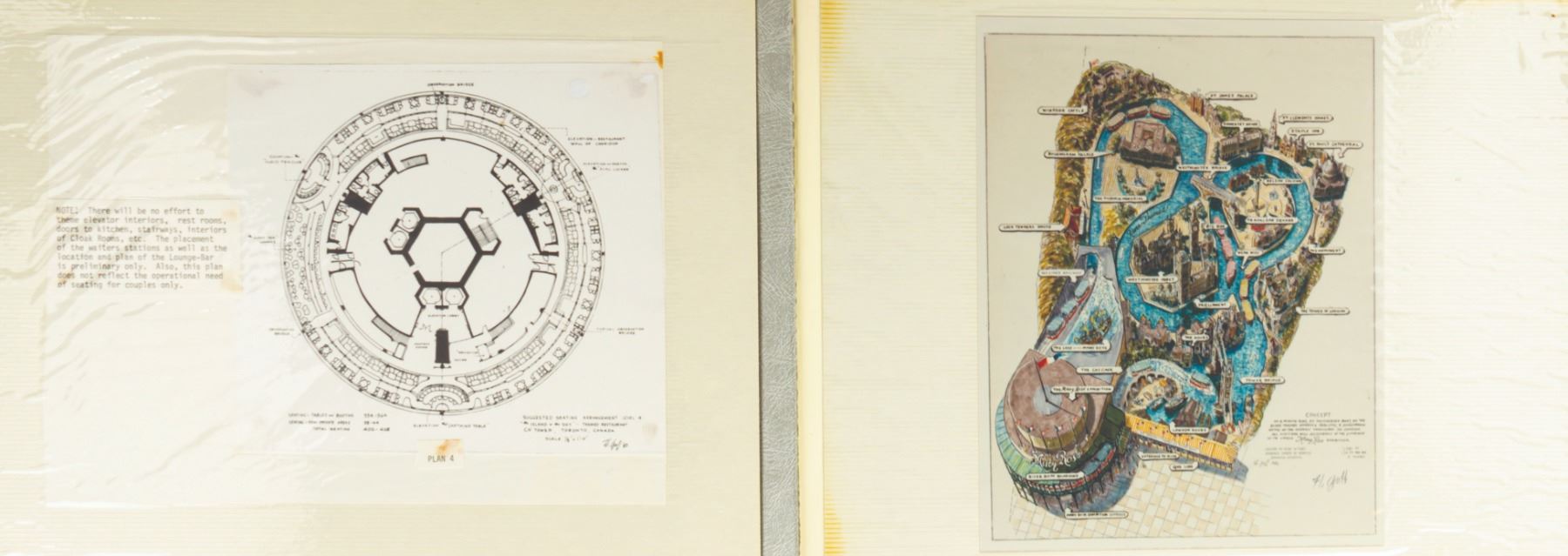 (Epcot, c.1986) The personal collection of concept art photo prints for the Thames River Ride at Epcot's World Showcase, from the estate of Imagineer Harper Goff. The 21-page album offers a unique opportunity to view what could have been, had this attraction been built. Measuring 12.5"x16.75", the album is in good condition with expected wear from age and use, including one loose page and some age discoloration. There is also some light staining to the cover.
