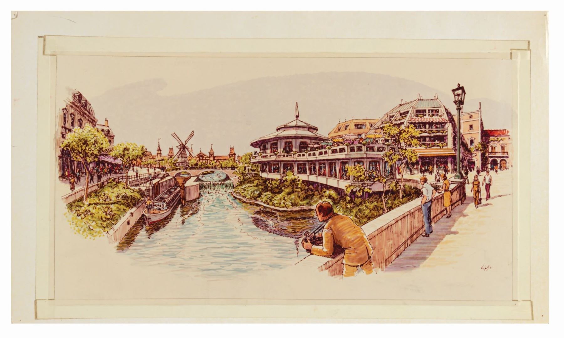 (Epcot, c.1986) A gorgeous art print from the estate of Imagineer Harper Goff, that shows Goff's concept for the never-built Thames River Ride for Epcot. This concept art print was taped to an art board backing for display by Goff and provides a rare look into the development of this never built attraction. Measuring 12.5"x22", the concept print is in good condition overall with some edge and corner wear from use.