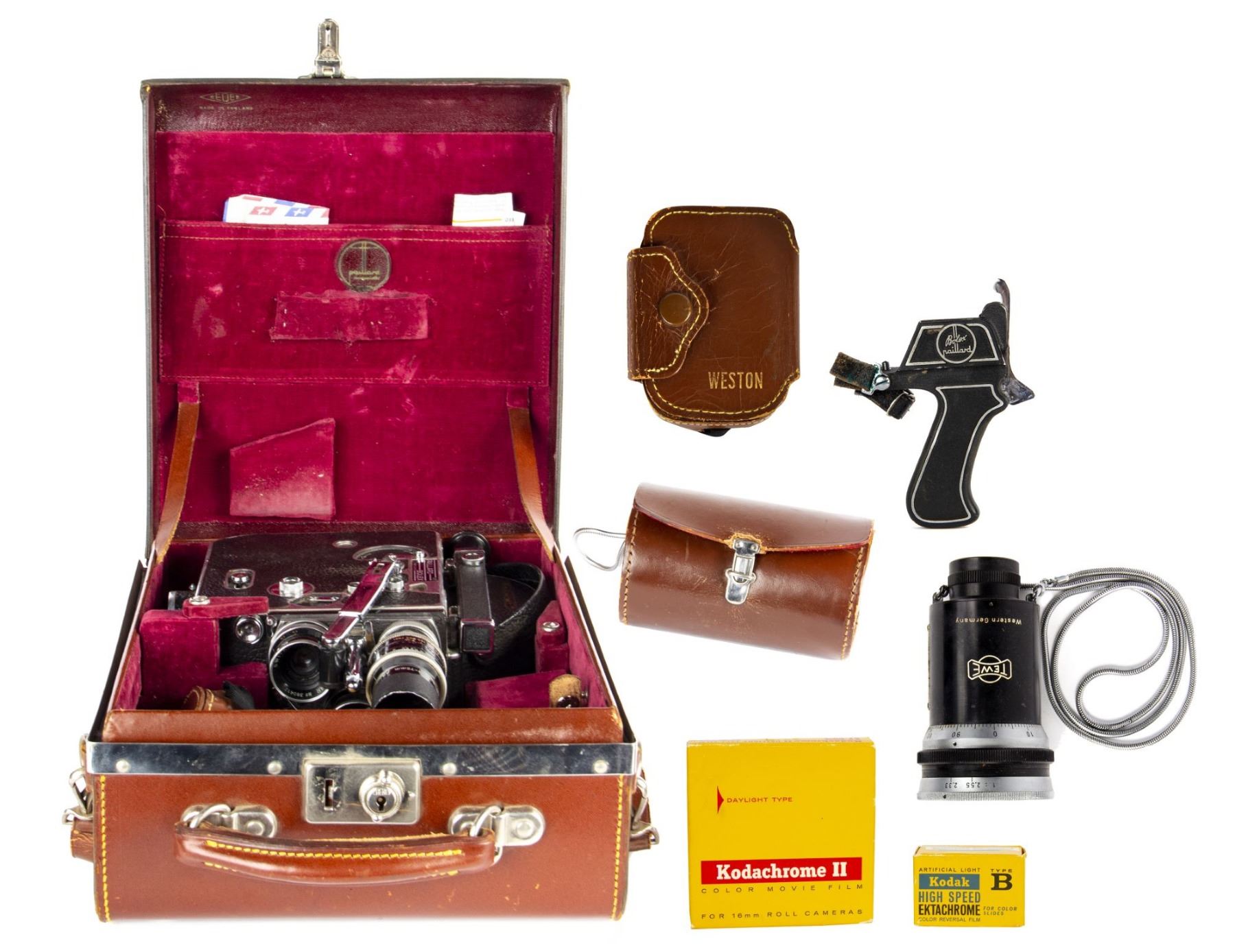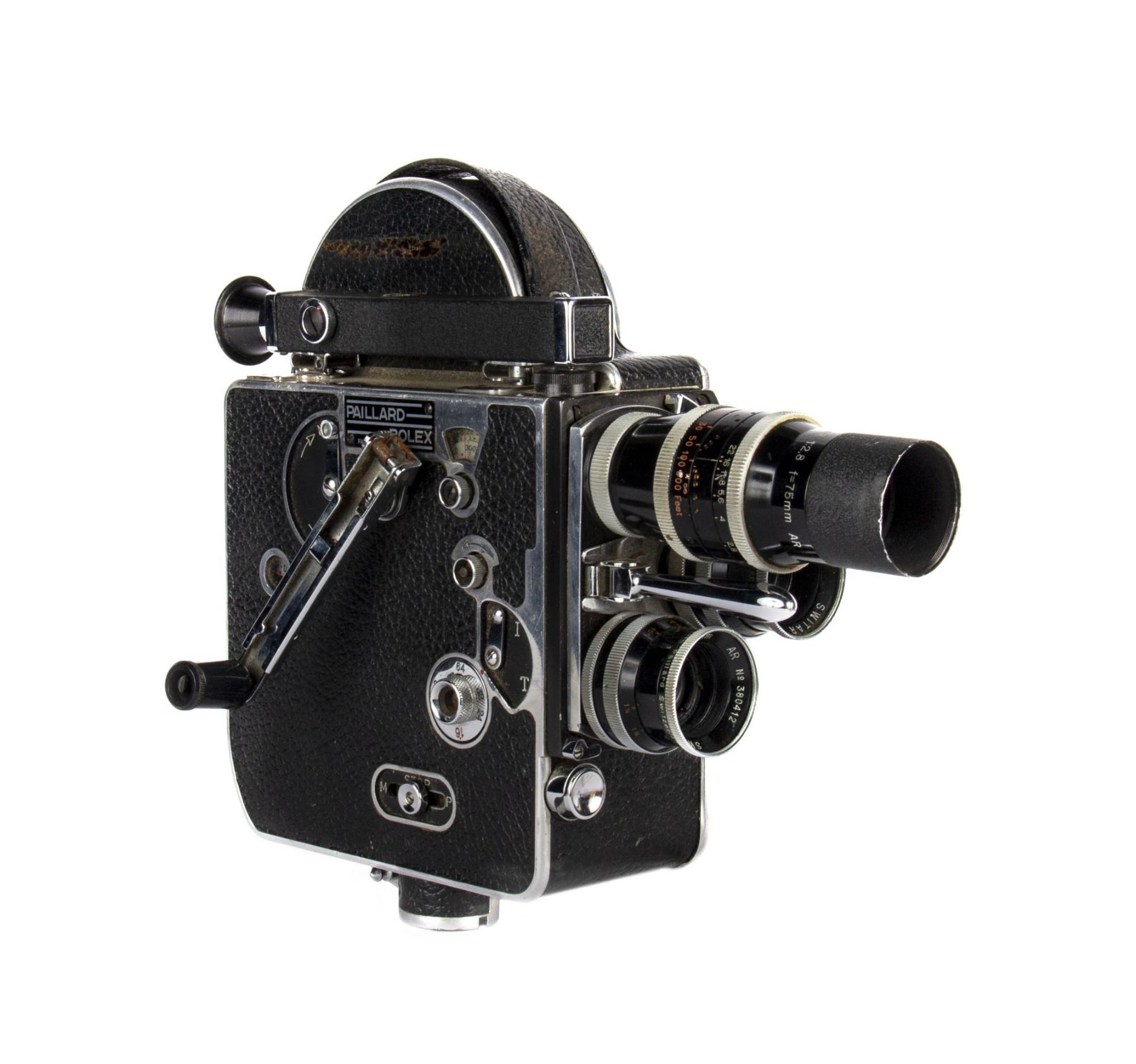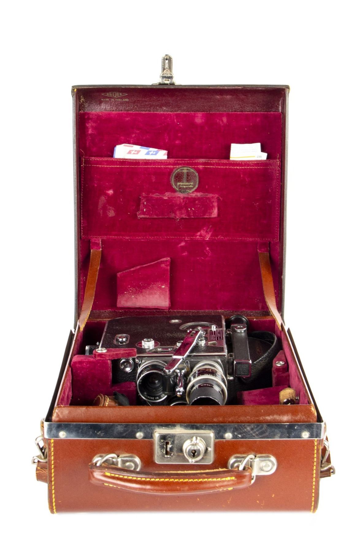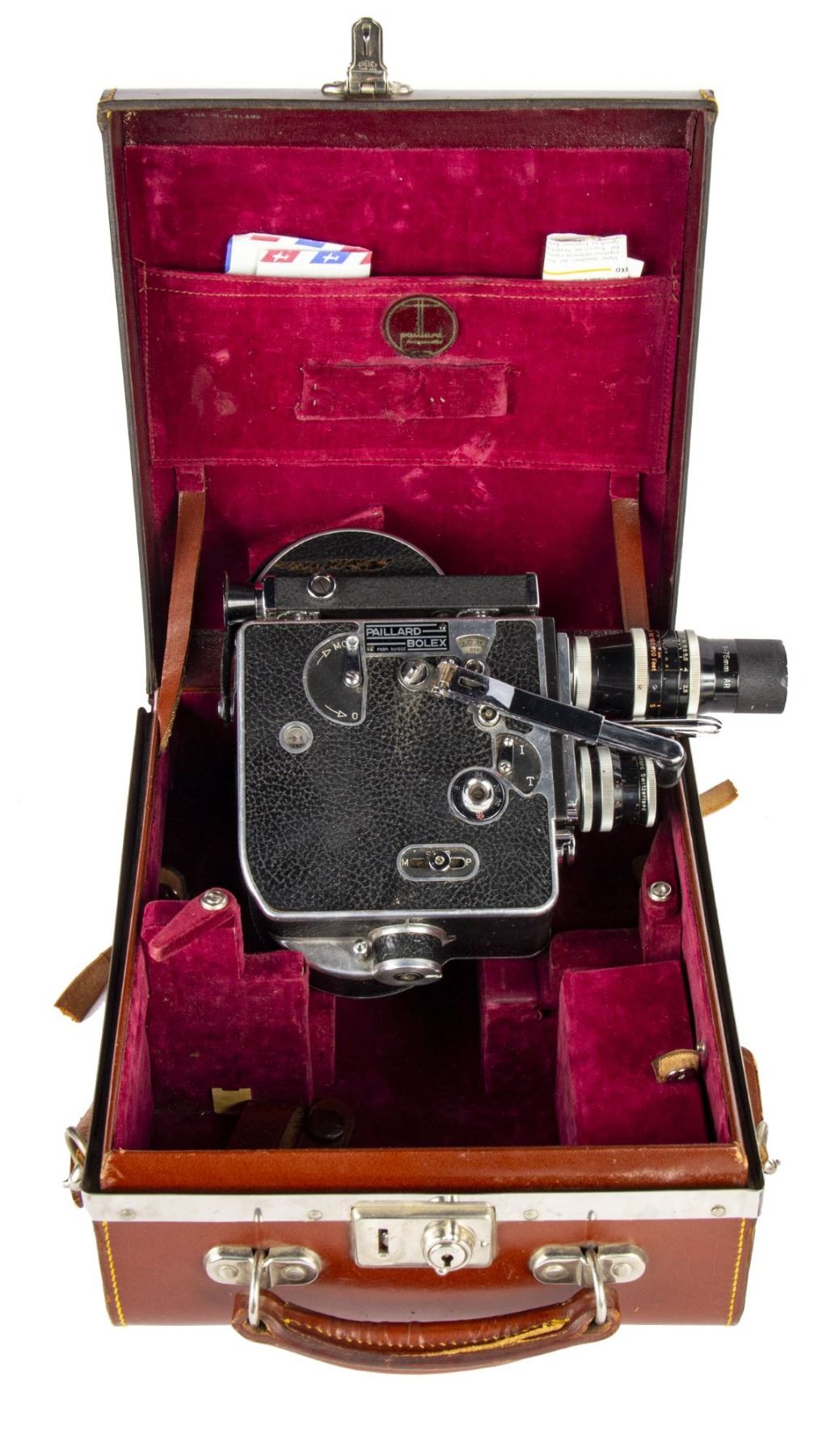 (Bolex, 1950s-70s) An extremely rare Paillard-Bolex H16 16mm film camera that belonged to Harper Goff and was used by Goff on set while working on various film productions including his work as Art Director for "Willy Wonka and the Chocolate Factory". This model was produced in the mid to late 1950s, and includes three lenses: Yvar 1:2.8/f=75mm, Switar 1:1.8 f=16mm, and Switar 1:1.5 f=25mm. Included with the camera itself is a Paillard-Bolex handle for the camera, a Tewe Universal Motivsucher 2.55 Viewfinder in case, a Weston exposure meter in case, a Leica light meter in case, and several small additional items such as unused film, small loose cranks, and a spare small lens. There items all come in a hardshell brown case, as stored by Goff. The hardshell case measures 12"x10" and 6" tall. The condition of the camera appears to be fair to good, but functionality has not been tested. There is expected wear throughout from use and age, and the camera is being sold as-is as a historic film item, not necessarily for functional use. Additionally, a photo of Goff is included in which he is holding this camera on the set of Willy Wonka.