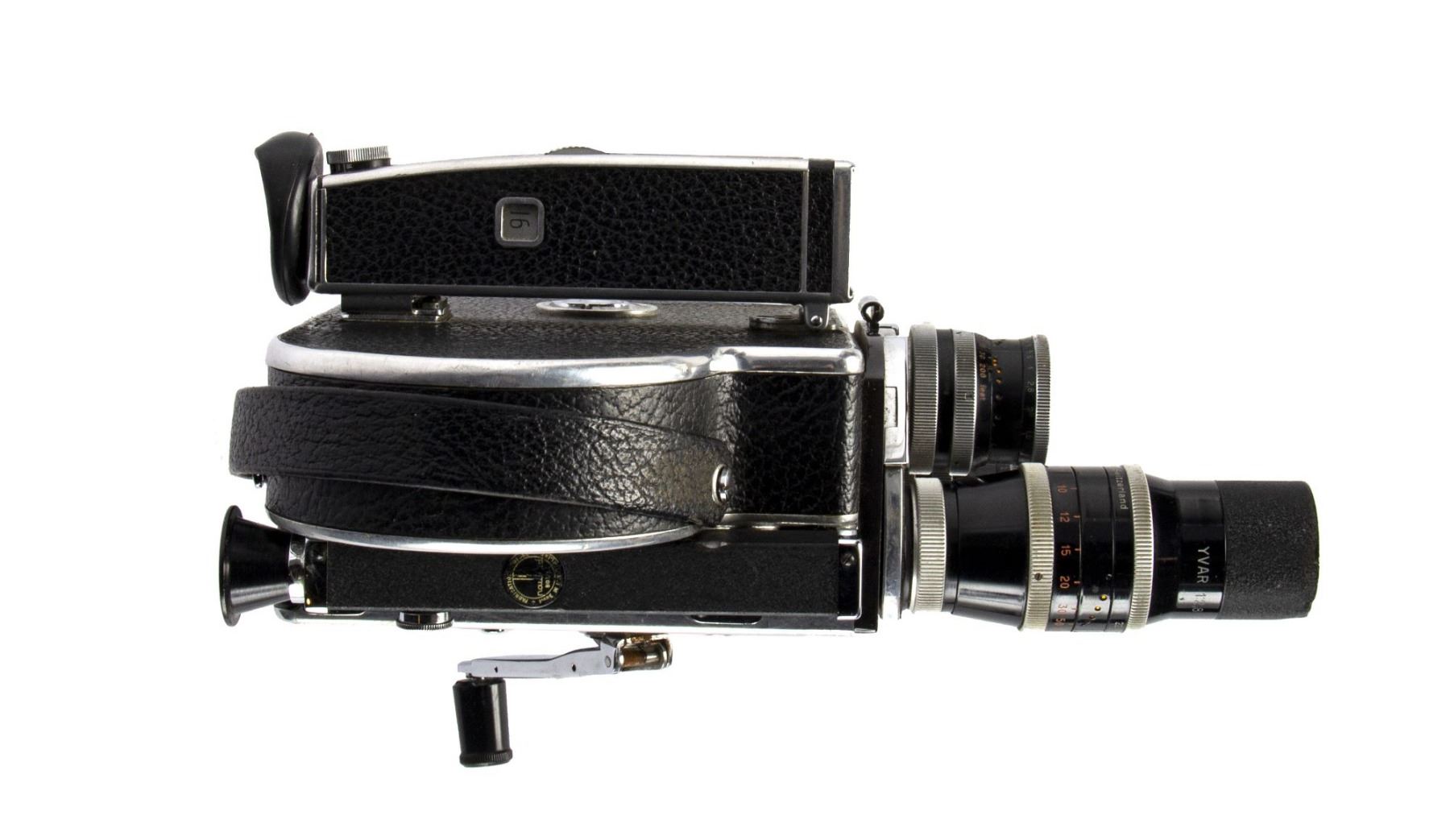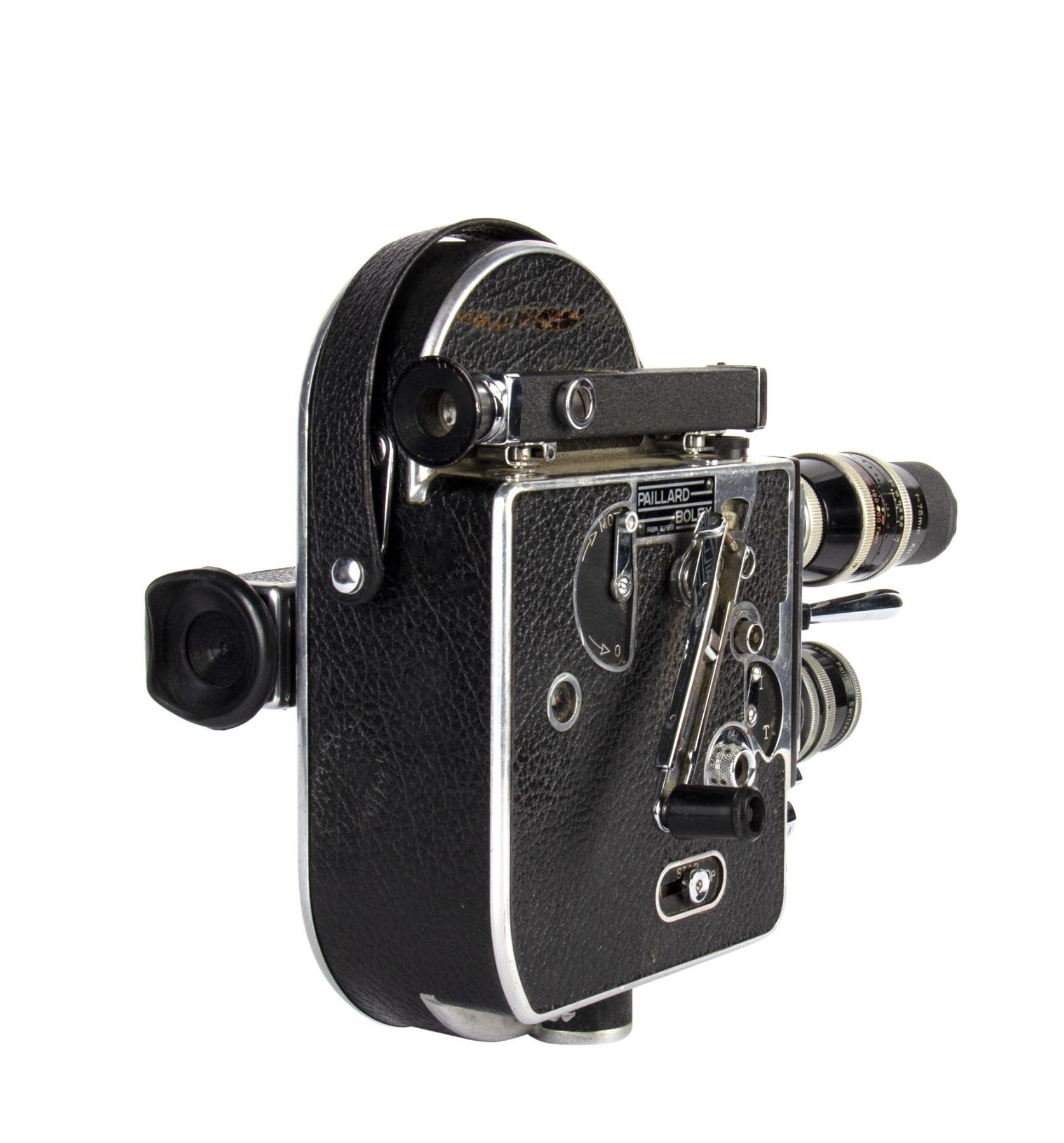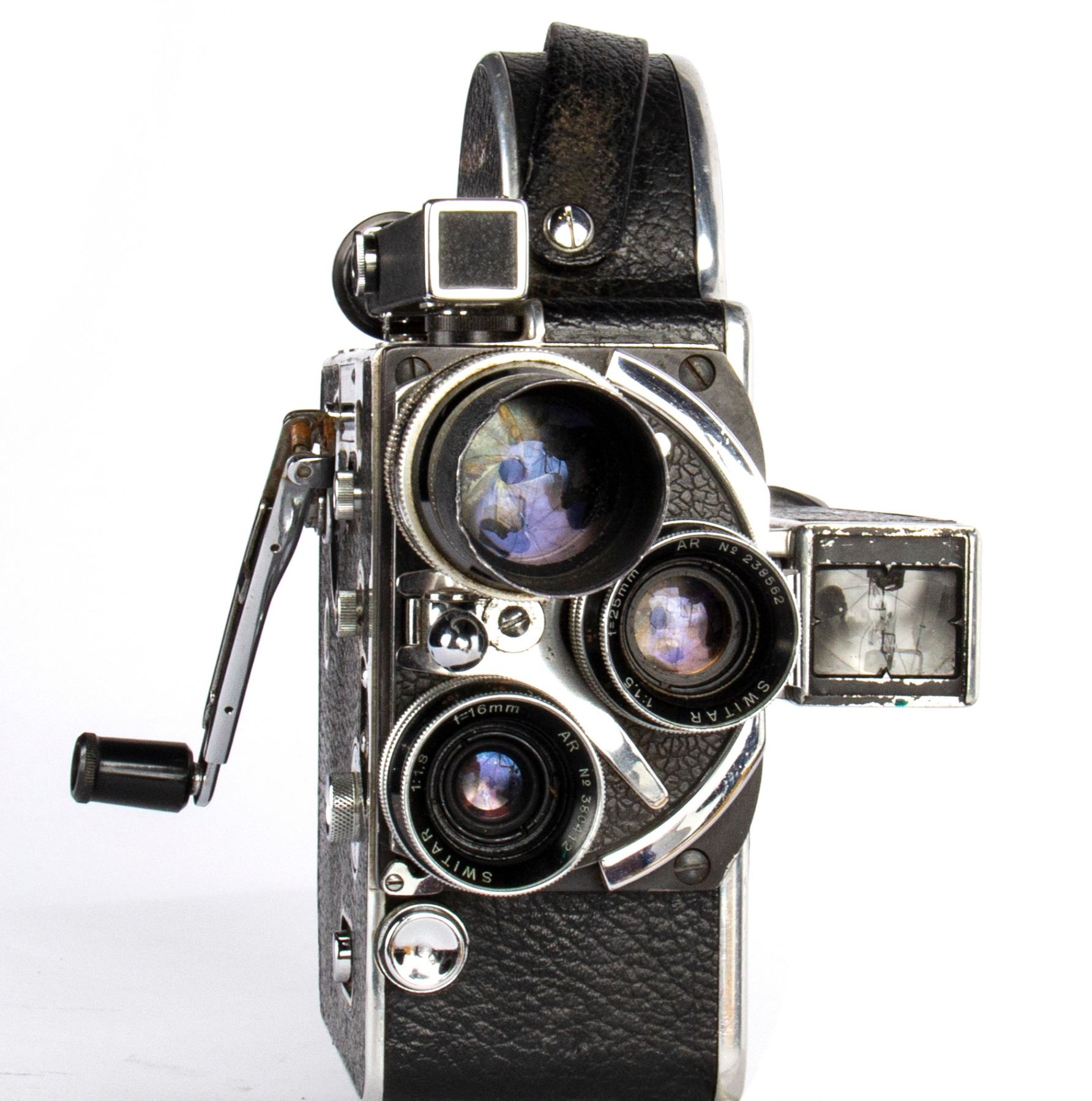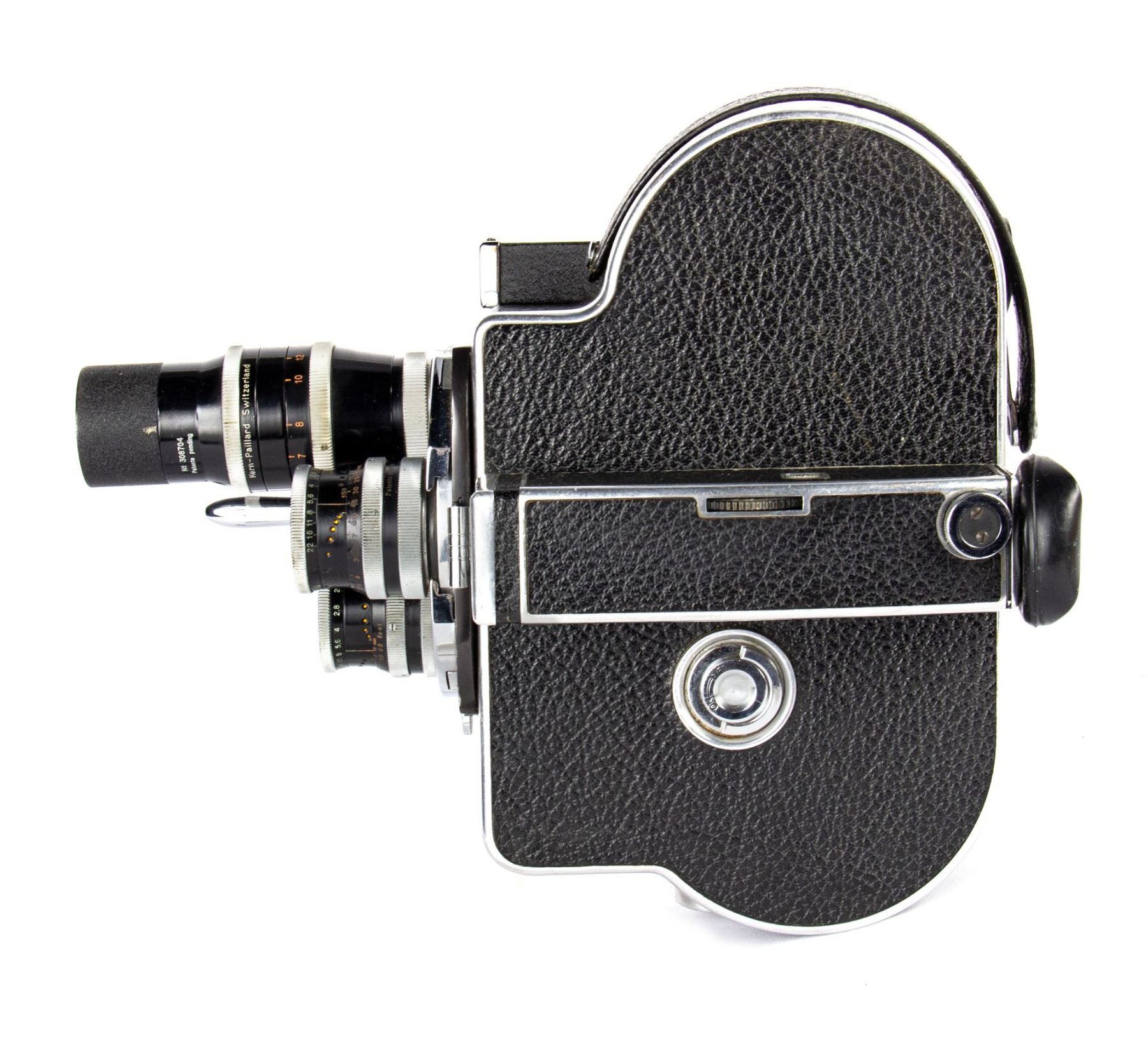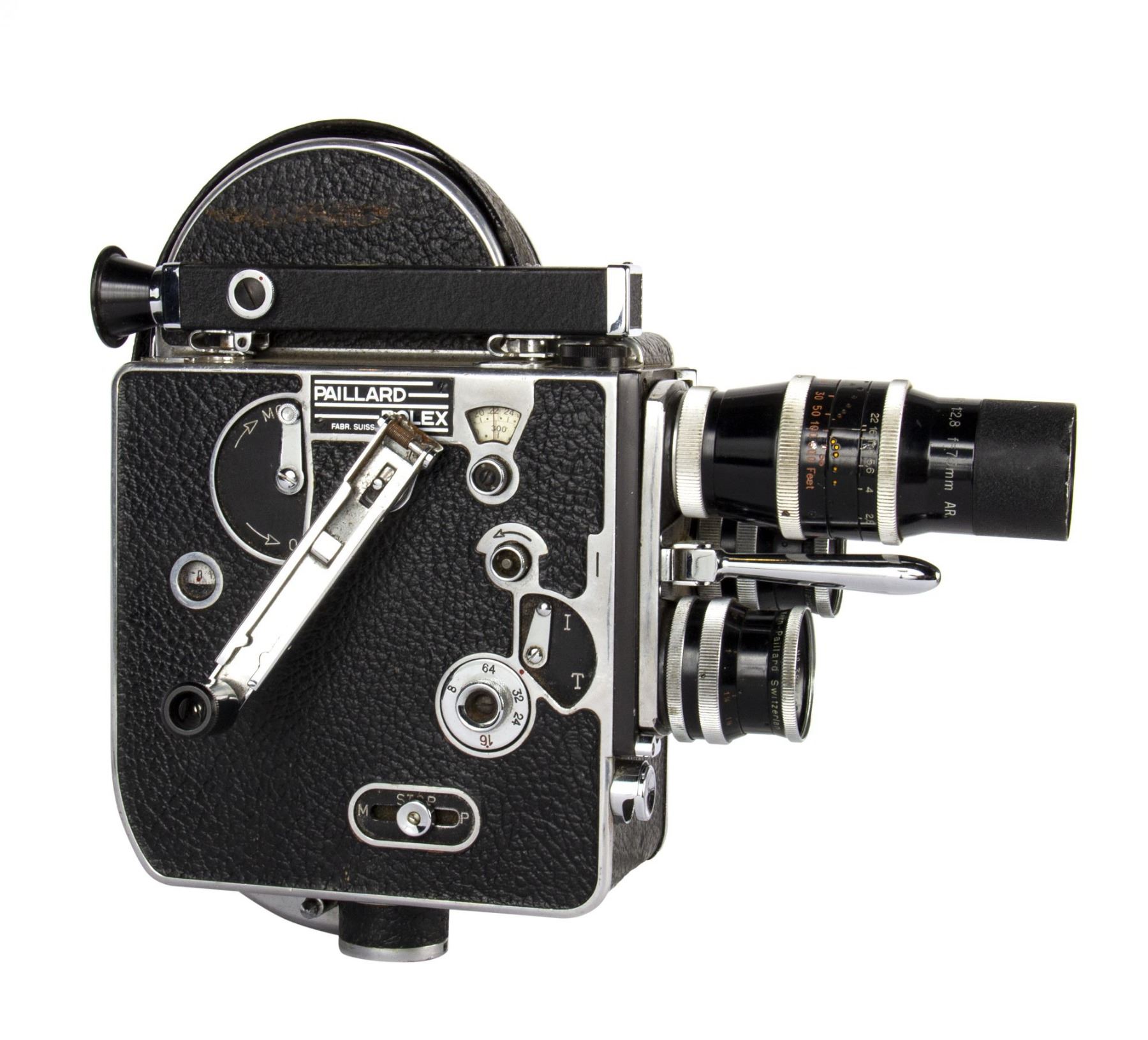 (Bolex, 1950s-70s) An extremely rare Paillard-Bolex H16 16mm film camera that belonged to Harper Goff and was used by Goff on set while working on various film productions including his work as Art Director for "Willy Wonka and the Chocolate Factory". This model was produced in the mid to late 1950s, and includes three lenses: Yvar 1:2.8/f=75mm, Switar 1:1.8 f=16mm, and Switar 1:1.5 f=25mm. Included with the camera itself is a Paillard-Bolex handle for the camera, a Tewe Universal Motivsucher 2.55 Viewfinder in case, a Weston exposure meter in case, a Leica light meter in case, and several small additional items such as unused film, small loose cranks, and a spare small lens. There items all come in a hardshell brown case, as stored by Goff. The hardshell case measures 12"x10" and 6" tall. The condition of the camera appears to be fair to good, but functionality has not been tested. There is expected wear throughout from use and age, and the camera is being sold as-is as a historic film item, not necessarily for functional use. Additionally, a photo of Goff is included in which he is holding this camera on the set of Willy Wonka.