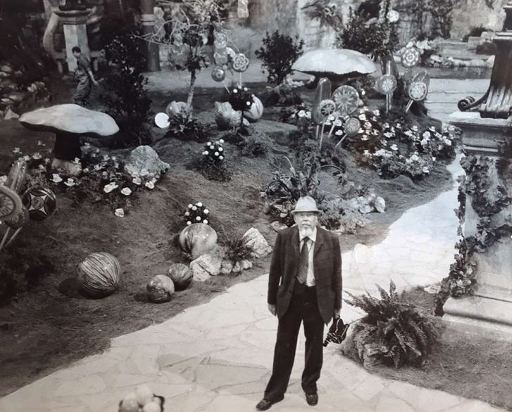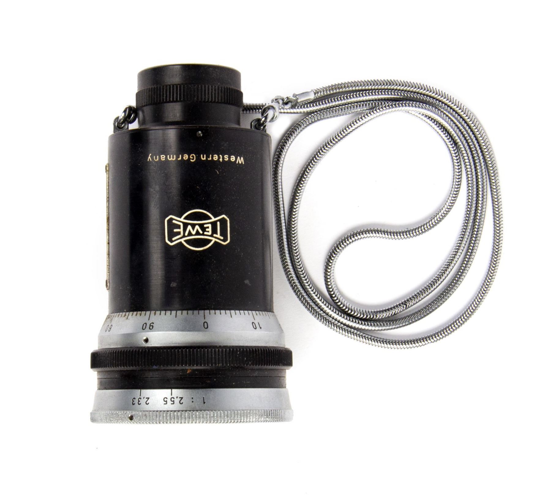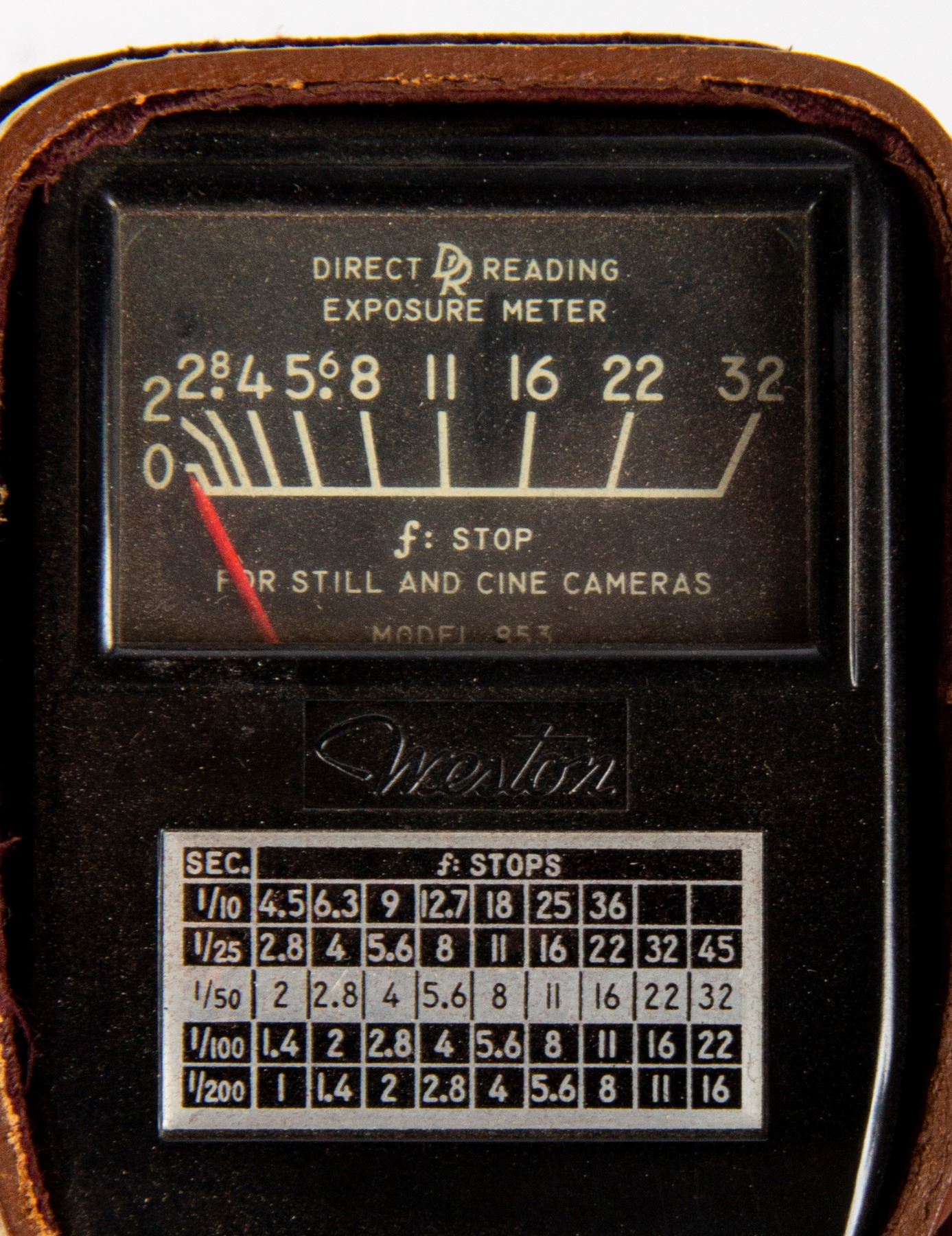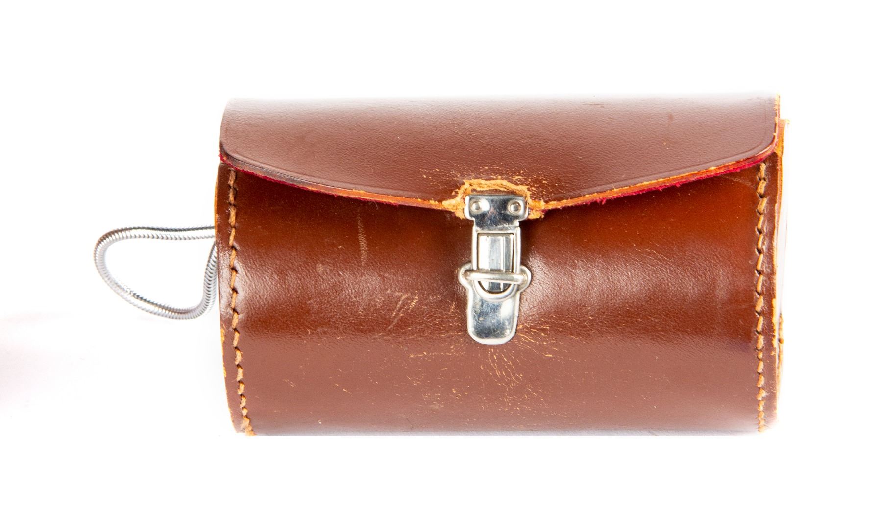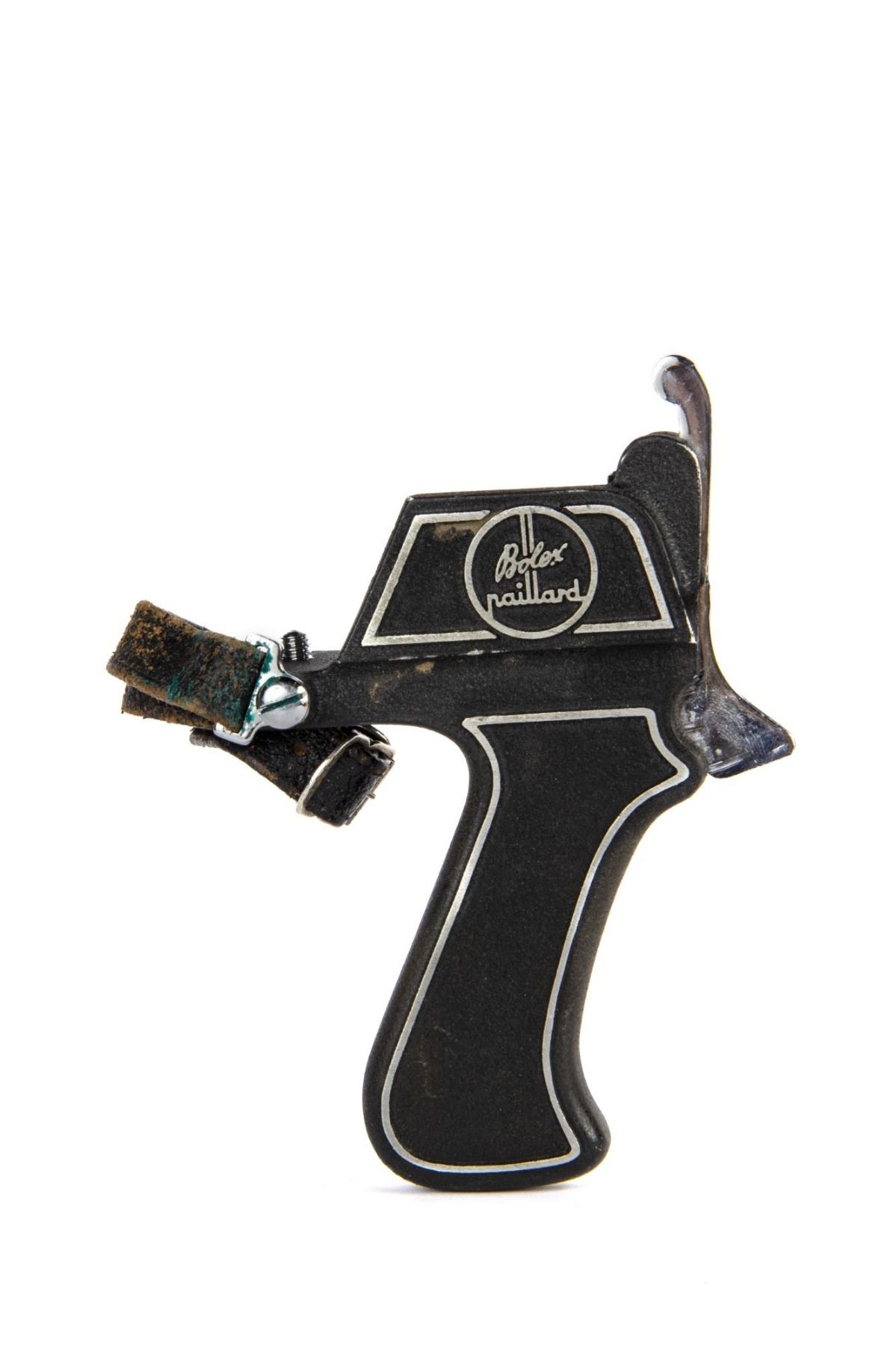 (Bolex, 1950s-70s) An extremely rare Paillard-Bolex H16 16mm film camera that belonged to Harper Goff and was used by Goff on set while working on various film productions including his work as Art Director for "Willy Wonka and the Chocolate Factory". This model was produced in the mid to late 1950s, and includes three lenses: Yvar 1:2.8/f=75mm, Switar 1:1.8 f=16mm, and Switar 1:1.5 f=25mm. Included with the camera itself is a Paillard-Bolex handle for the camera, a Tewe Universal Motivsucher 2.55 Viewfinder in case, a Weston exposure meter in case, a Leica light meter in case, and several small additional items such as unused film, small loose cranks, and a spare small lens. There items all come in a hardshell brown case, as stored by Goff. The hardshell case measures 12"x10" and 6" tall. The condition of the camera appears to be fair to good, but functionality has not been tested. There is expected wear throughout from use and age, and the camera is being sold as-is as a historic film item, not necessarily for functional use. Additionally, a photo of Goff is included in which he is holding this camera on the set of Willy Wonka.