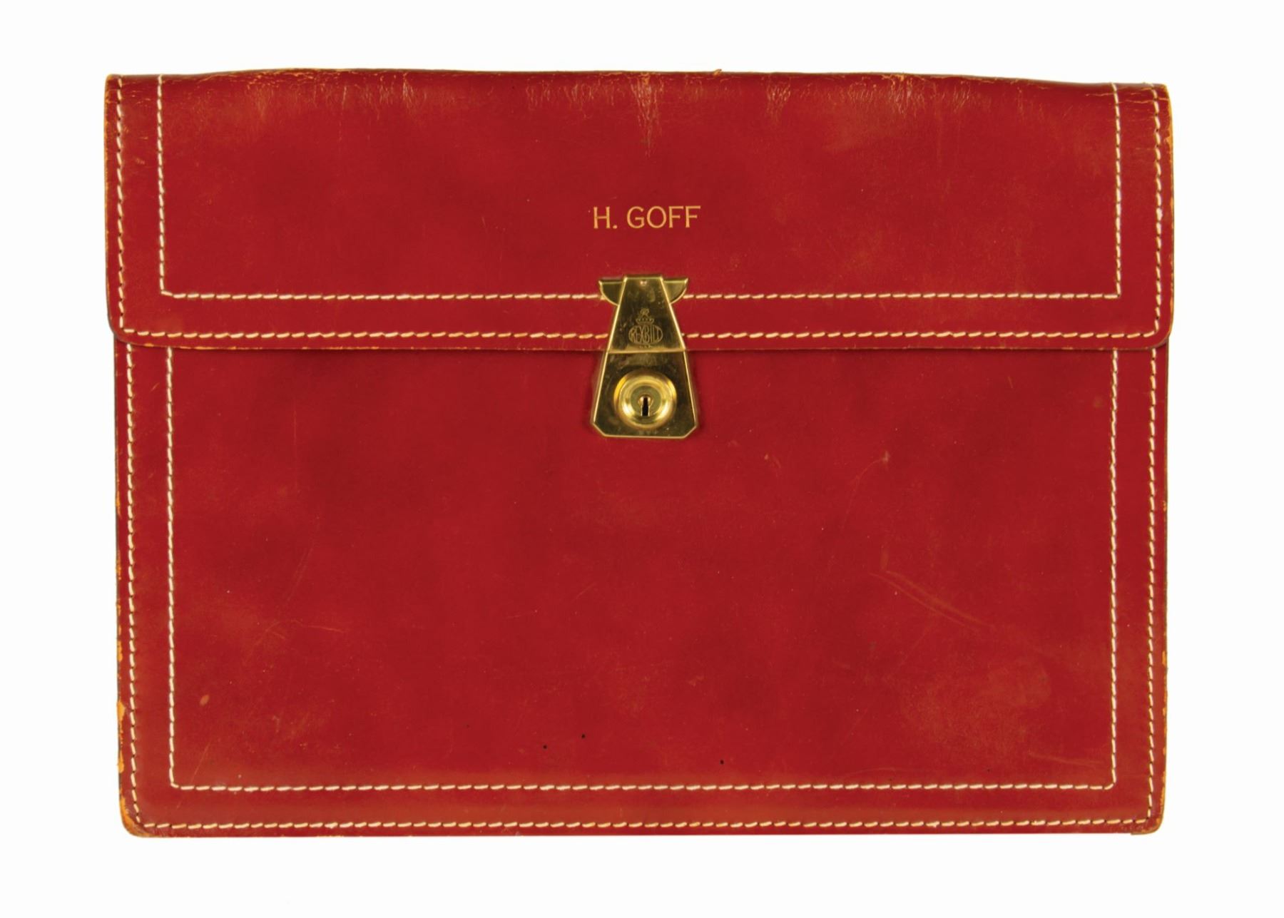 (Goff, c.1980s) A vintage Rexbilt cowhide leather briefcase from the estate of Imagineer Harper Goff. The front of the briefcase features the name "H. Goff" and the three inner compartments are labeled for photographs, letters, and booklets. Measuring 10.5"x15", the briefcase is in good condition overall with wear to the surface from use, particularly along the top-edge. The functioning front clasp latches and opens when pushed down, however no key is included to lock the case.