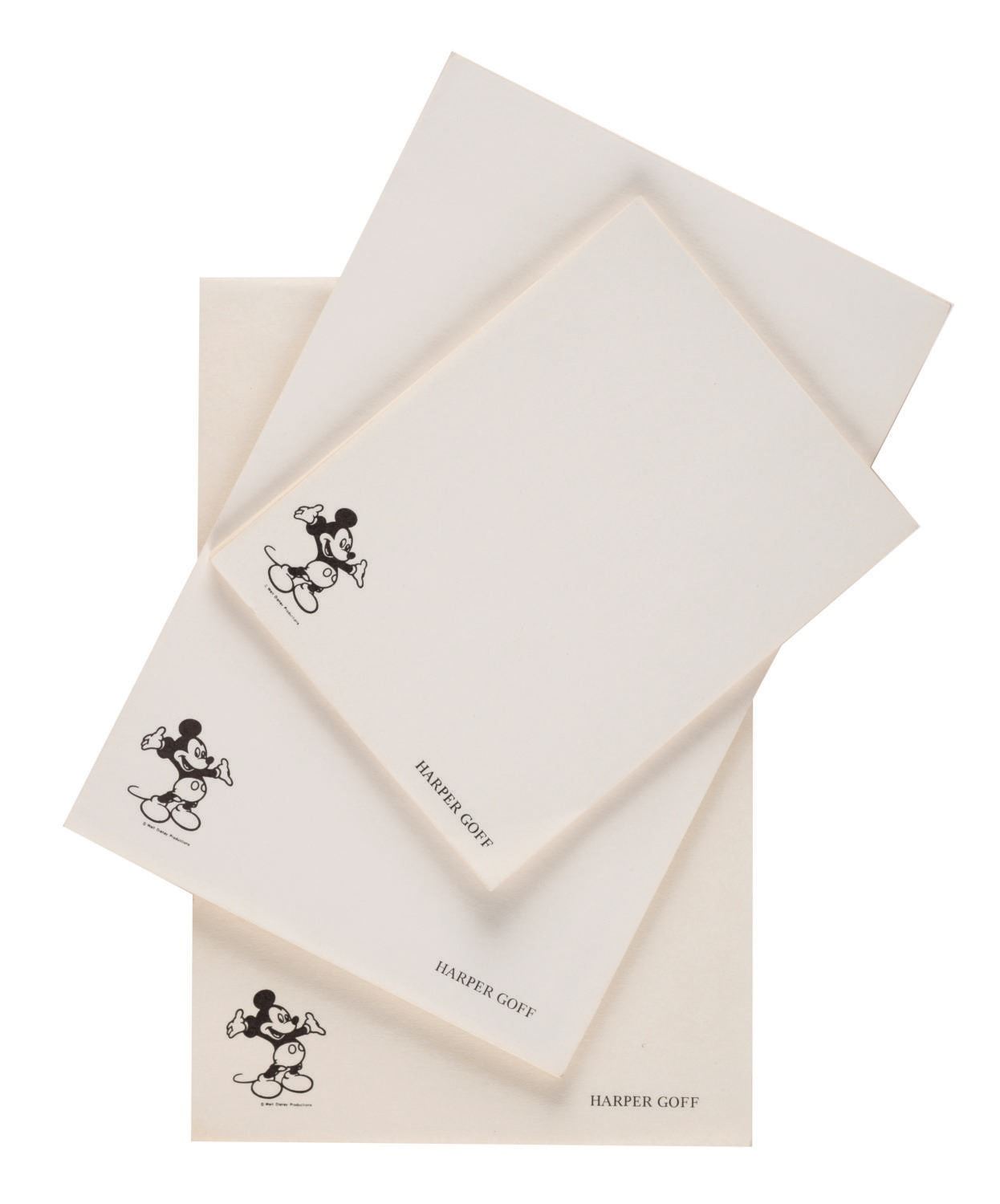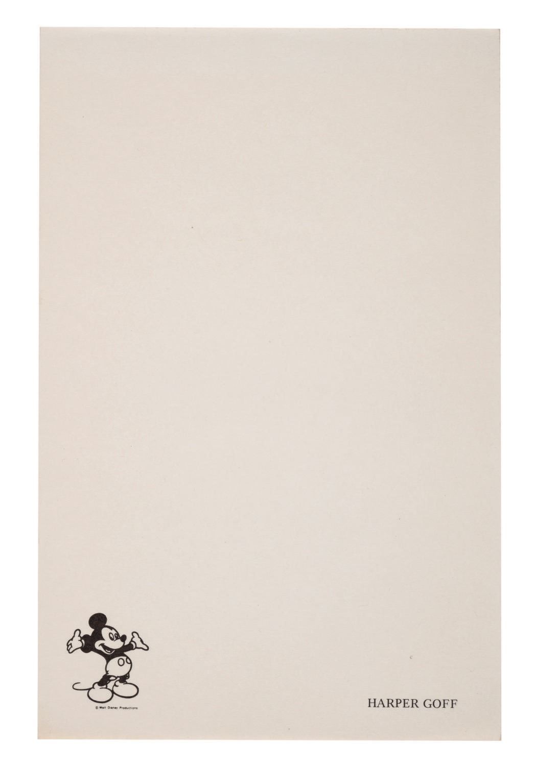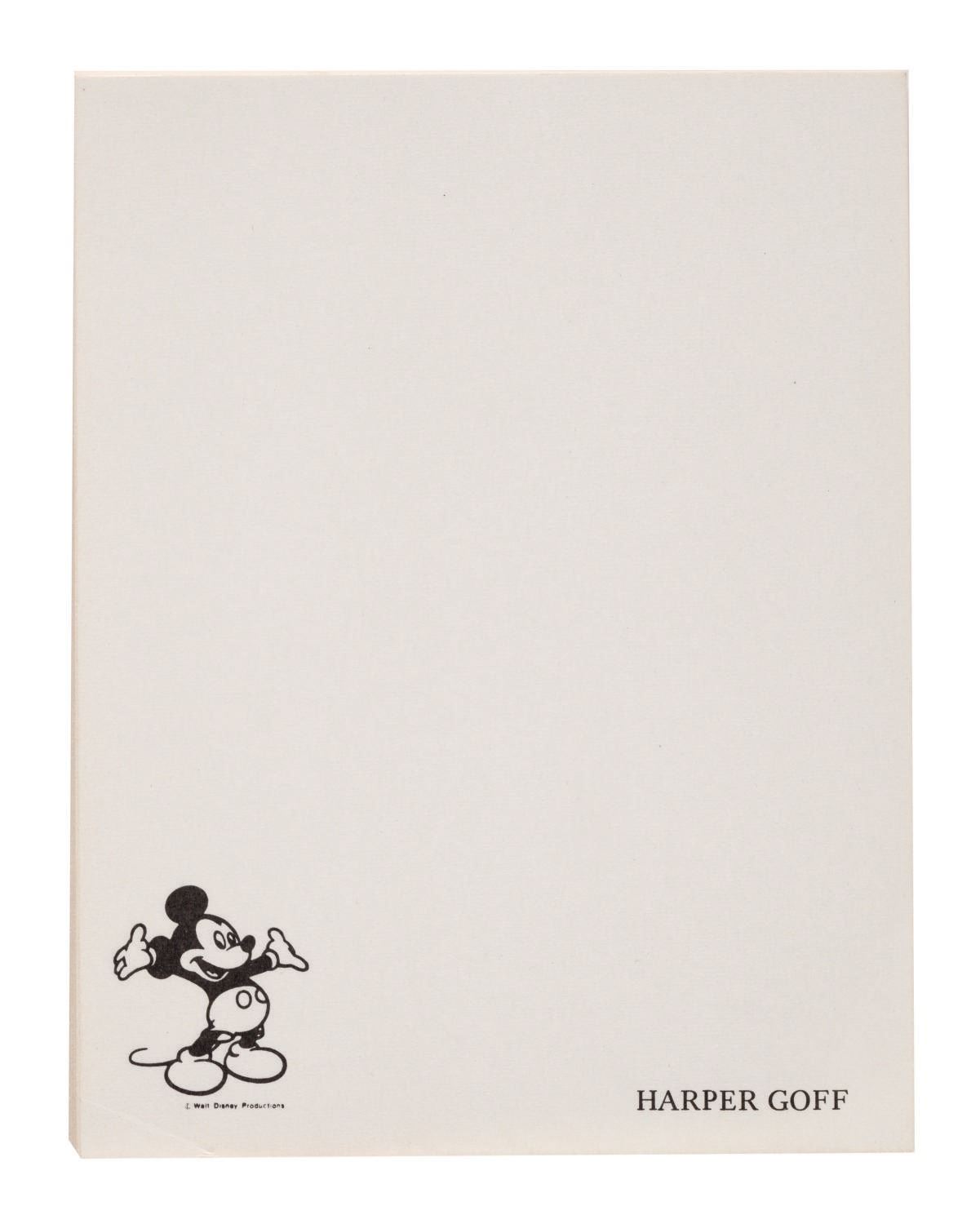 (Disney, 1951-80s) A set of (3) stationery paper pads personalized for Harper Goff of Walt Disney Productions. Harper joined the Walt Disney Company in 1951 and is best known for contributions toward the production of "20,000 Leagues Under the Sea" and The Jungle Cruise at Disneyland. Measuring from 5.5"x4.25" to 8.5"x5.5", the rare collection of ephemera of the Disney Legend is in fine, as-new condition.