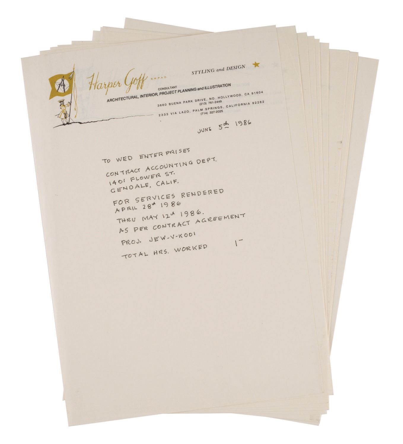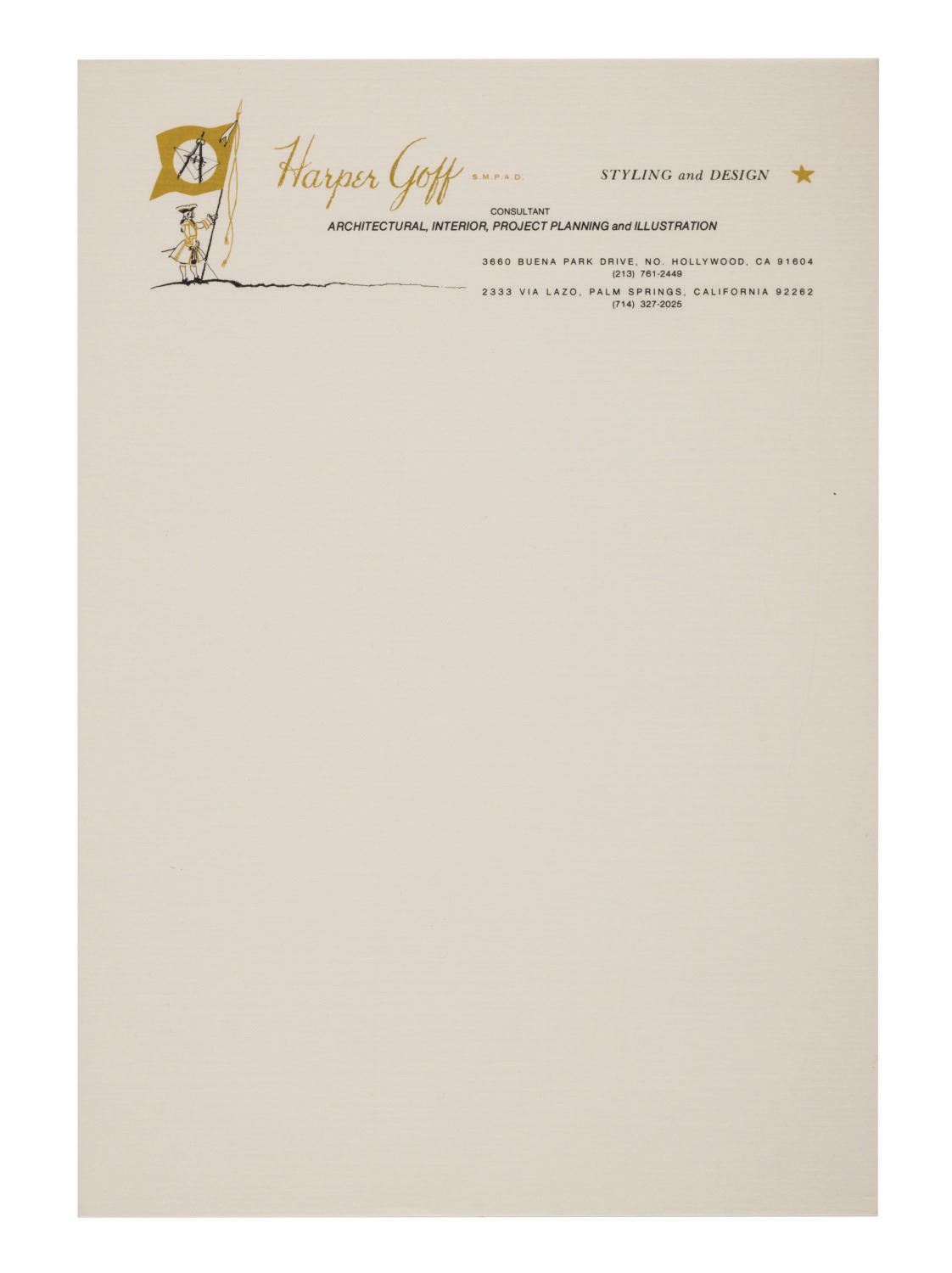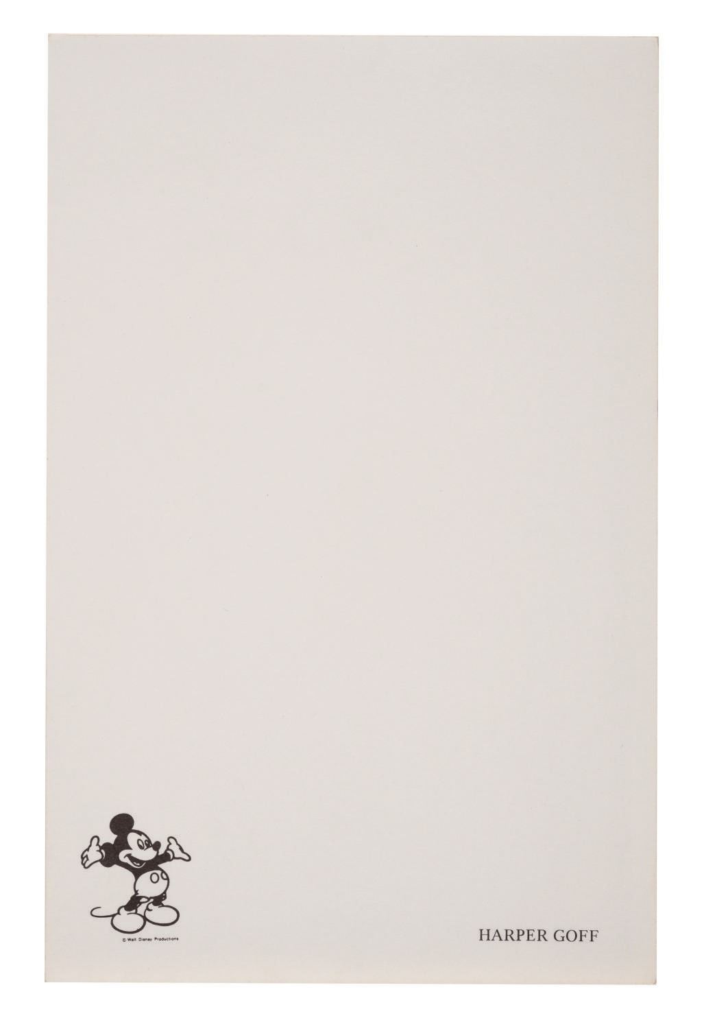 (Disney, 1951-80s) A set of (3) stationery paper pads personalized for Harper Goff of Walt Disney Productions. Harper joined the Walt Disney Company in 1951 and is best known for contributions toward the production of "20,000 Leagues Under the Sea" and The Jungle Cruise at Disneyland. Measuring from 5.5"x4.25" to 8.5"x5.5", the rare collection of ephemera of the Disney Legend is in fine, as-new condition.