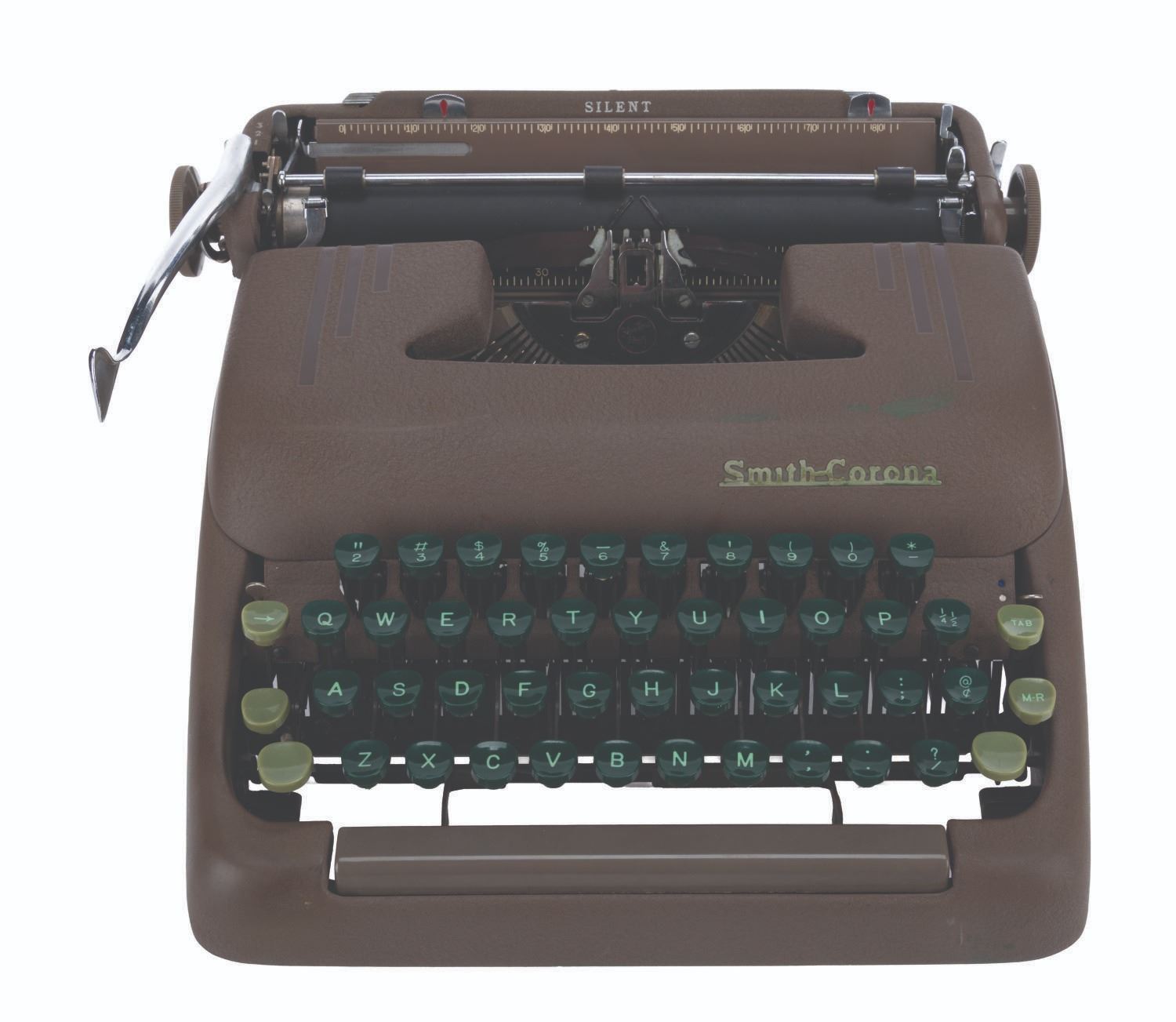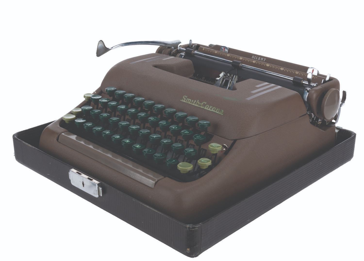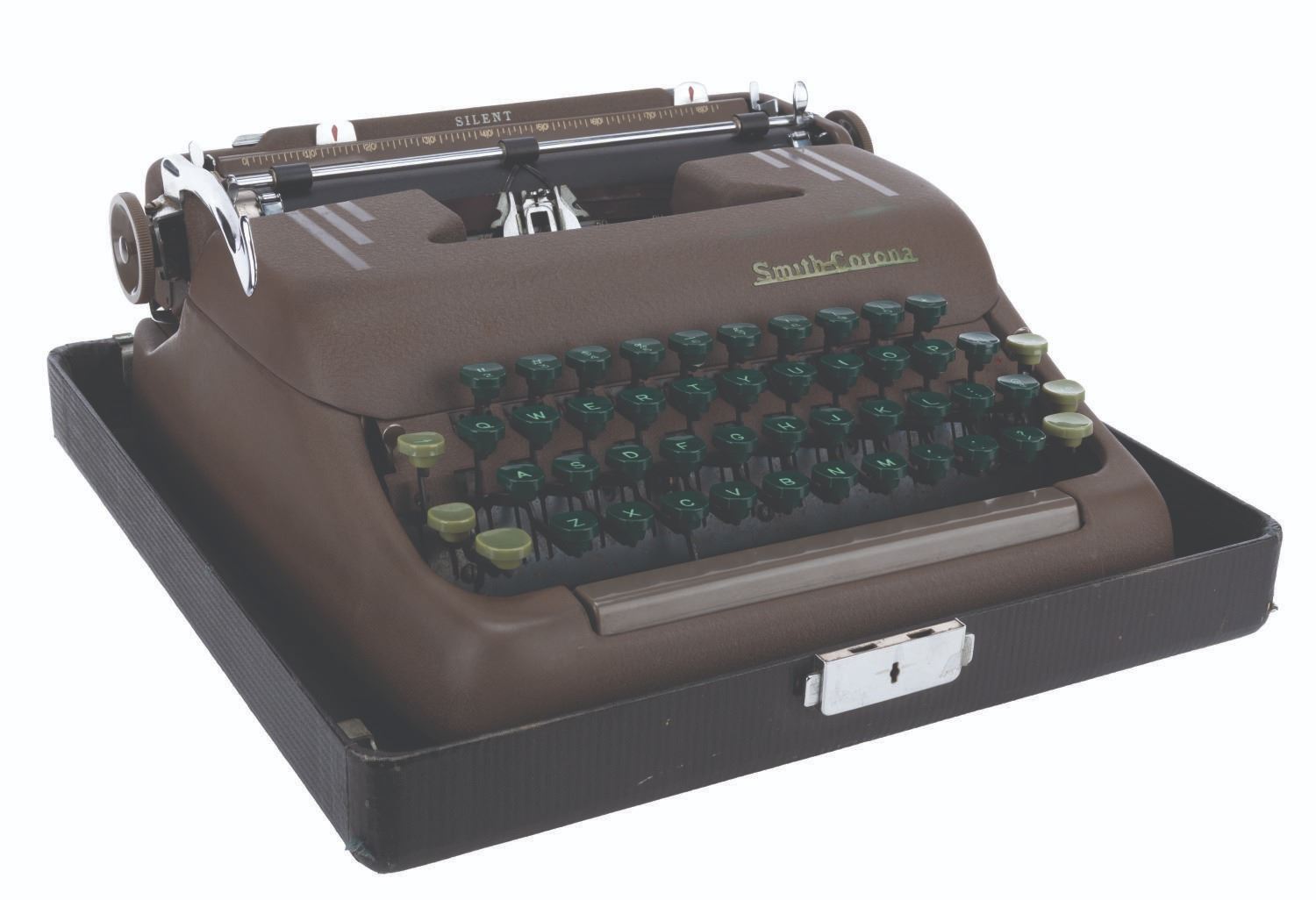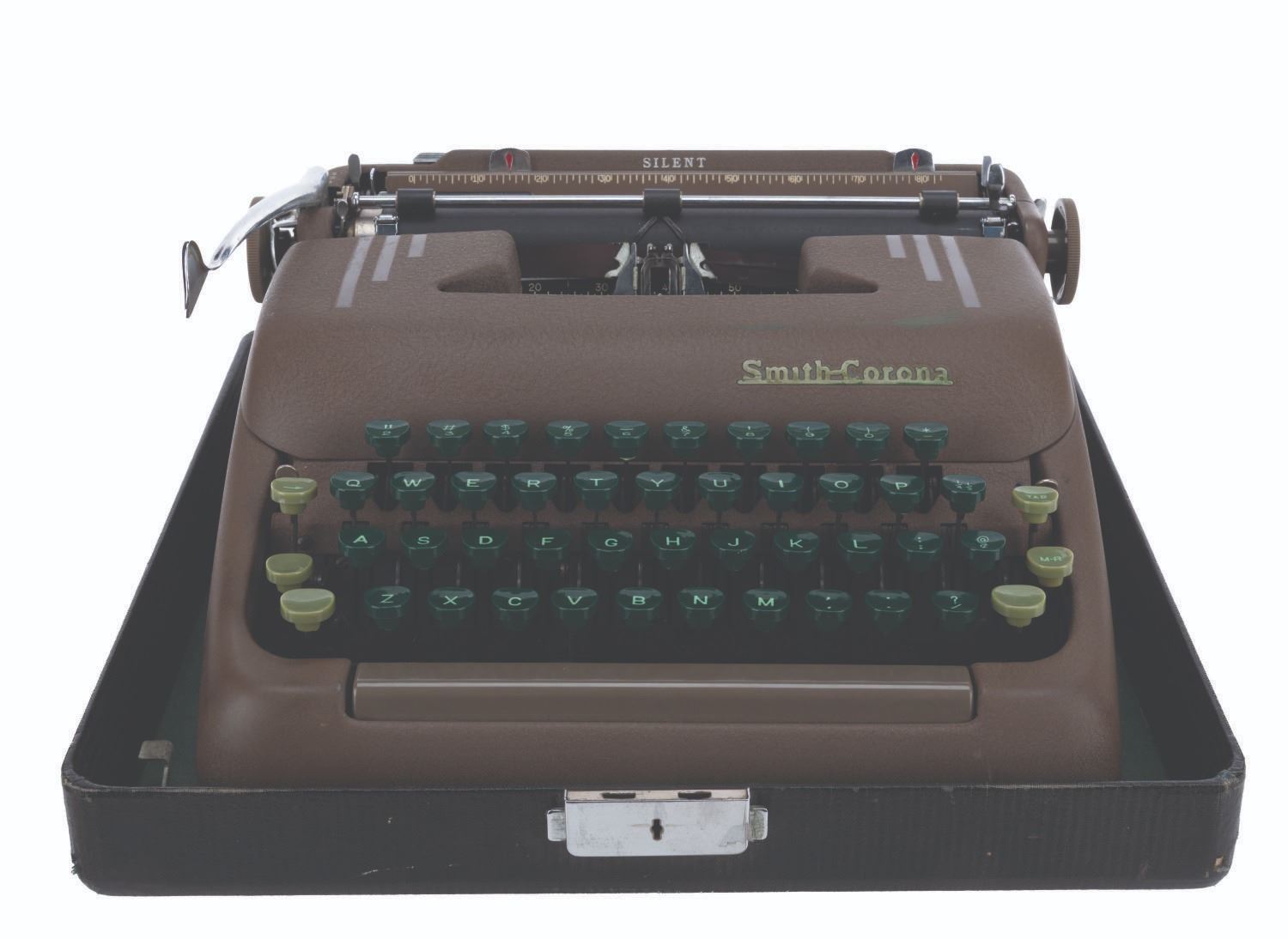 (Smith Corona, 1950s) A Smith Corona typewriter from the collection of Disney Legend Harper Goff. The Smith Corona Silent 5S is a legend in its own right, featuring floating shift and sound dampening to operate at lower levels than standard typewriters. The typewriter has been minimally tested and operates as expected, but may require service for full functionality. Measuring 6.25" x 13.5" x 14" in its original carry case, the typewriter is in very good condition with light scuffing and wear from use, while the case exhibits edge wear, scuffing, soiling, and material loss to the corners.