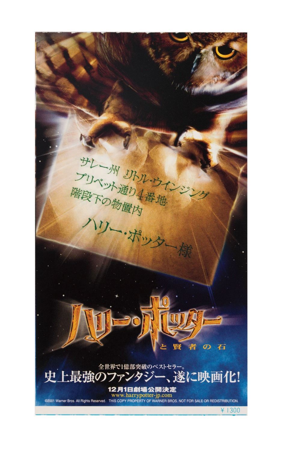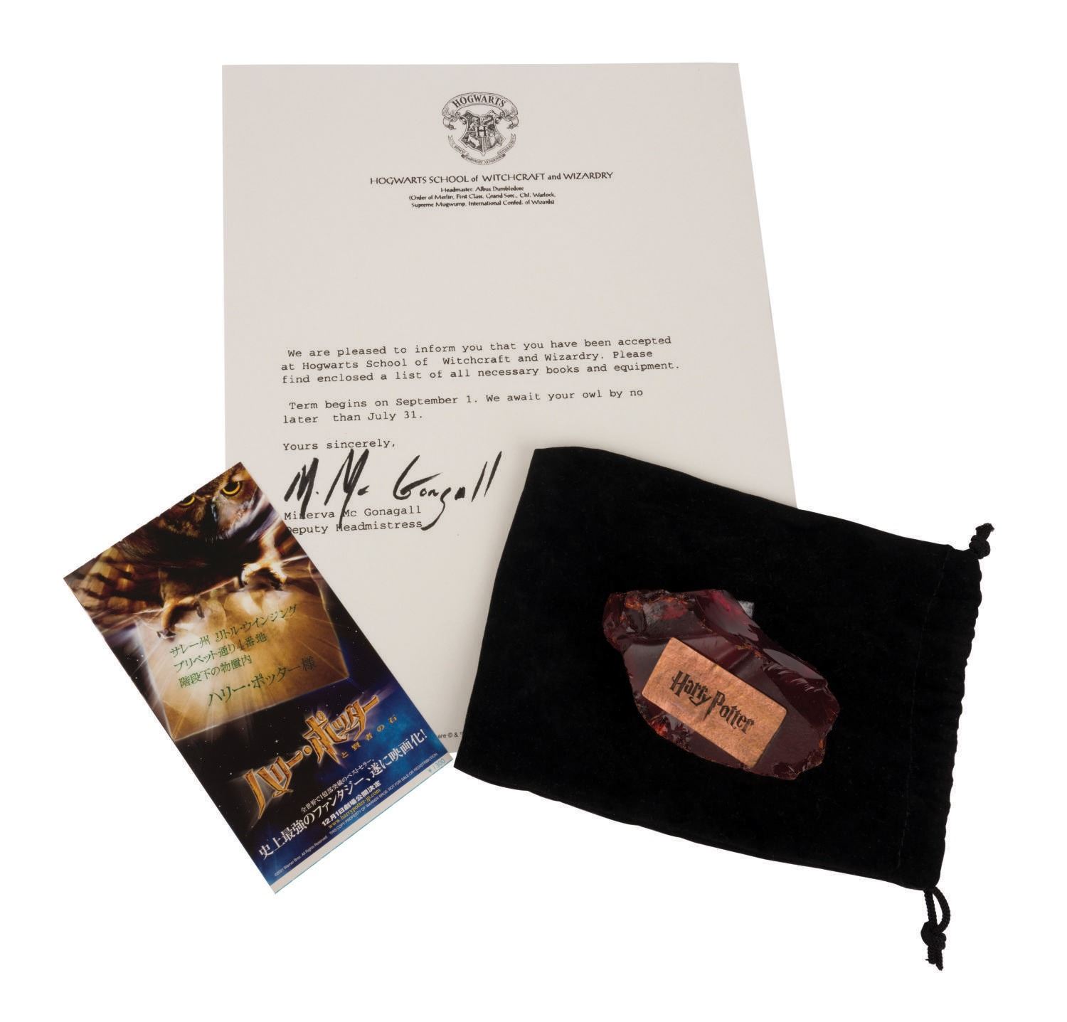 (Warner Bros., 2001) A pair of replica props to promote the release of Harry Potter and the Sorcerer's Stone. Included is an admission letter to Hogwarts School of Witchcraft and Wizardry from Minerva McGonagall, as well as a small black stain bag containing the magical stone that kept Nicolas Flamel alive for so many years. The letter is printed on 11"x8.5" stationary with Hogwarts letterhead, while the stone is approximately 4"x2" and 1.25" tall. The stone features a small metal plaque inscribed "Harry Potter." A small insert promoting the voice cast of the Japanese release of the film is also included.