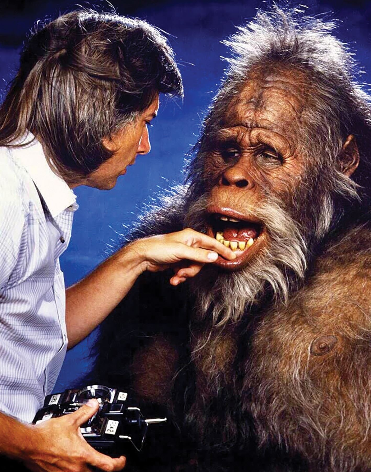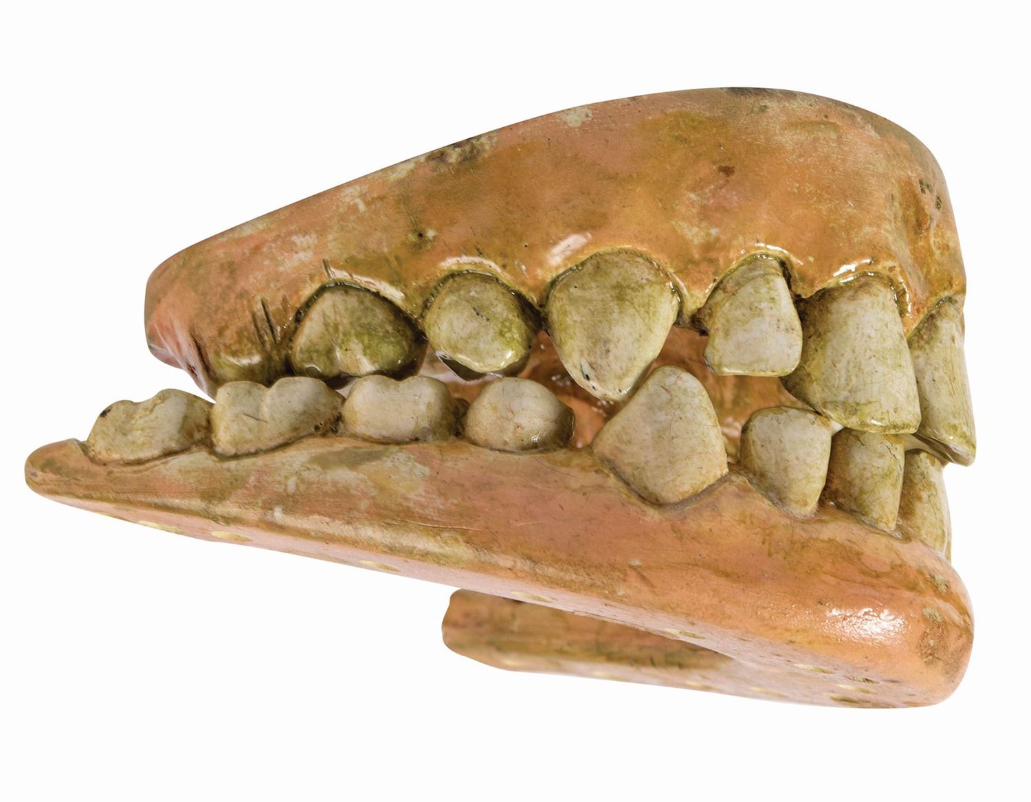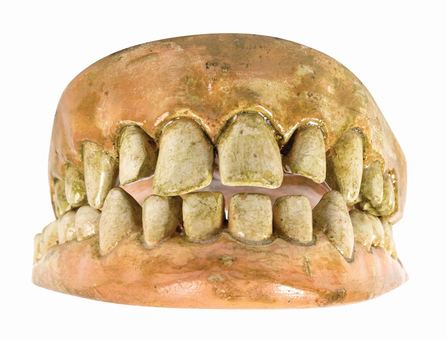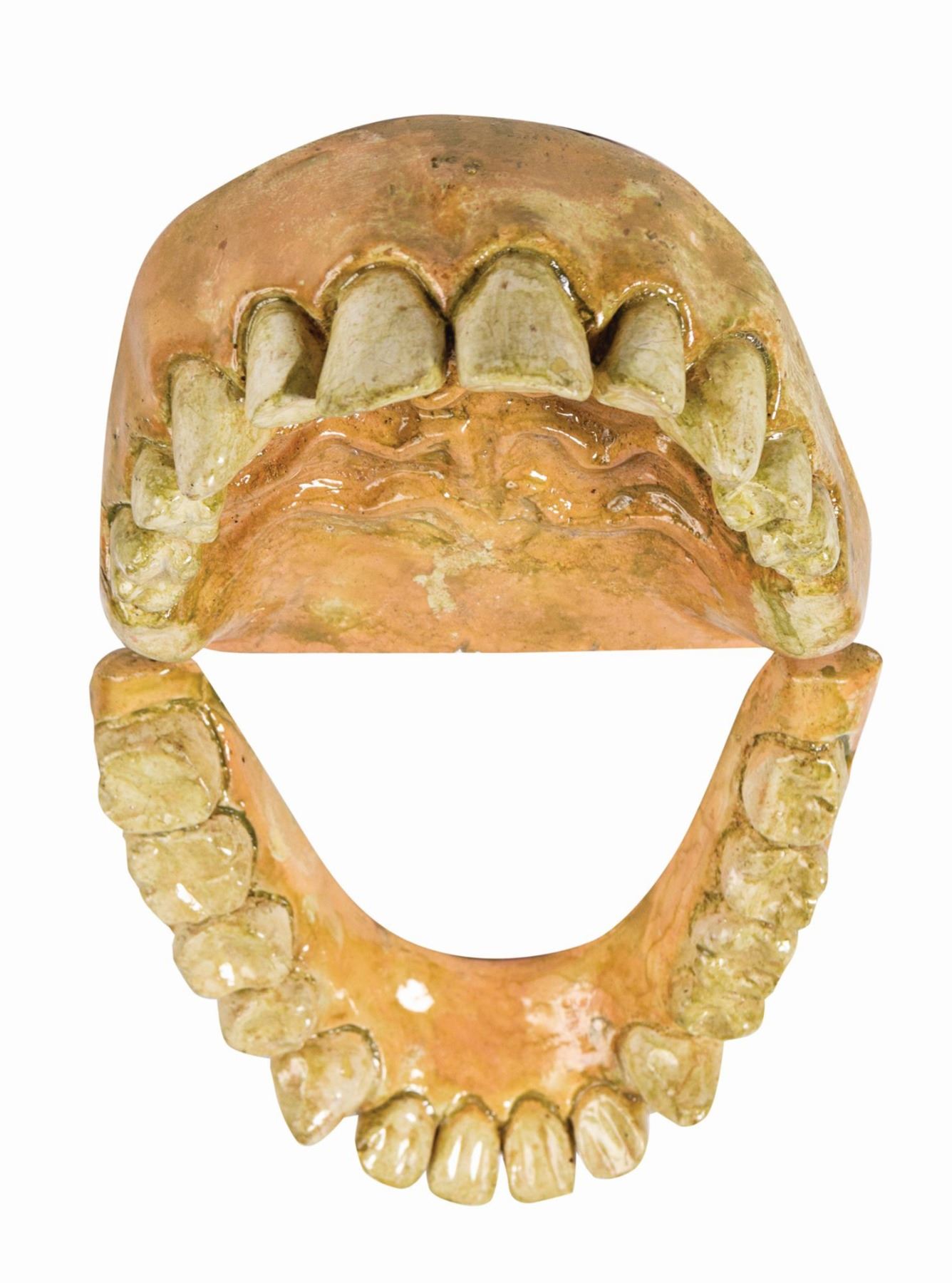 (Universal, 1987) A pair of plaster teeth used in the film Harry and the Hendersons. These teeth come from the test animatronic puppet version of Harry, who was portrayed both in that form and by a live actor in costume. Measuring 4.5"x4.75" and 3.25" tall, the teeth are in good condition with chipping on a few of the teeth and on the palate. The teeth have been covered in a glossy layer to preserve the paint. It is unclear whether the staining throughout is a prop effect or discoloration from age.