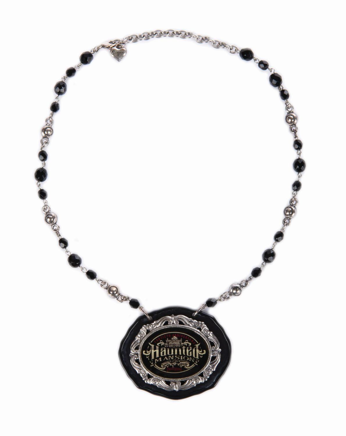 (Disneyland, 2014) A very rare necklace created for the 40th anniversary of the Haunted Mansion. The Karyn Cantor Collection necklace features the special 40th anniversary Haunted Mansion logo on the pendant, with a mixture of black and metal beads along the chain that complete the look. The pendant measures 2"x2.5" and the necklace is in very good condition. The original box is included.