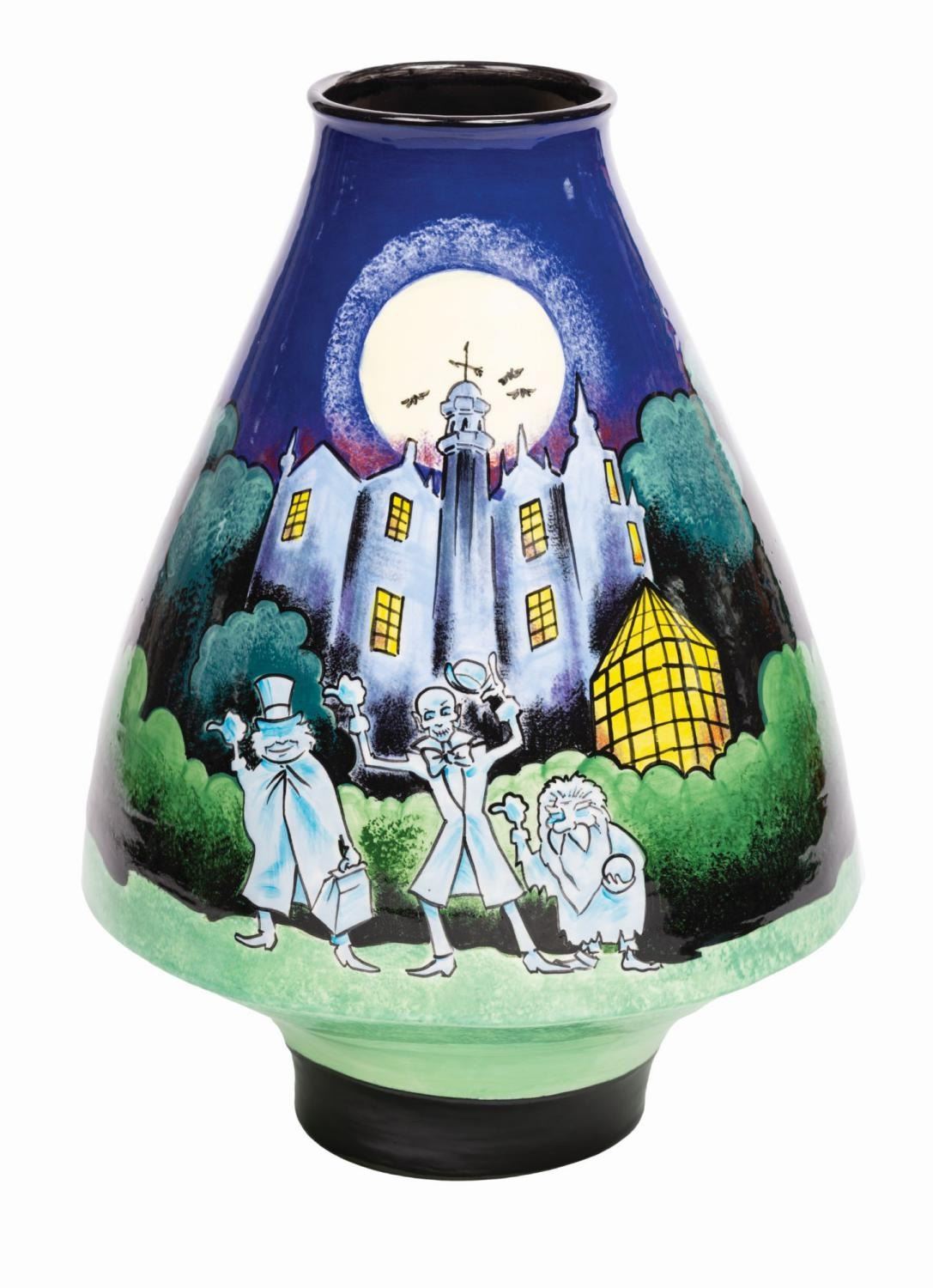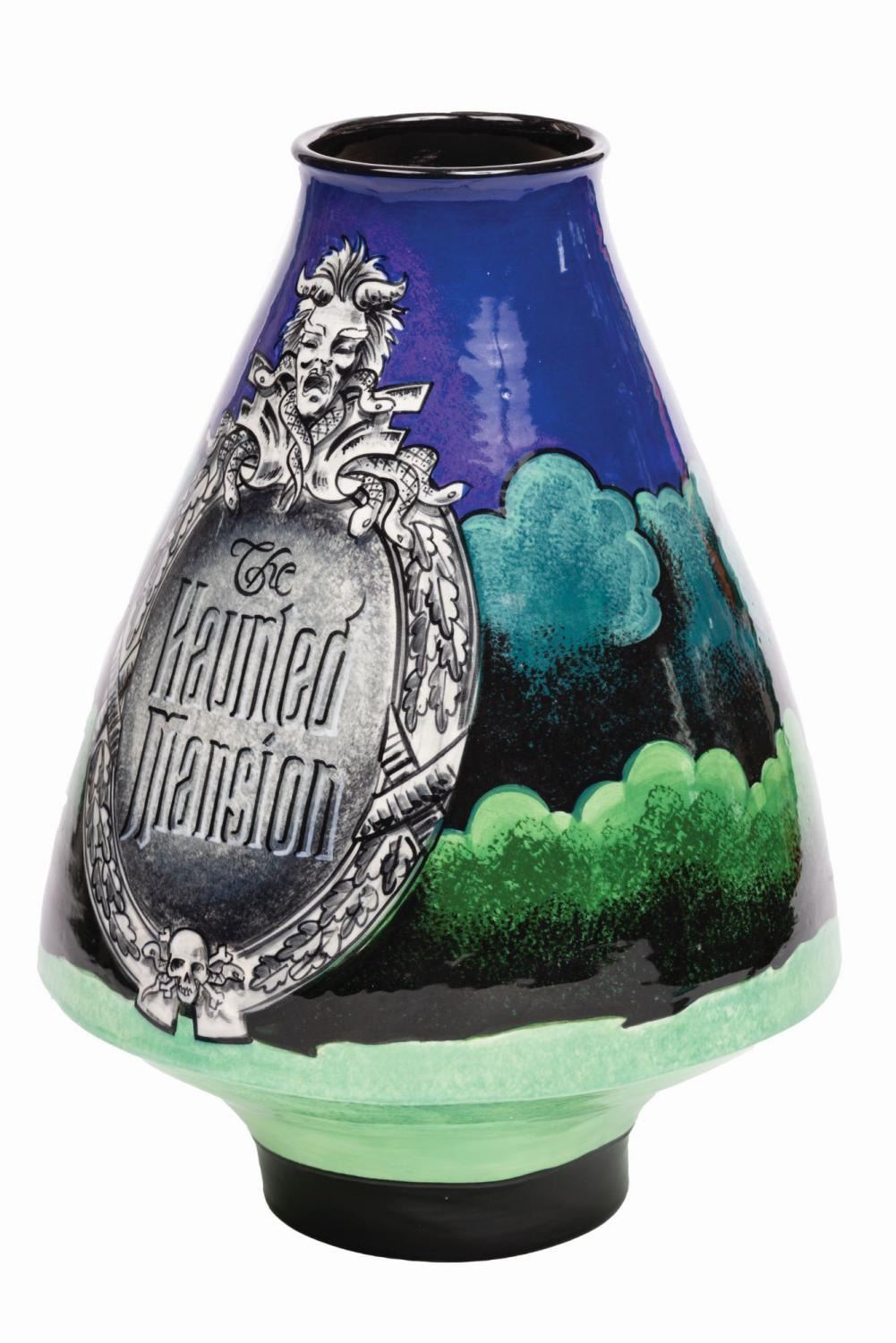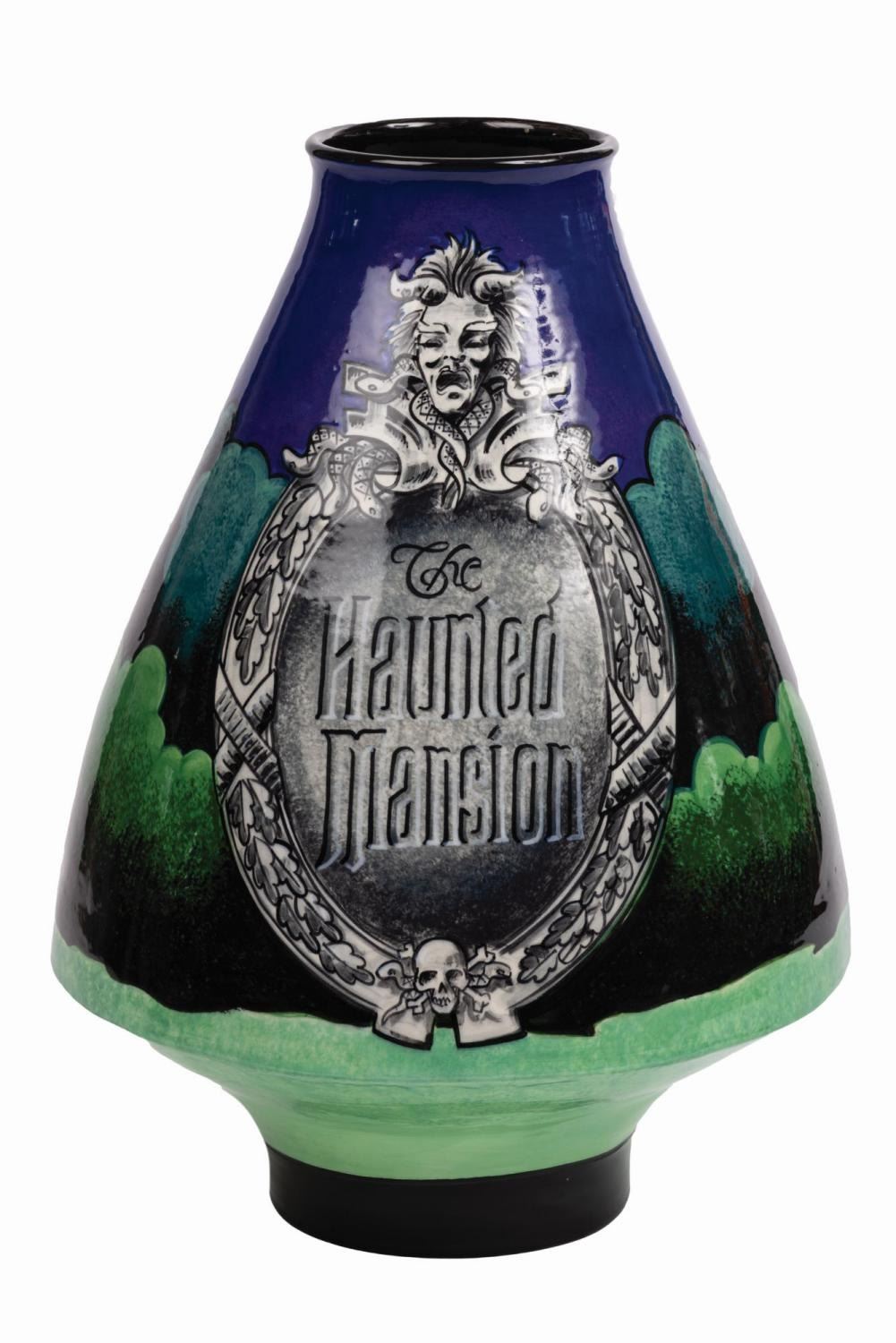 (Disneyland, 2014) A very rare hand-painted ceramic vase created for the Haunted Mansion's 45th anniversary. The vase was created by artist Elisabete Gomes in an edition size of only 25, of which this is number 9. One side depicts the famous gate plaque, while the other depicts the popular Hitchhiking Ghosts. Standing 16" tall, the vase is in very fine condition.