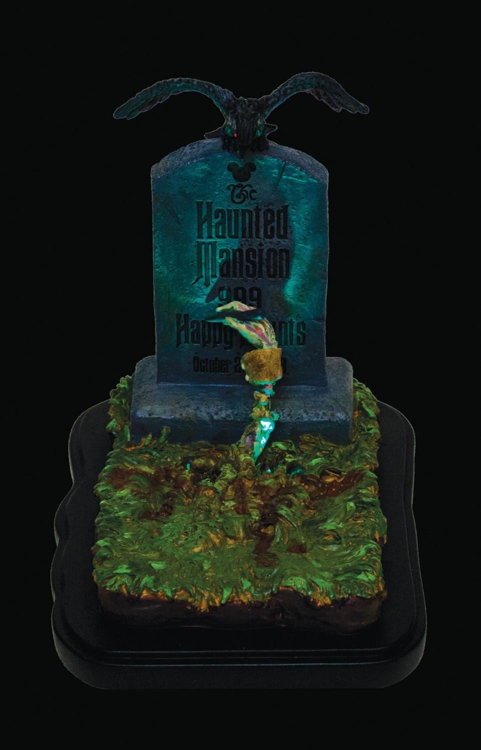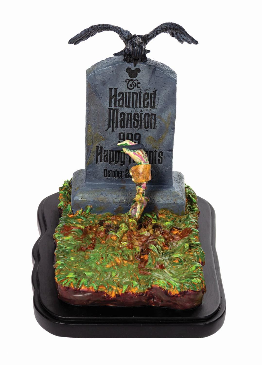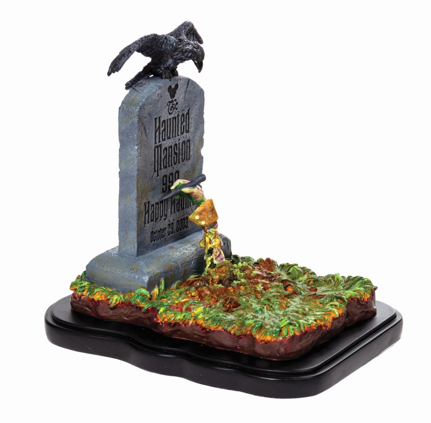 (Walt Disney World, 2003) A limited edition electronic sculpture titled "A Gift From the Ghouls You've Seen Tonight" designed by artist Ryan Noble for the 999 Happy Haunts event in 2003. The cast resin sculpture features a corpse arm reaching from the grave to write on a tombstone with a raven perched atop. Integral LED lights and a raven call sound effect are controlled by a slider switch on the reverse of the integral base. The electronics are in working order. The sculpture is one of only 1,200 and includes its original packaging. Measuring 8.5"x6.5" and 8.5", the piece is in fine condition with minimal wear. The box measures 9.5"x11.25" and 10.75" deep and exhibits creasing and handling.