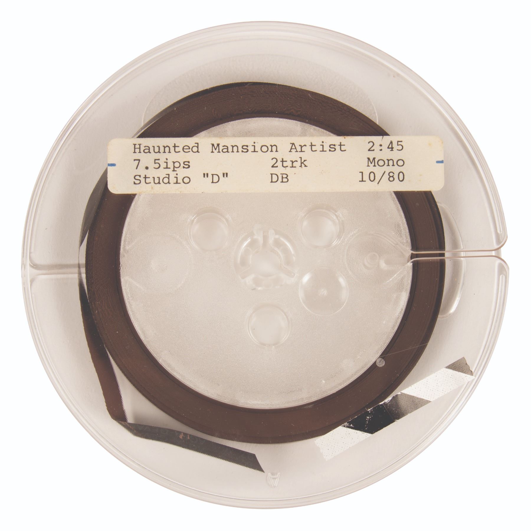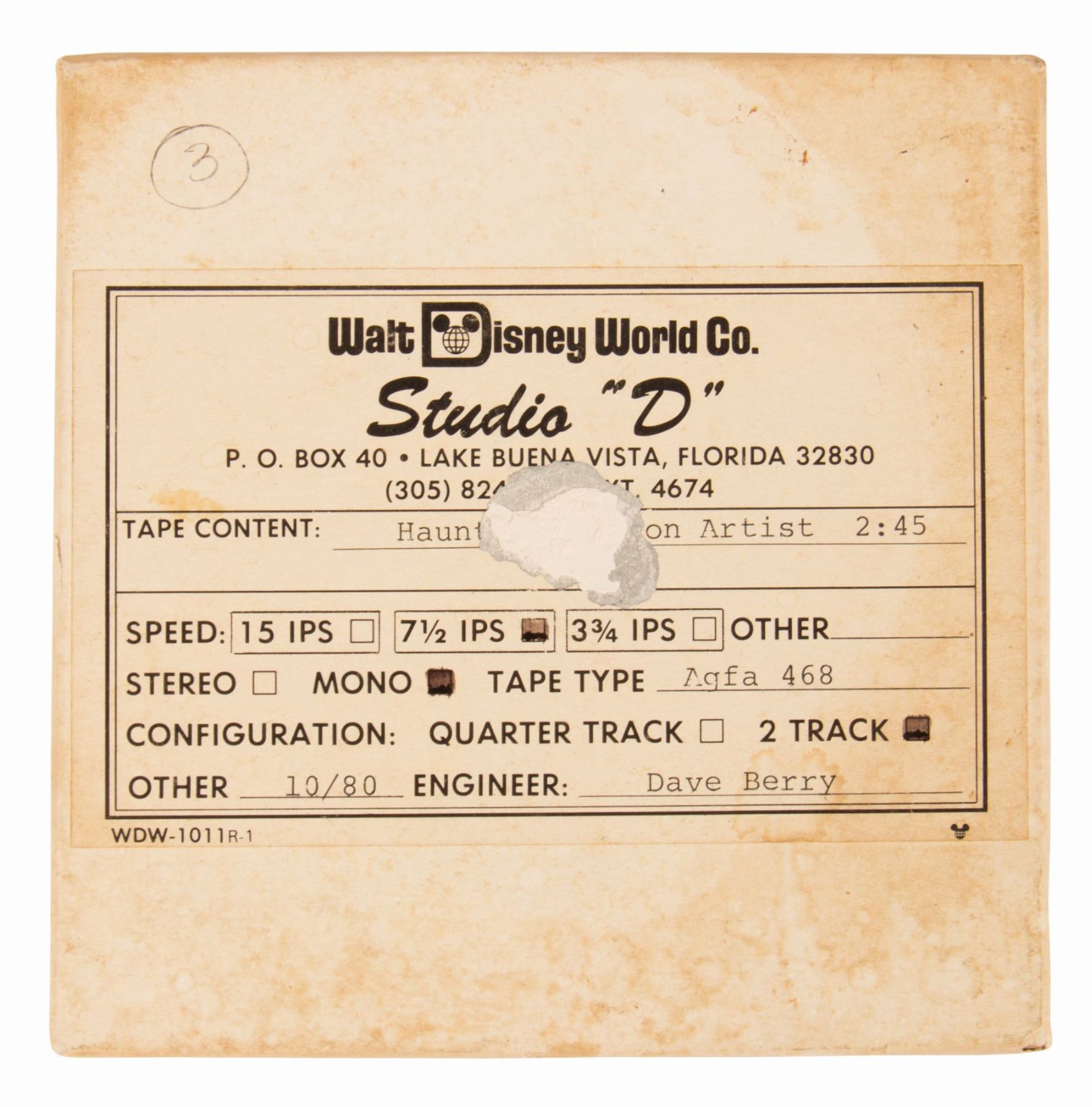 (Walt Disney World, 1980) An original audio tape recording created for the Haunted Mansion at Walt Disney World. This tape was created in October of 1981 and is titled "Haunted Mansion Artist." The tape comes in its original box with the Walt Disney World Co. Studio "D" project label on the lid. The tape is marked as 7 1/2 IPS, 2 track, and having a duration of 2min and 45sec. The audio tape has not been tested but appears to be in very good condition, with some creases in some of the tape at the end of the reel.
