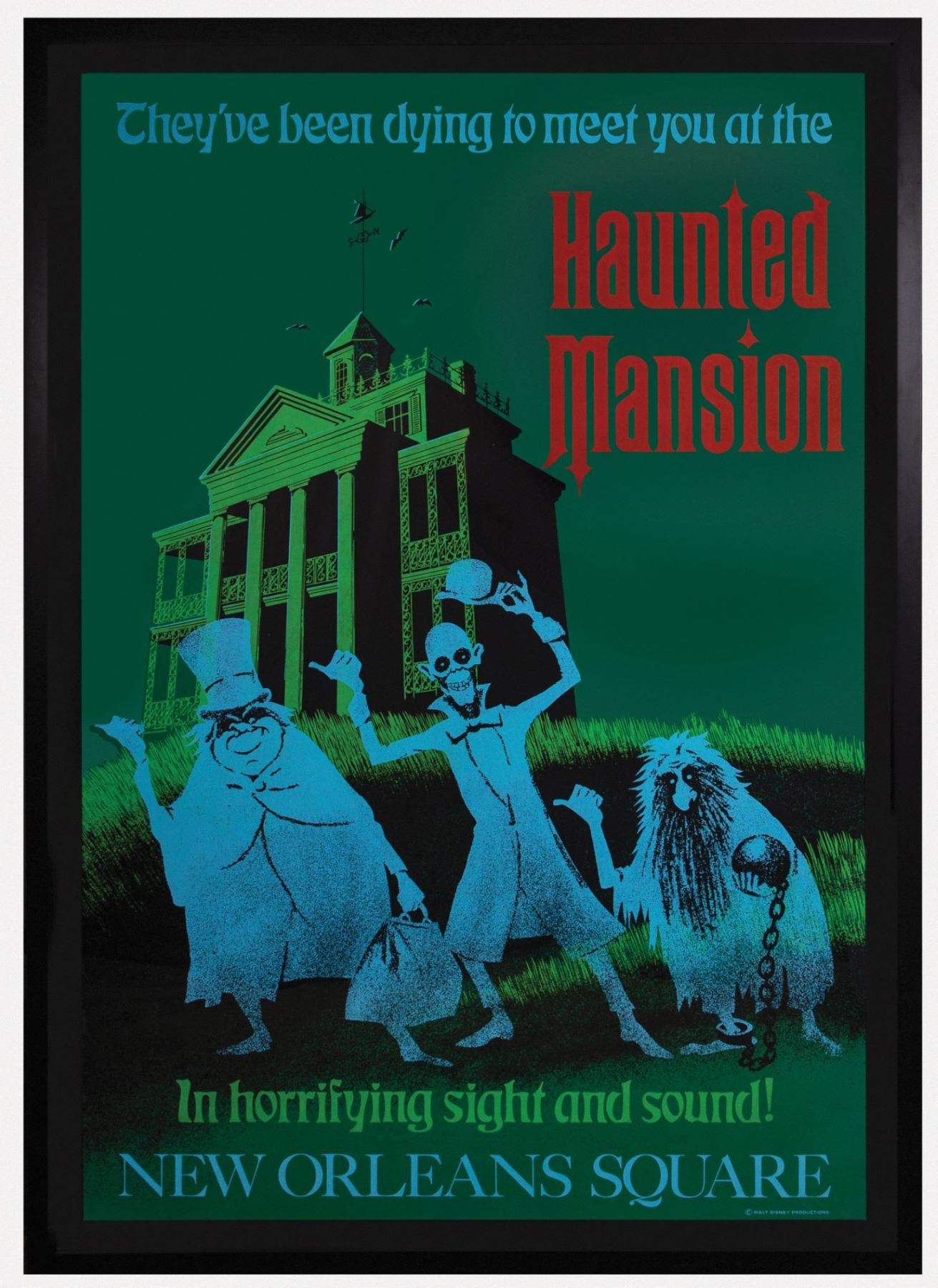 (Disneyland, 1969) An original hand-silkscreened attraction poster for Disneyland's Haunted Mansion. This poster was designed by Imagineers Ken Chapman and Marc Davis and features iconic imagery of the Hitchhiking Ghosts in front of the Mansion itself. This poster is one of the most sought-after early attraction posters due to the continued popularity of the attraction as well as its stunning imagery. The poster measures 54"x36" and is framed to 58.5"x40.75". The poster has been unexamined out of frame, but appears to be in overall good condition with a few minor creases, small scuffs, and some small spots of color wear, particularly near the bottom-left corner. The poster has been linen-backed for its preservation.