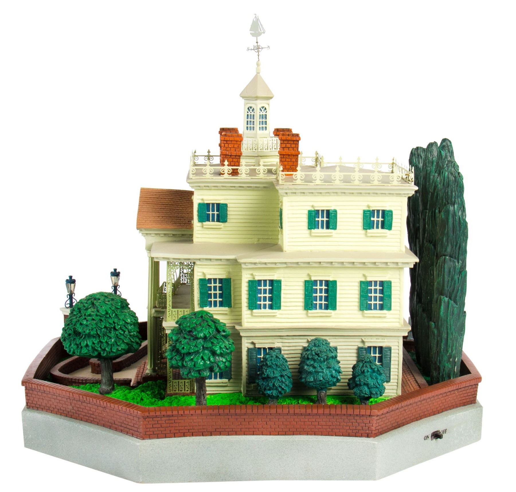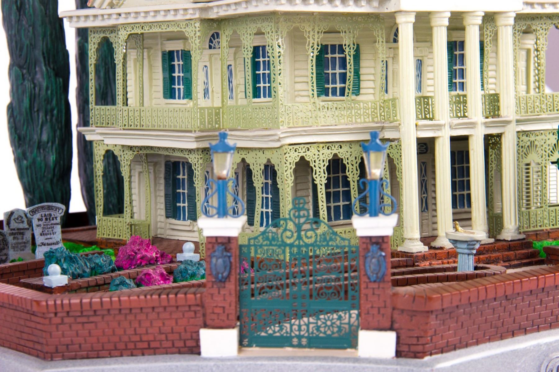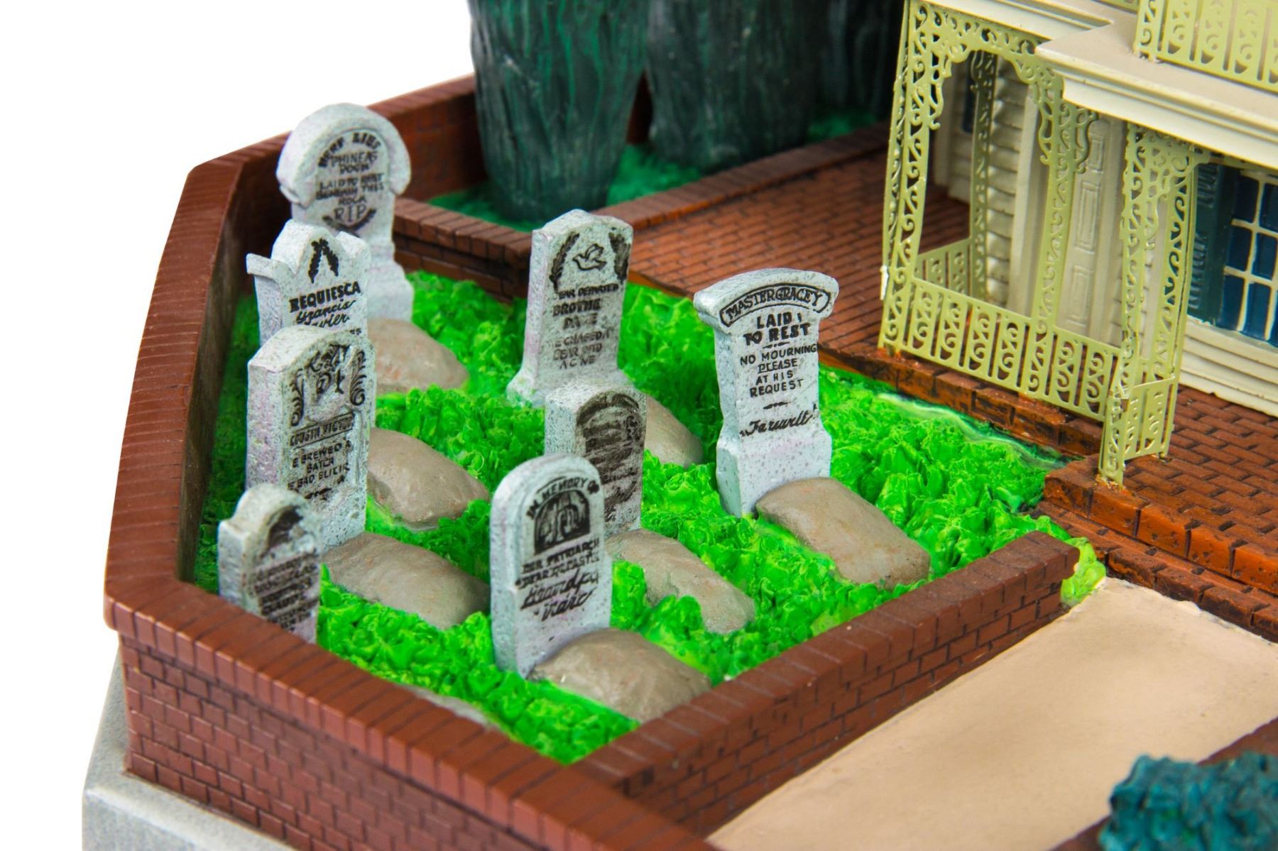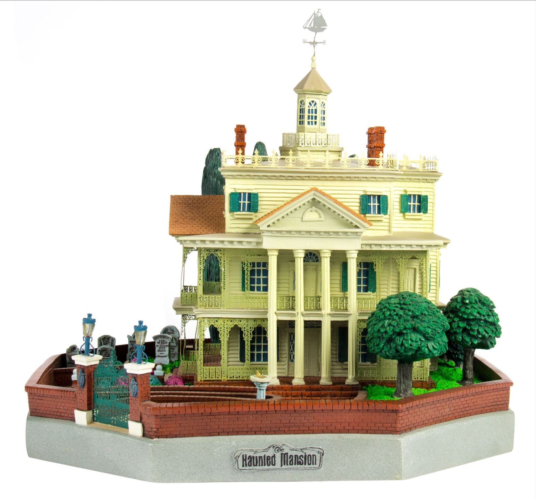(Disneyland, 2004) A stunning "Magical Big Figurine" created by Larry Nikolai for the 35th Anniversary of the "Haunted Mansion". This "Big Fig" depicts a small-scale version of the attraction including a small graveyard. This big fig is battery-operated with lights throughout and sounds that play when some of the tombstones are pushed on. This item measures approximately 16" in diameter and 14" tall, and is in very good condition with little wear.