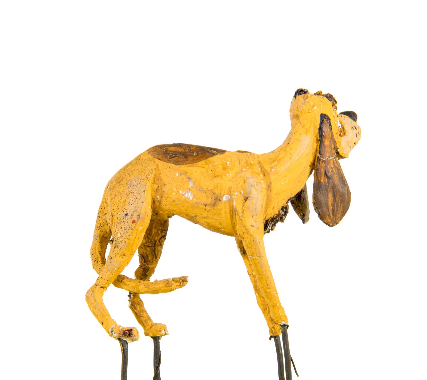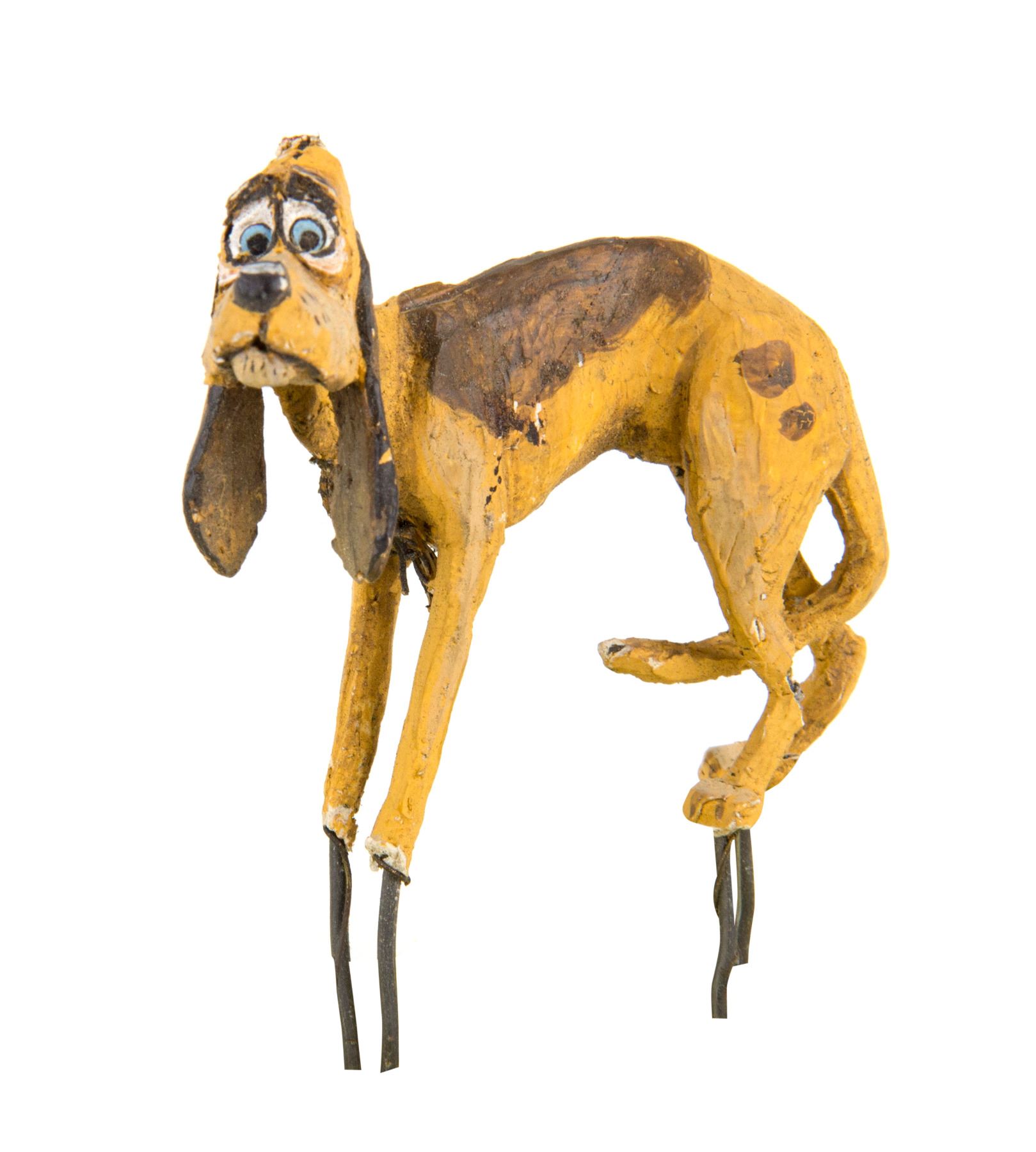 (Disneyland, c.1960s) An incredibly rare maquette of the scared dog that accompanies the caretaker within the graveyard scene of Disneyland's "Haunted Mansion". This very rare maquette was created in hand-painted resin with metal foot supports. While the color palette of the dog has changed over time, his familiar body position, with his tail between his legs, worried expression, and right foot back, has remained nearly identical throughout the years to this model. The maquette measures 3.5"x3", including the metal supports, and is in good to very good condition, with some chipping and wear from use. Original character models for the "Haunted Mansion" are some of the rarest and most sought-after Disneyland collectibles, with this example representing a humorous and beloved part of the fan-favorite attraction.