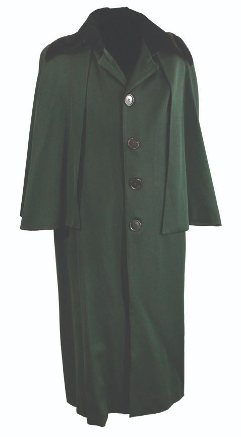 (Disneyland, c.1980s) A very rare Cast Member cloak for Disneyland's "Haunted Mansion". This cloak is accomplished in the Mansion's familiar green and black pattern, and includes a shoulder cape which is attached along the neckline. The cloak features an older style Disneyand wardrobe tag inside and is marked as a size 42-L. The cloack is in very fine condition with minor wear from use.