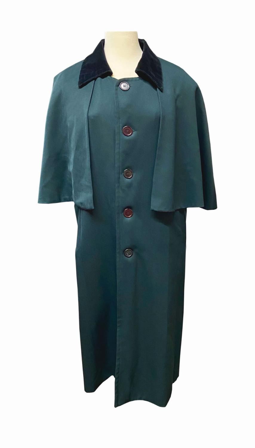 (Disneyland, c.1990s) A park-worn cast member cape-style overcoat from Disneyland's Haunted Mansion. The sleeveless overcoat is constructed of synthetic fabric in the attraction's signature shade of dark green. It retains its Disney wardrobe label and a size "L" tag. It is in very good condition, with only minor wear overall.