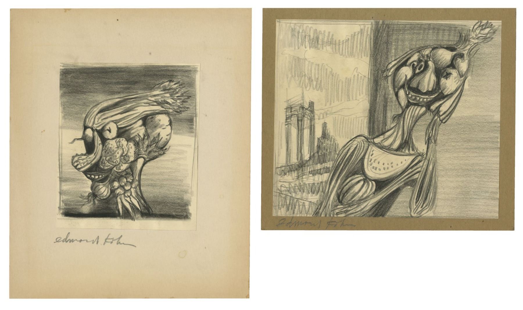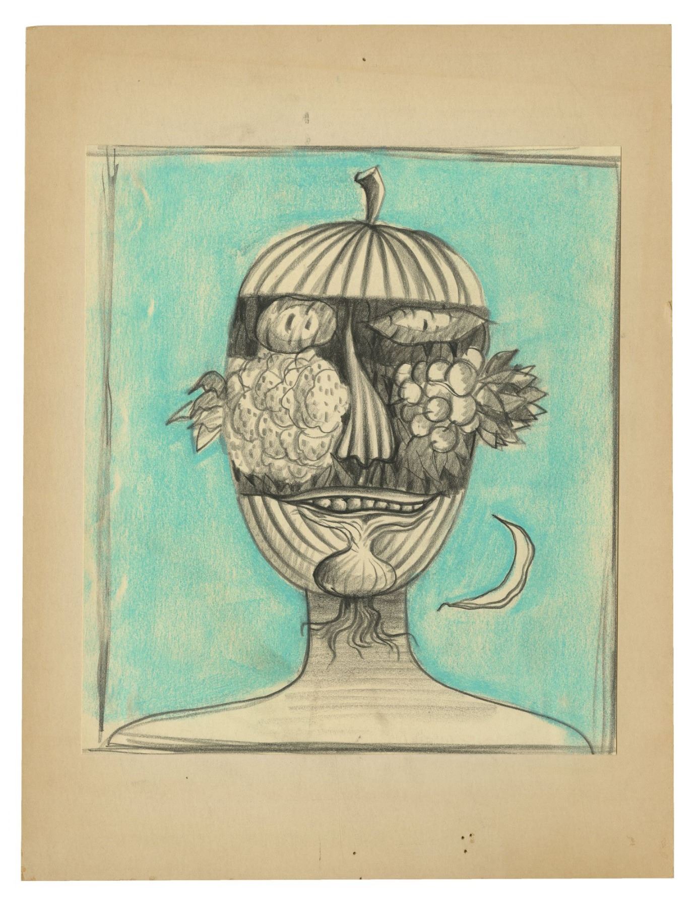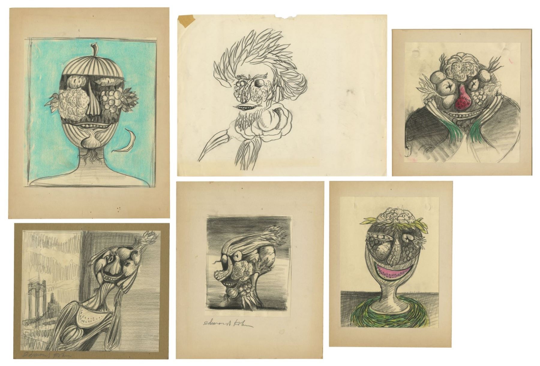 (Disneyland, 1960s) A set of (6) original concept drawings created by Imagineer Ed Kohn for a proposed changing portrait to be used within Disneyland's Haunted Mansion. The drawings depict alternate versions of a man transforming into fruits and vegetables. Two of the concepts are signed by Kohn along the lower-edge. Five of the drawings are mounted to board. These designs range in size from 7.75"x7.5" to 11.25"x8.5" and are in very good condition overall with some general wear throughout from use. The non-mounted drawing has some small tears around the edges of the paper.