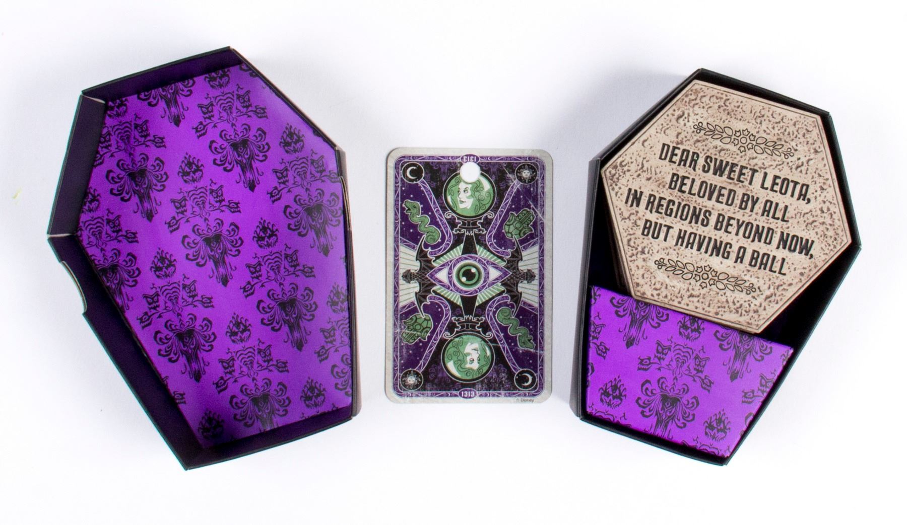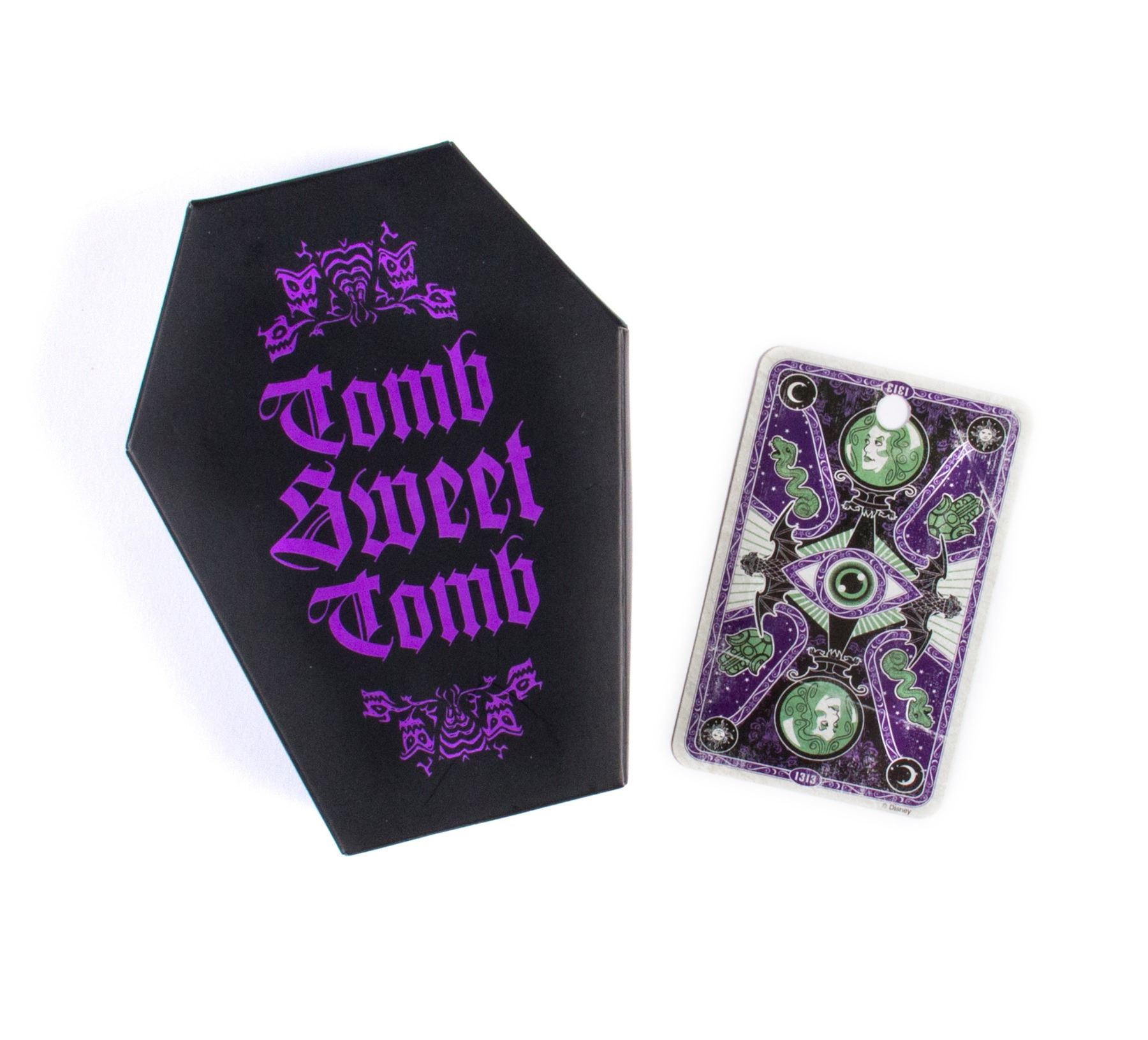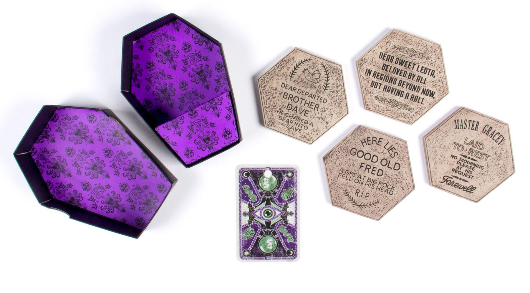 (Disneyland, c.2000s) A set of (4) coasters themed after the popular tombstones in the "Haunted Mansion" attraction. The coasters come in a coffin-shaped "tomb sweet tomb" box and the set includes the Madame Leota card. Each coaster measures approximately 3.5" in diameter and the set is in overall very good condition.