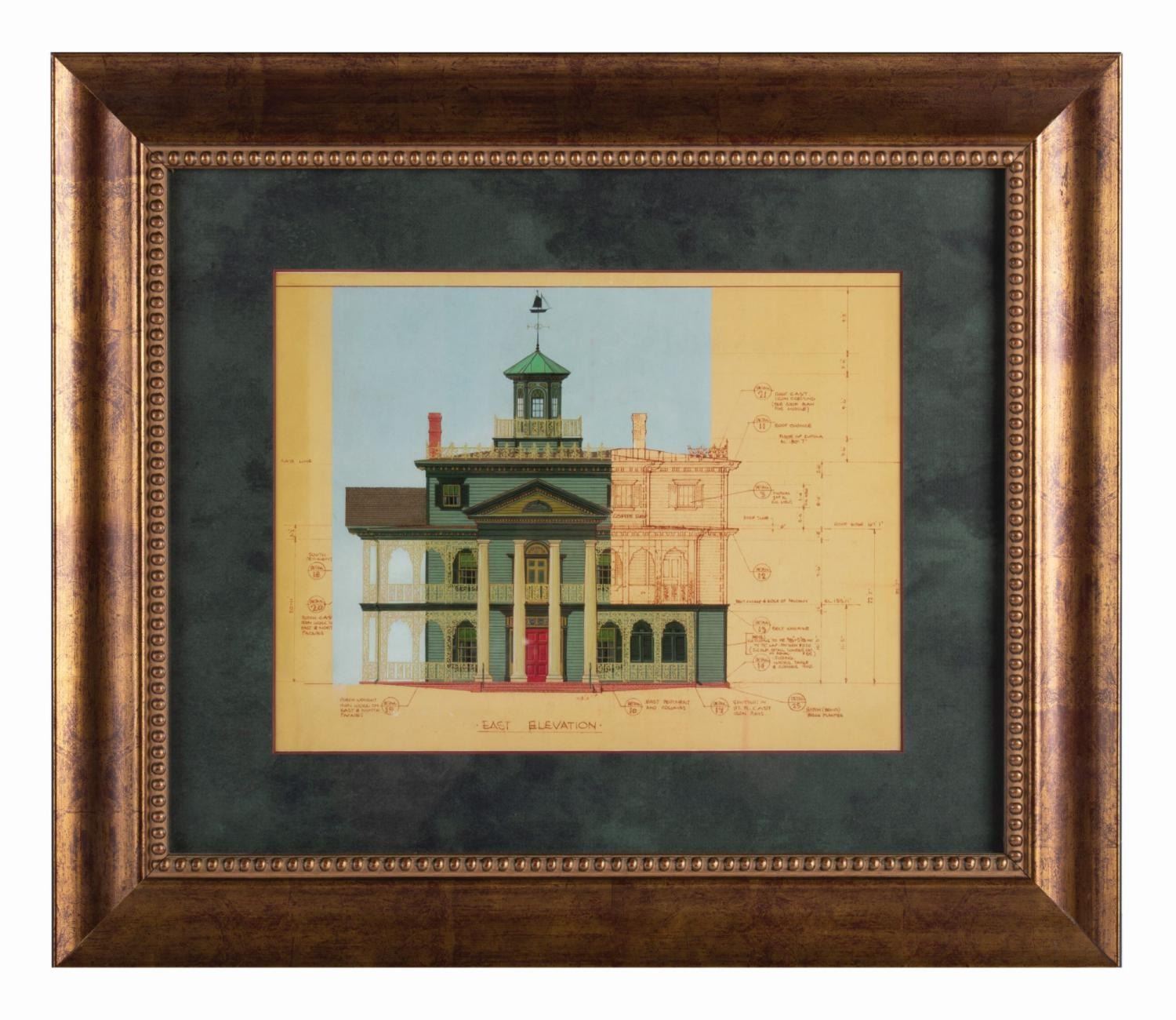 (Disneyland, c.1990s) A limited edition print showing East Elevation blueprint imagery from the construction of the Haunted Mansion attraction. Measuring 9"x11.75" visible through an ornate 17.25"x20" frame, the piece is appears to be in fine condition with minimal wear.