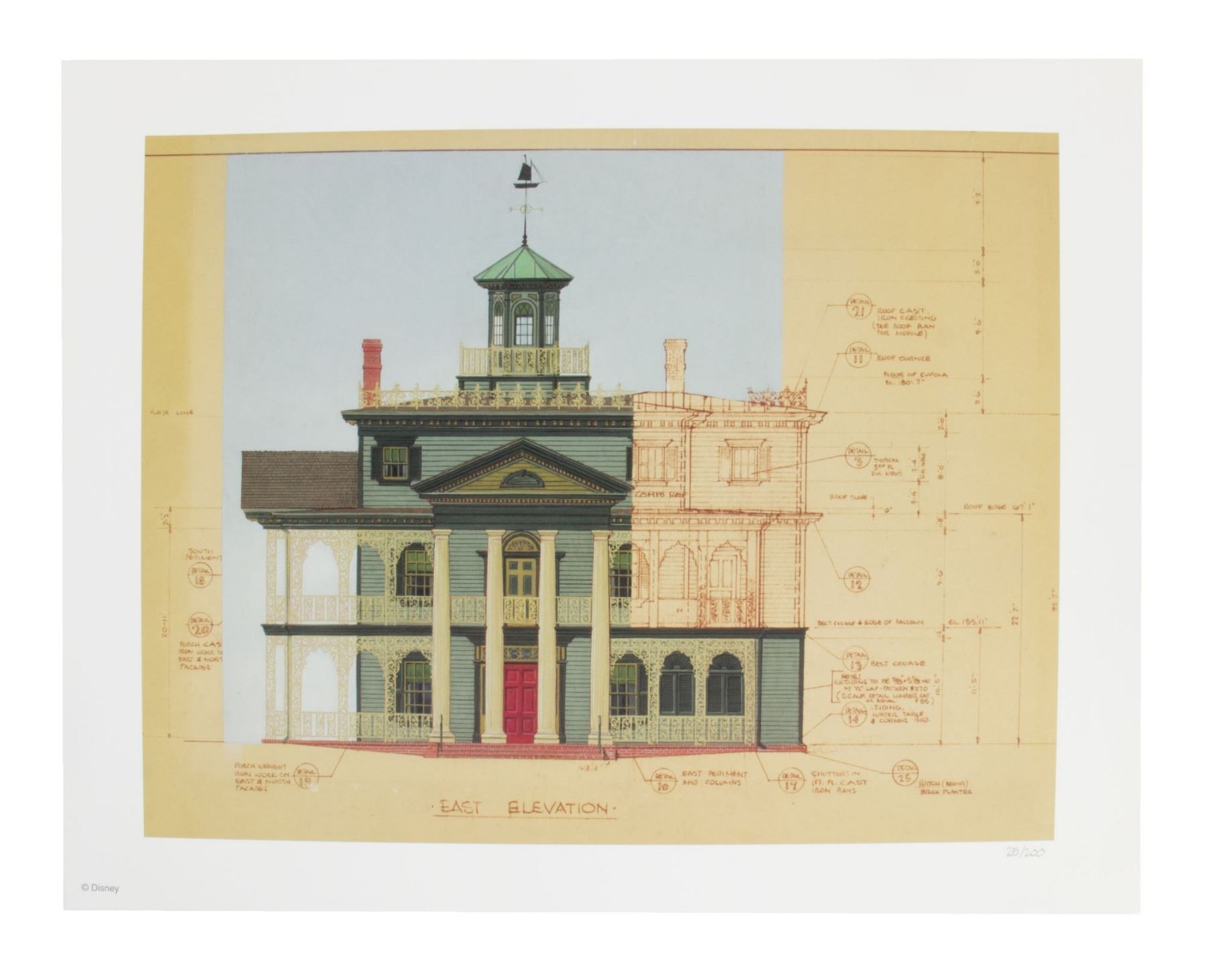 (Disneyland, c.1990s) A limited edition print showing the "East Elevation" blueprint imagery from the construction of the "Haunted Mansion" attraction. The print is hand numbered 25/200 in pencil and has a Disney copyright in the bottom-left corner. Measuring 11"x14", the print is in very good condition.