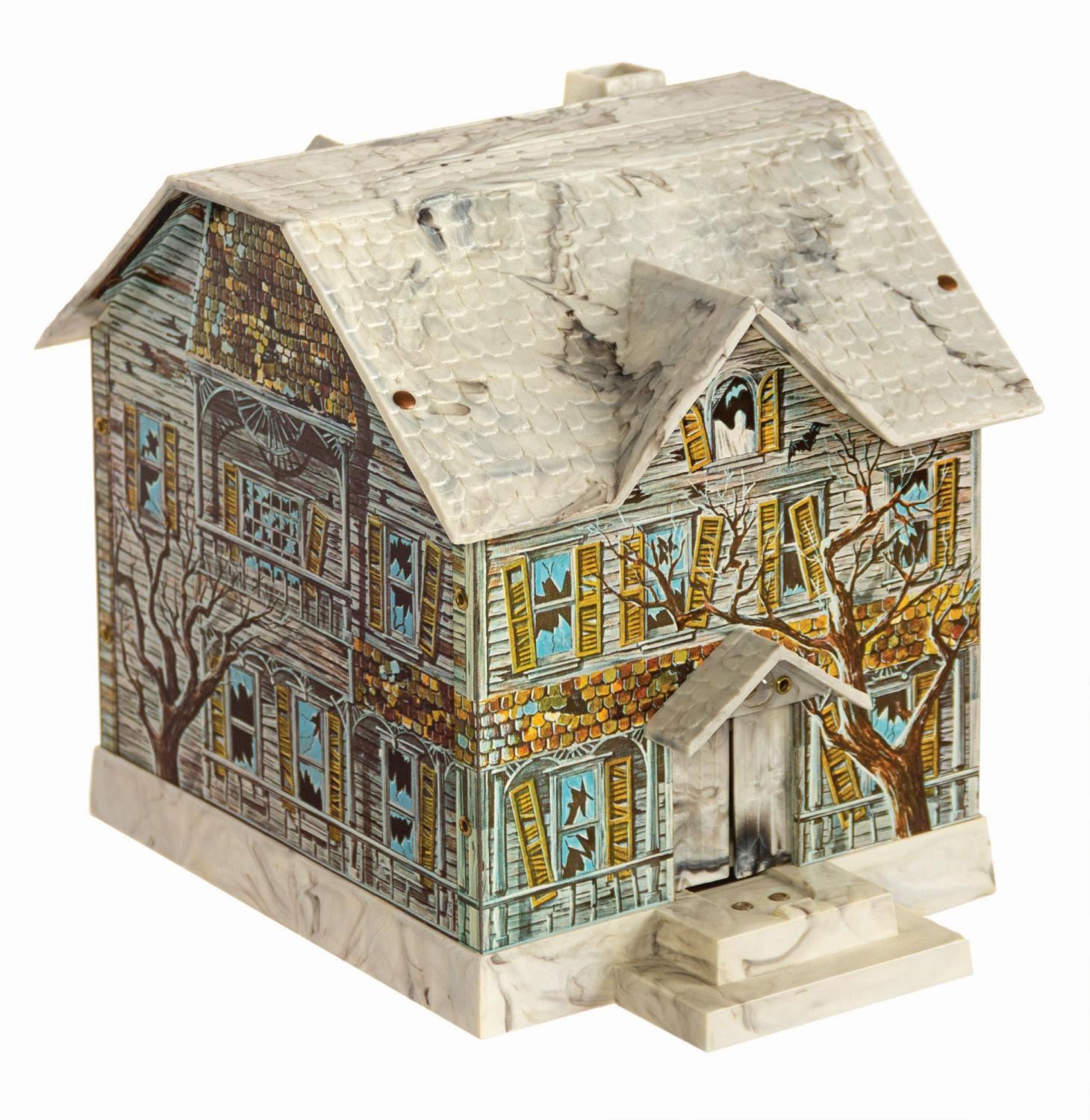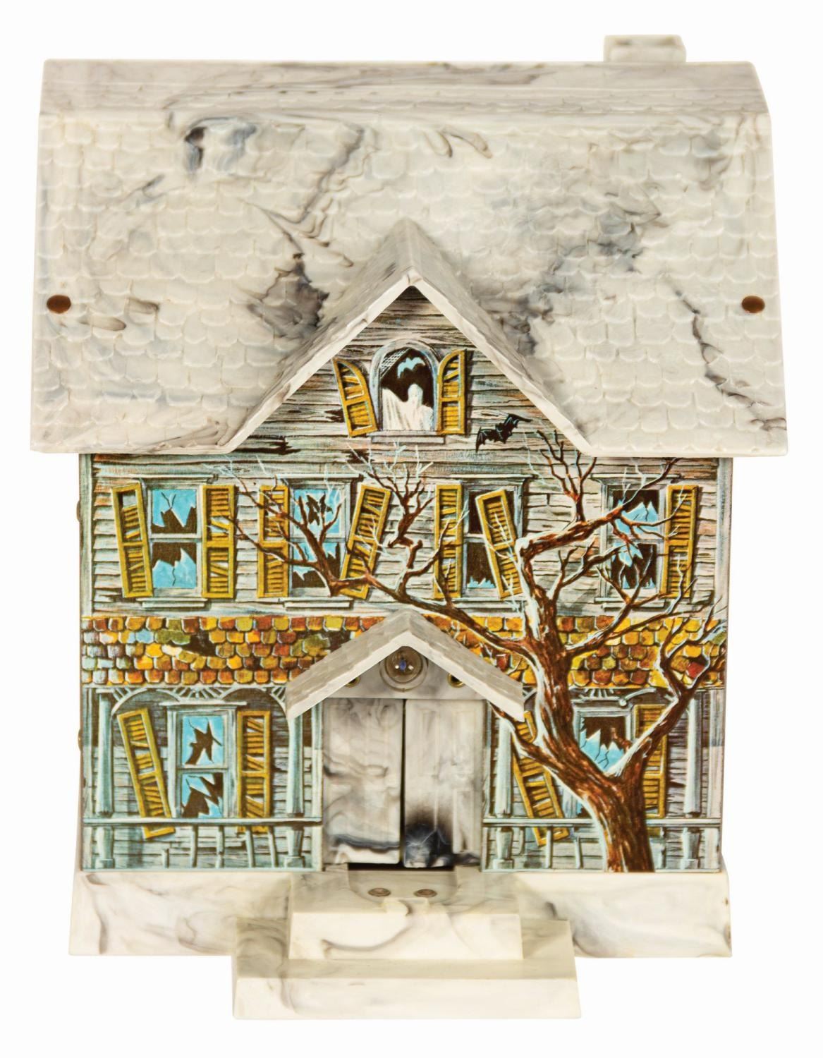 (Disneyland, c.1969) A vintage Haunted Mansion electronic tin lithographic coin bank. These banks were sold at a kiosk outside the Mansion in the 1960s and 70s, even before the attraction opened in August '69. Placing a coin on the front porch creates a circuit that illuminates a light bulb and activates a motorized ghost figure, which slides through the front doors and snatches the coin. All components are in working order. Measuring approximately 7.5"x 7" and 8.75" deep, the bank is in very good condition. The bottom of the piece exhibits minor discoloration to portions of the plastic base, faint oxidation to metal elements, and surface loss to instructional labeling.