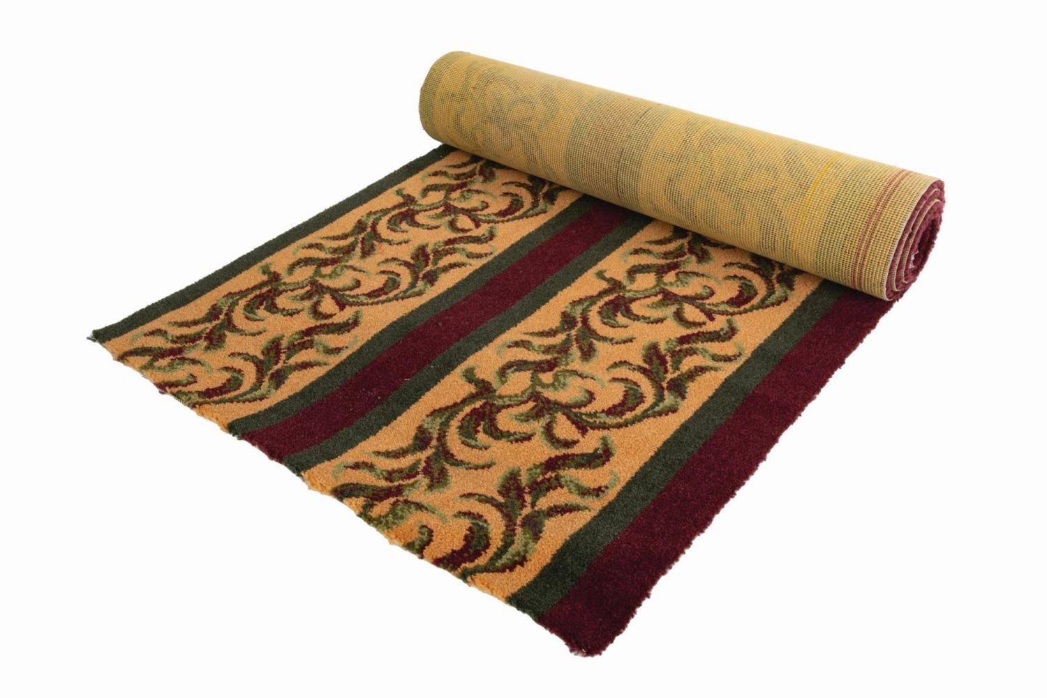 (Disneyland, c.1990s) A length of carpeting of the style used in the entrance way of the Haunted Mansion at Disneyland. Features alternating bands of floral garland on a tan field and hunter green and burgundy stripes. The dark colors and decaying foliage add to the atmosphere of gothic horror created by the totality of the attraction's iconic theming. The length of carpet measures 84"x26.5 and is in very good condition with some wear at the extreme edges and minor toning to the backing, which in no way would affect the appearance of the carpet were it displayed or actually installed.